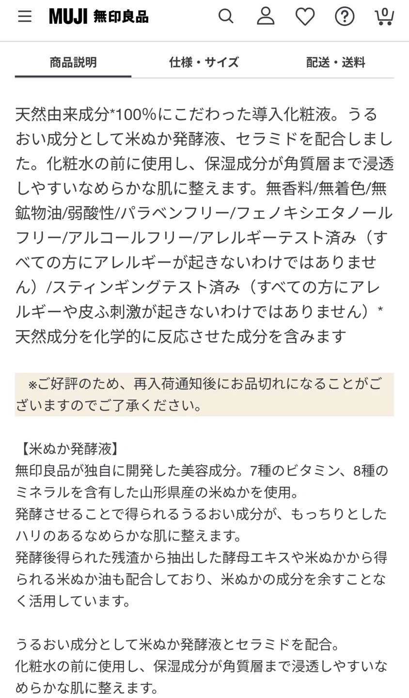 【定価1600円程】無印良品 発酵導入化粧液 300ml 【ほぼ未使用品 1〜2回使用済み】 無印良品 発酵導入化粧液300ml 定価1600円程の商品です、購入したばかりで1〜2回使用しました。 コットンにつけて使用したので直接肌や指は商品には触れていませんが、神経質な方はご遠慮ください。 複数の化粧品を購入し使わなかった為お譲りします、ほぼ未使用品です。 【情報】 ブランド:ムジルシリョウヒン(MUJI 無印良品) 商品:発酵導入化粧液 容量:300ml 商品番号:83451301 【状態】 ほぼ未使用品、1〜2回の使用 両国駅近辺の受け渡しでお願いします。 ご希望の方はプロフィールの確認をお願い致します! ご不明点があればお気軽にお尋ねください🙇♀️