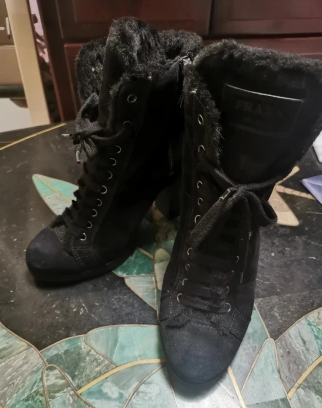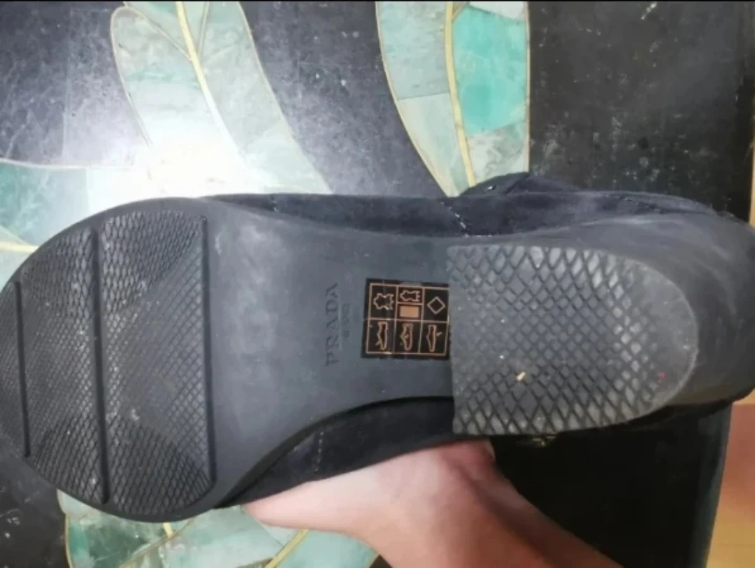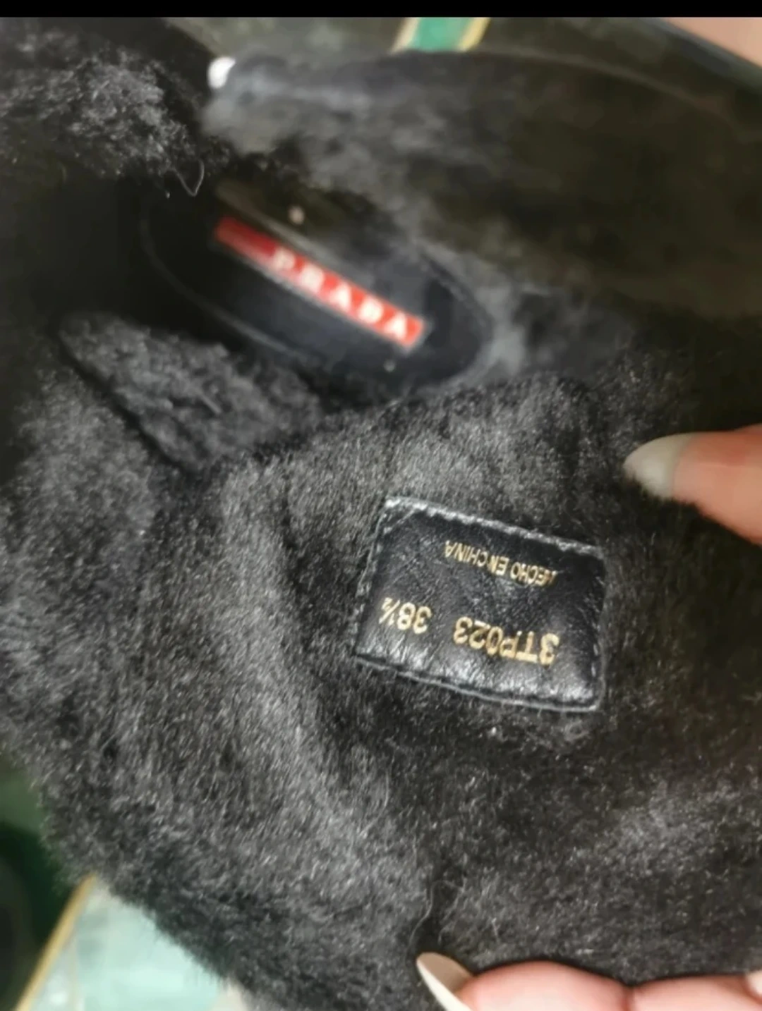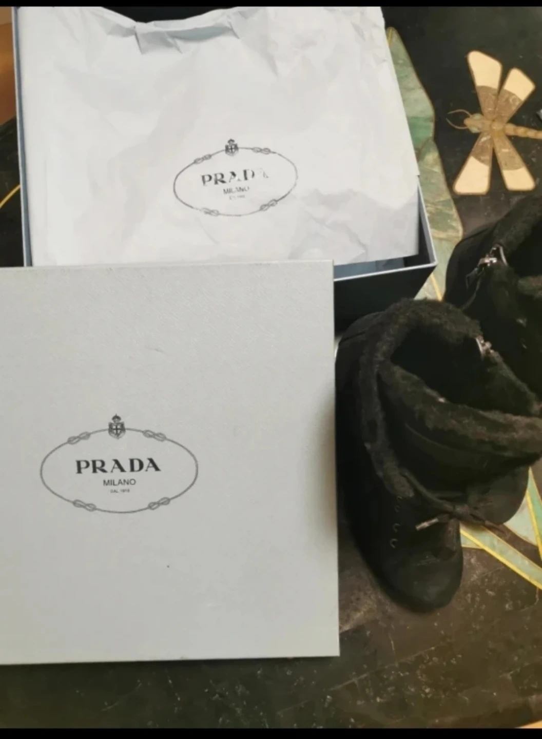 イタリア•トスカーナのPRADAで購入 サイズ感が記載サイズと結構違うと思うので私の感覚ではありますがよく読んでから購入の検討を宜しくお願い致します🙇 【価格】 冬のスーパーセールで60%OFFの573EUROで購入しました 定価は1432€です(25万ちょい) 数回着用してまふ 【環境】 過去に長毛種ペット 大変お安くなっており、少し大きかったのですが購入しました 私の足のサイズが23〜23.5で、イタリアサイズで38ハーフだと25.5になりますが、冬用の靴下着用の試着でそこまで大きく感じませんでした 感覚的には24〜24.5くらいではないかと思うので、25.5の感覚で購入すると小さいと思います 試し履きしてみて、サイズ合わないようなら返品も大丈夫です😊 ※場所指定の手渡しのみ 試し履きの必要のない方は、お互いの丁度いい場所を相談で決めたいと思います 購入時の箱もセットでおつけしますが、箱はボロボロですのでそちらご了承下さい