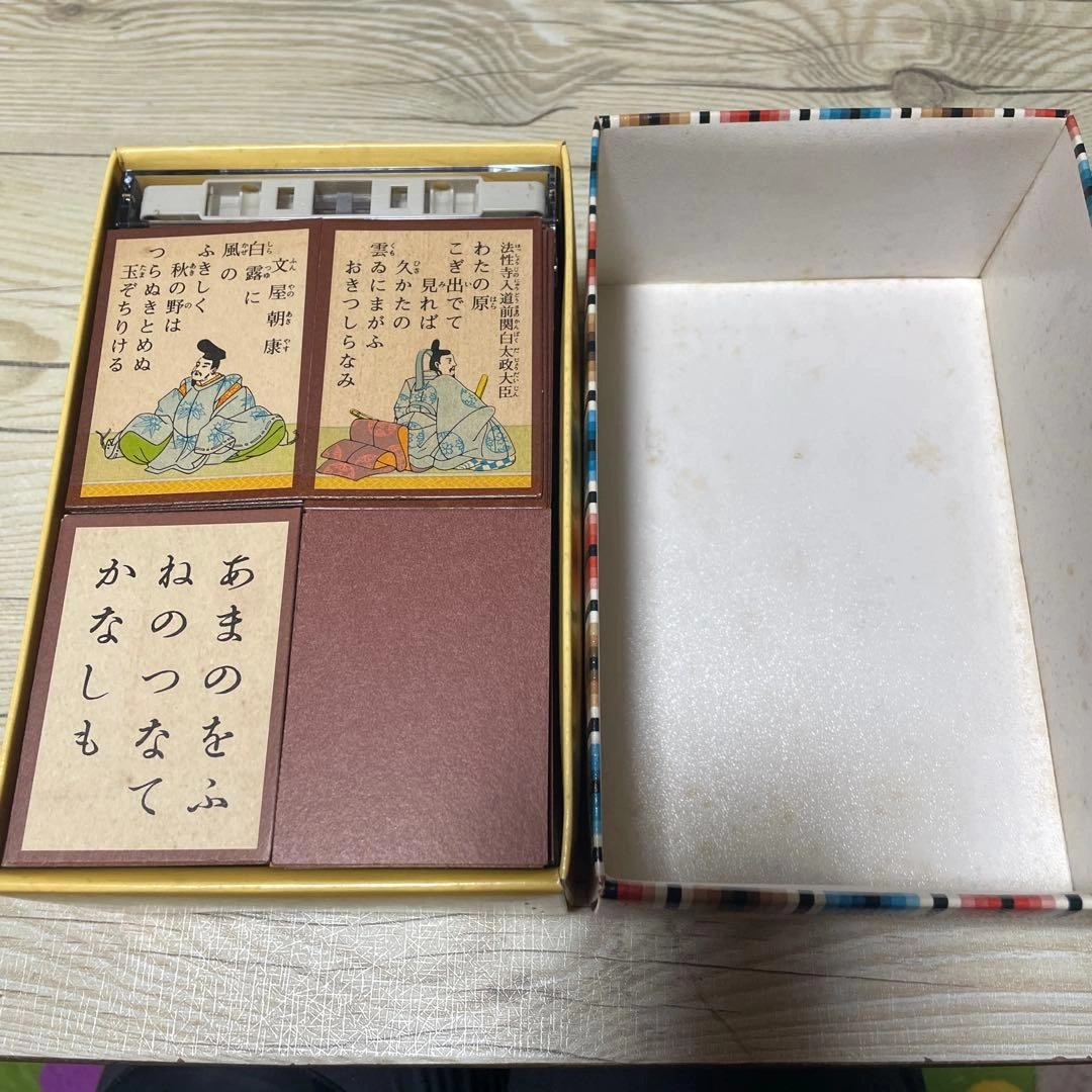 百人一首の札と解説書が含まれたセットです。 タイトル: 小倉百人一首 内容物: 百人一首の札とテープ 長期保管により黄ばみやシミはありますが、大きな破損はありません。 箱なしでも良い方はお値下げ可能です! 中古品・個人管理をご理解の上ご判断下さい。 神経質な方はご遠慮願います。 返品はご遠慮ください。 ご覧いただきありがとうございます。 ご希望の方はお気軽にご連絡ください。