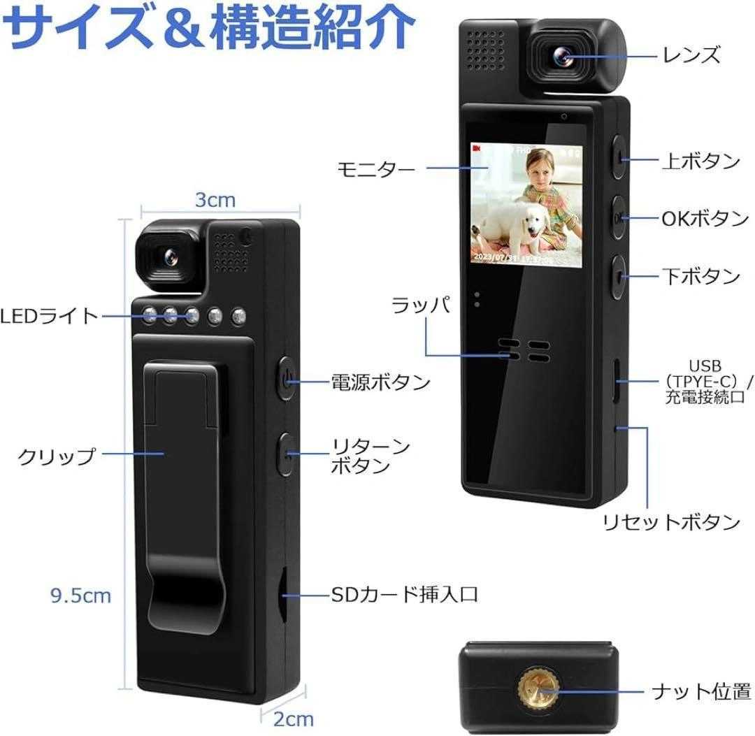 あたたかさ【1.3インチ液晶画面・使用簡単】 ビデオカメラは1.3インチ液晶画面搭載。 録画モード、写真撮影モード、録音モード、再生モード四つのモードを搭載しています。 【180°回転式レンズ】 状況に合わせて調整でき、自転車、バイク、自動車に設置しても使用可能です。 【1080P高画質&充電しなが録画】 解像度1080Pの高画質。内蔵の1200mAhバッテリーは約6時間稼働します。 会議記録、記者会見、ビジネス商談、授業記録、証拠保留、現場撮影などに。 【循環録画】 メモリカードがいっぱいになったら、最新のファイルは以前のファイルを上書きします(256GBのMicro SDカードに対応、SDカードは別売り)。 【動体検知録画】 動体検知機能を搭載。 ご自宅・オフィスの防犯対策にも。 【超強力LEDライト&夜間でも録画可能】 5個LEDライトを備えており、暗い所にも暗視補正録画できます。 【単独録音機能】 動画撮影と静止画撮影だけではなく、録音ペンとして使用できるボディカメラ。 ボイスレコーダーに単独で使用、7時間連続録音可能。 会議記録、ビジネス商談、授業記録などの場合に。 【広く活用&コンパクト&優れた携帯性】 小さくて携帯性に優れ、長時間駆動することができ、大切な瞬間を撮り逃しません。 海外旅行にも、家族行事にも持っていき、思い出をすべて映像に残しましょう。 また、登山、スキー、ロッククライミング、サイクリング、ハイキング、サーフィン、または車載カメラとして、ほとんどどこでも使用することができます。 ご希望の方はお気軽にご連絡ください。