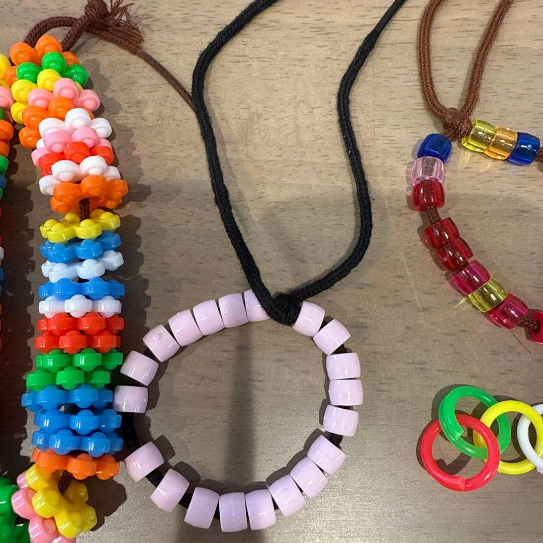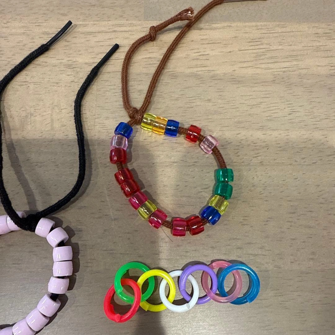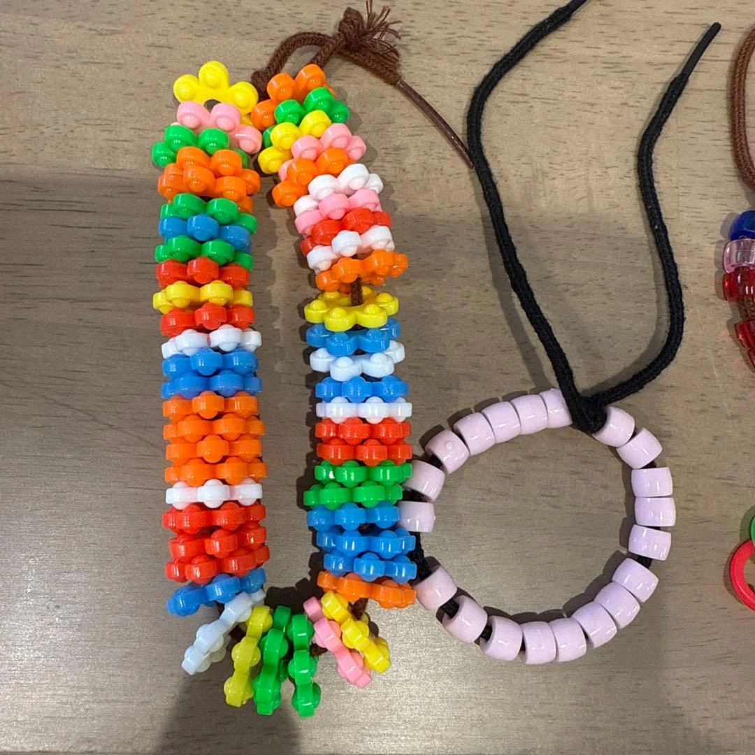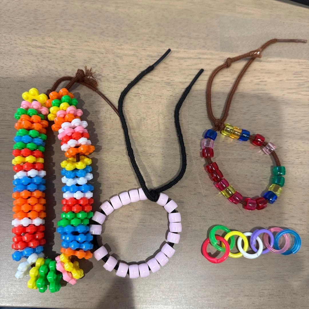 多色のプラスチック製ビーズを使用したハンドメイドブレスレット4点セットです。 - Colorful Bead Bracelets: 多色のビーズブレスレット - Material: プラスチック製 - Design: フラワー型ビーズと円形デザイン - Quantity: 4点セット - Usage: ハンドメイドやアクセサリー作りに最適 ご覧いただきありがとうございます。 ご希望の方はお気軽にご連絡ください。