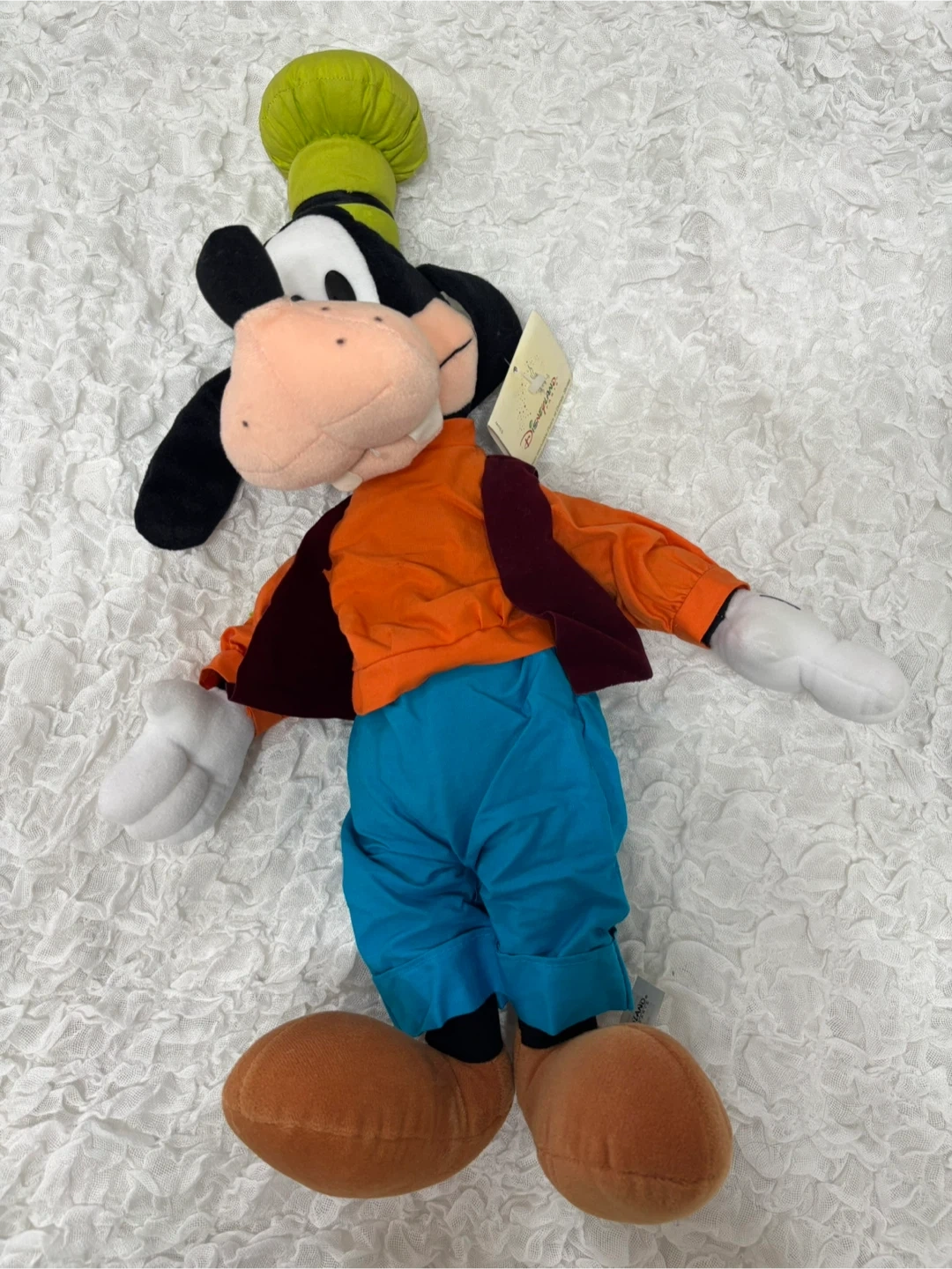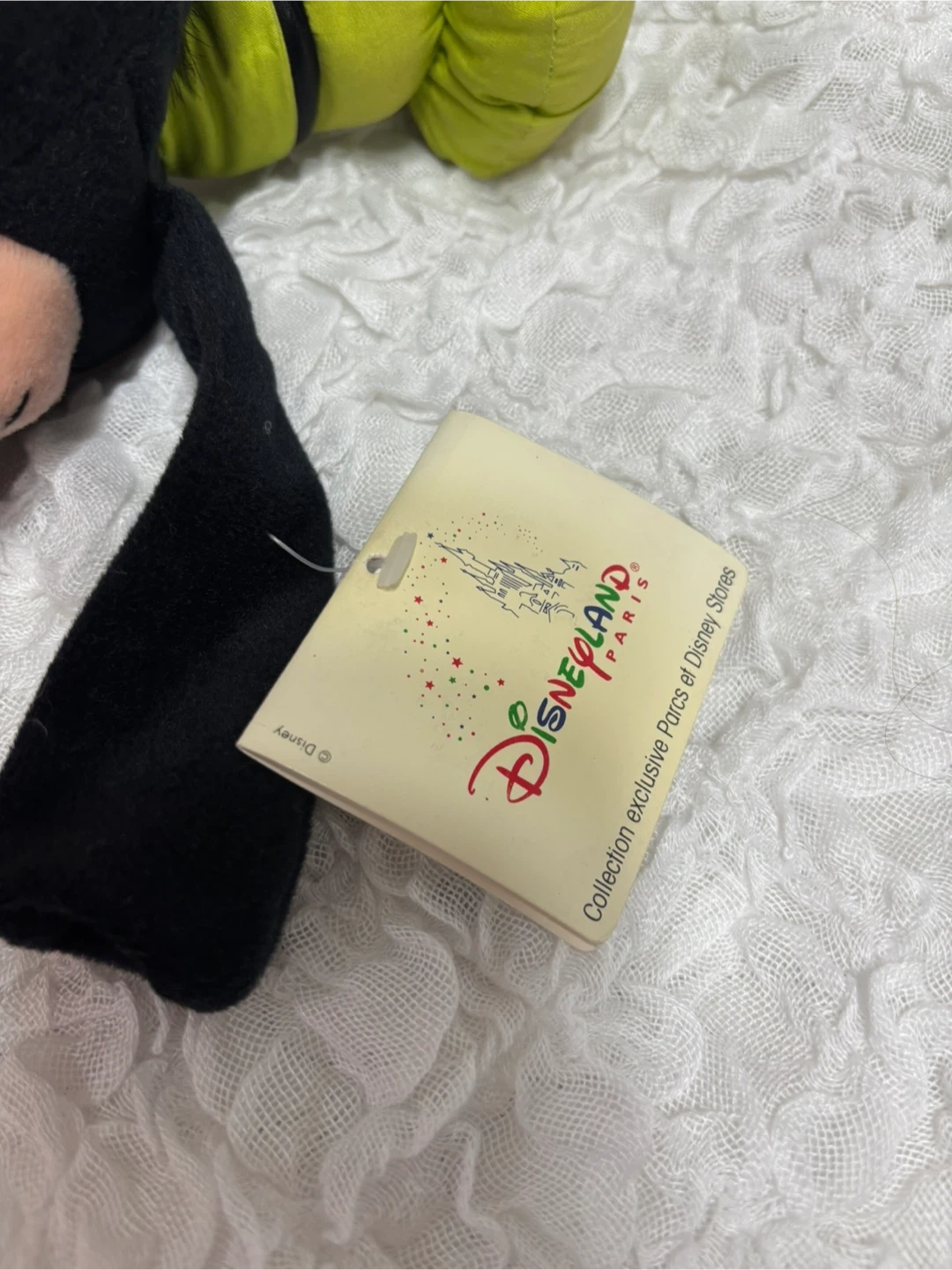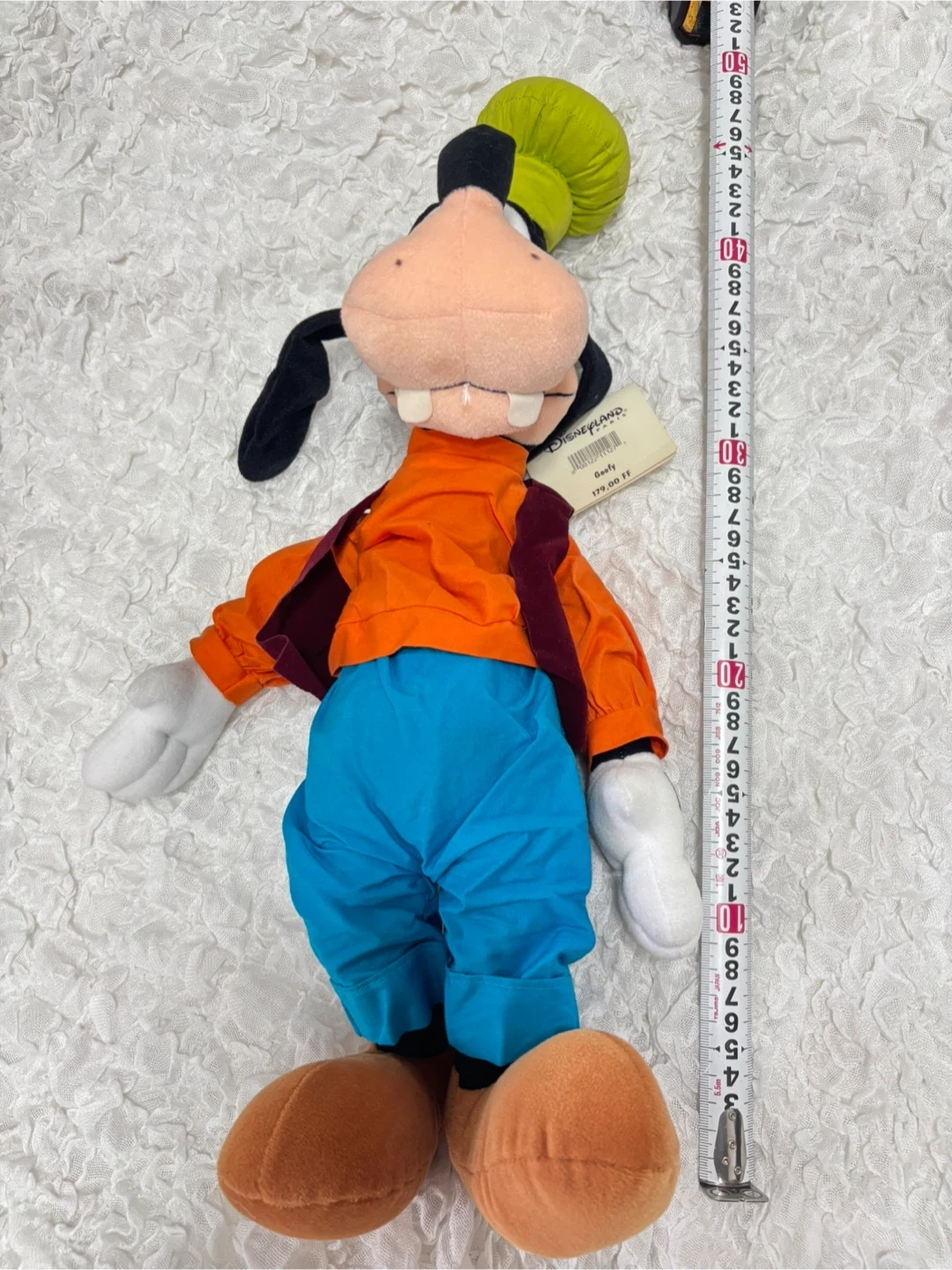 ディズニーランドパリで購入したグーフィーのぬいぐるみです。 長期保管の未使用品で目立つ汚れなどはありませんが、ぬいぐるみの服中央部分に約2mmほど誤って付けてしまったハサミの切り込み跡があるので訳アリとします。