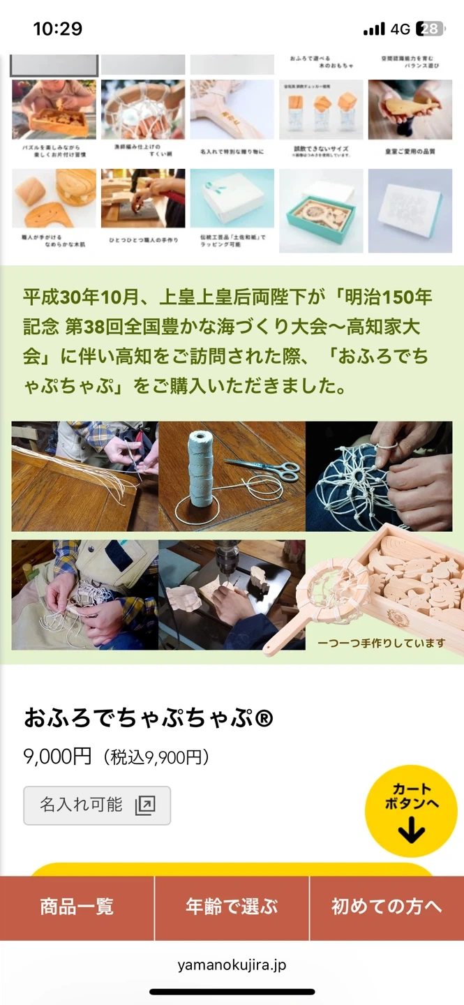 ご覧頂きありがとうございます(^^) 山のくじら舎さんの木(檜木)で作られたお風呂のおもちゃです。 子供と一緒にお風呂で使用している際に、 檜の良い香りがして癒されておりました。 現在でも乾燥した状態で香りがいたします。 上皇上皇后両陛下もご購入されとHPに記載がございます。 ・ブランド:山のくじら舎 ・木製 ・お風呂で遊べるおもちゃ ・使用感は1枚目の写真をご参照下さい 定価: 9,000円(税込9,900円) ご検討頂ければ幸いです。 どうぞよろしくお願いいたします。 中古品であることご了承ください