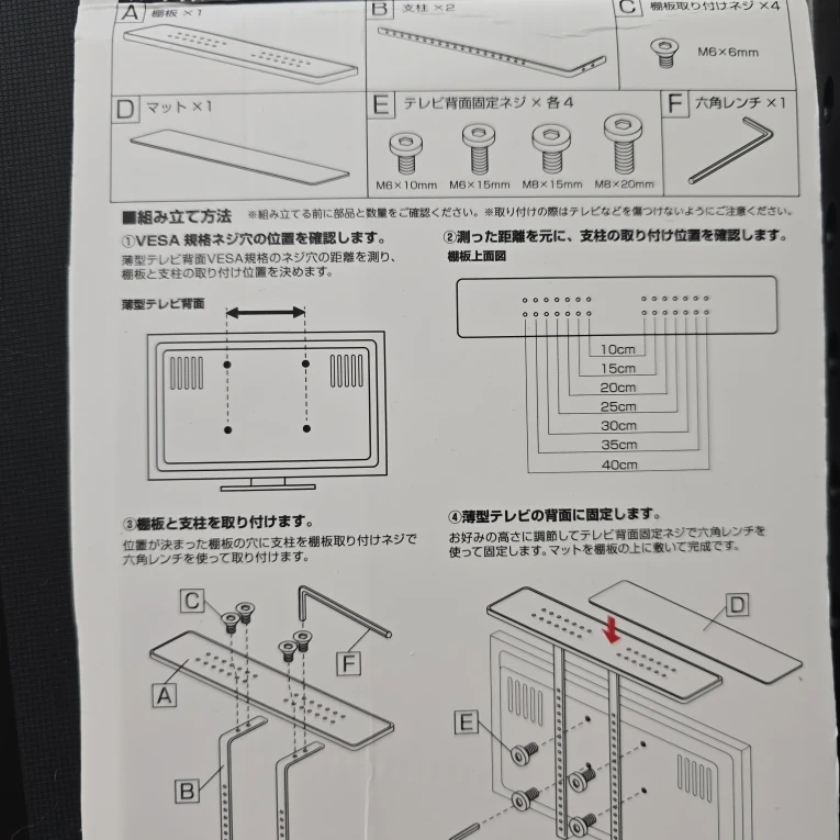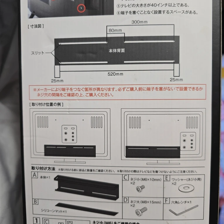 山崎実業 テレビ上・裏収納ラックの2点セットです。 ①裏収納は箱入り、新品未使用です。 ②テレビ上ラックは、取り付けようと開封したため、バラの状態です。箱はありません。 smart(山崎実業) スマート ブラック ①テレビ裏収納ラック 品番4484 ②薄型テレビ上ラック 70cm 品番4271 ①サイズ(約): 幅57×奥行11×高さ12.5cm 重量1.8kg ②サイズ(約): 幅70×奥行13×高さ60cm 重量1.8kg 材質:本体/スチール(粉体塗装) マット/シリコーン 耐荷重(約):3kg 製造国:中国 対応テレビサイズ: 40インチ以上 取り付け方法: 壁掛けテレビ用 状態: 未使用・新品 詳細はメーカーサイトにてご確認ください。 ①商品サイズ:約W57×D11×H12.5cm 重量:約1800g 本体 スチール(粉体塗装) マット シリコーン 付属品:ネジ大(M8)×2 / ネジ小(M6)×2 / ネジ小用ワッシャー×2 / 六角レンチ×1 耐荷重:上段 約1kg / 下段 約500g 内寸:上段 約W56.5×D10.5cm / 下段 約W57×D8×H10.5cm 対応サイズ:テレビ背面(裏面)のネジ穴の横の間隔:100mm以上、400mm以内 ※取り付け位置によって異なります。 取り付け可能なテレビ:VESA規格対応の40インチ以上のテレビに対応 ご希望の方はお気軽にご連絡ください。