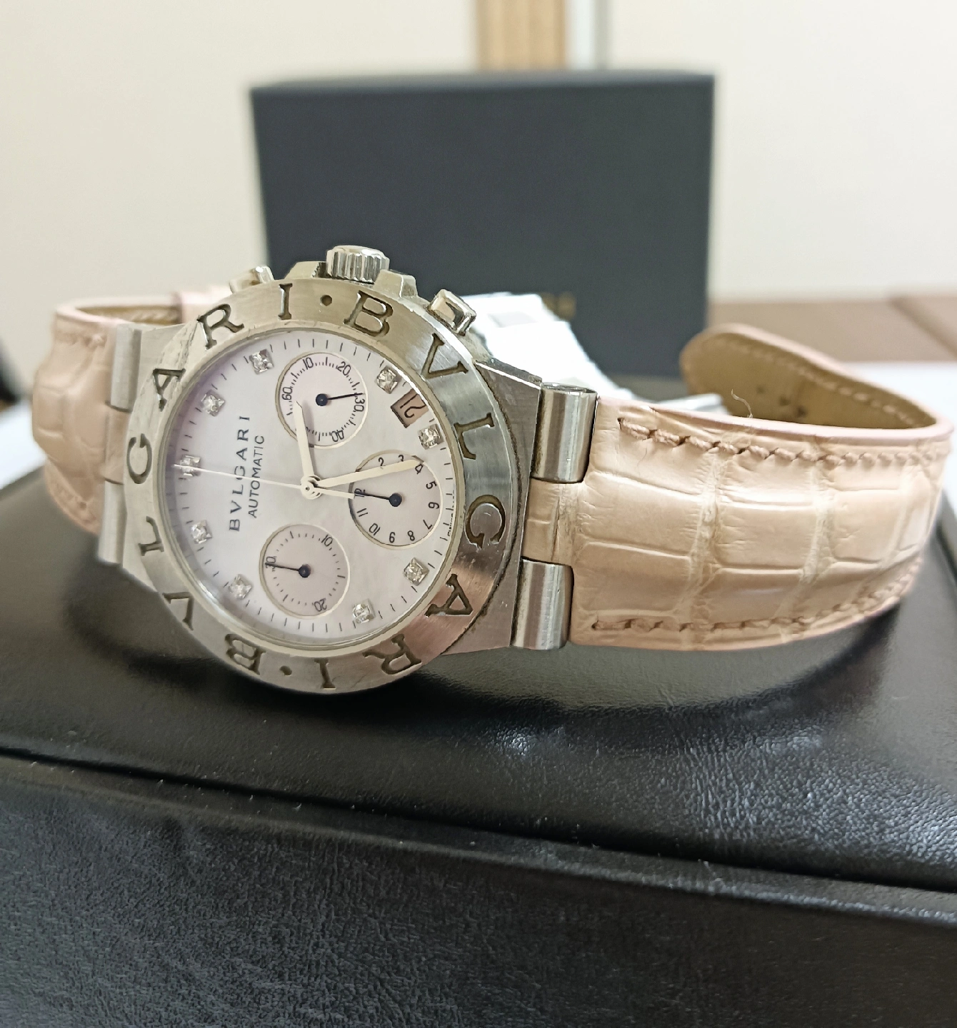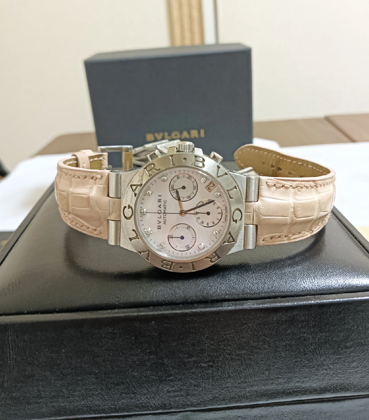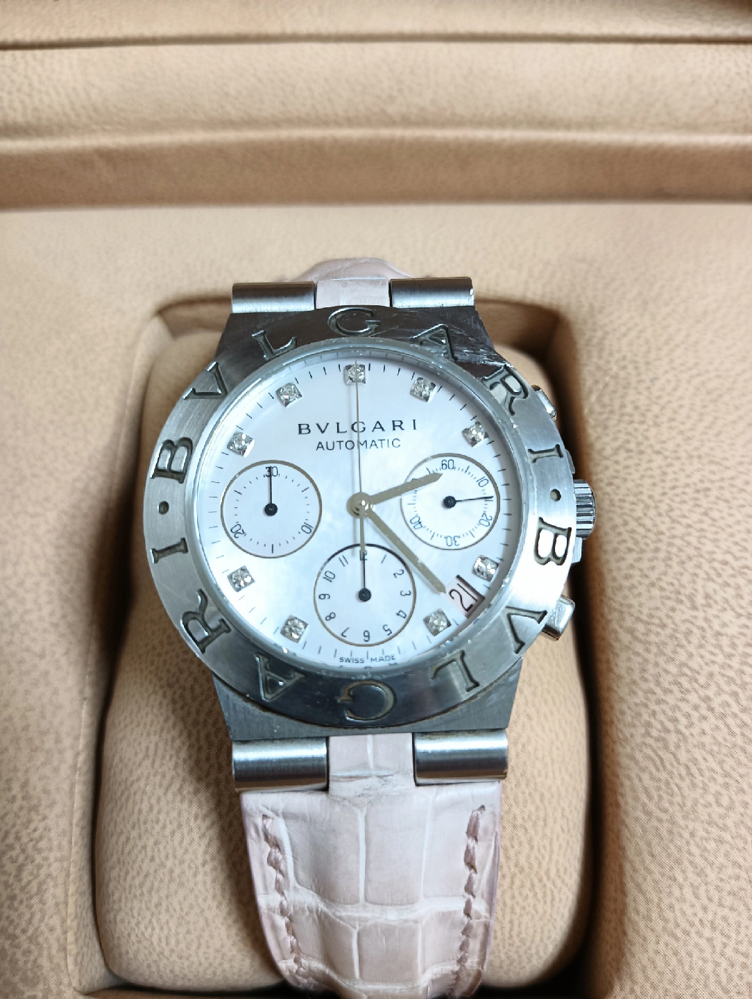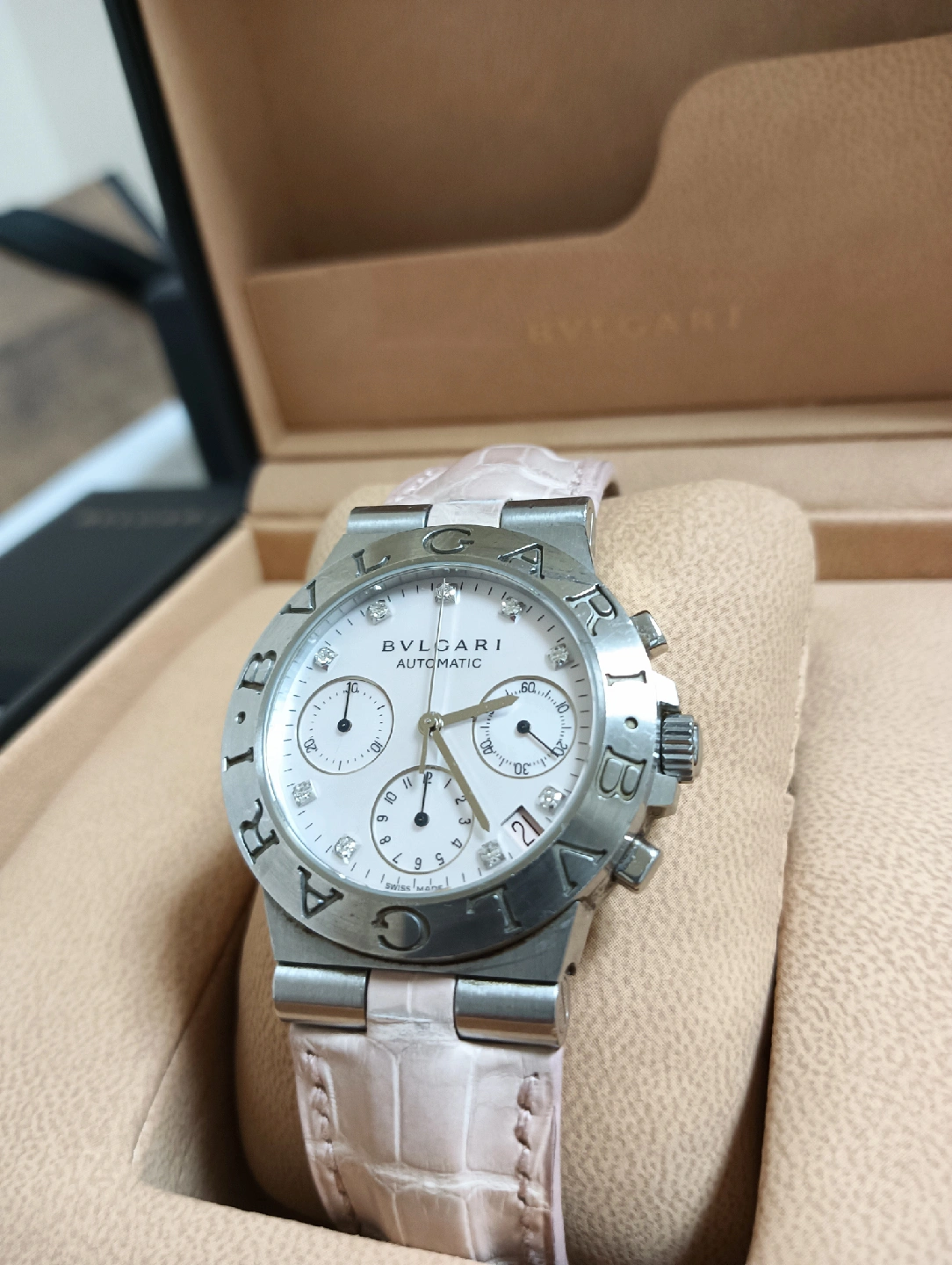 ★★ 希少品。 ピンクシェル文字盤にダイヤモンドインデックスのディアゴノオートマチックは日本では殆ど出回ってません。 ★★ BVLGARI ブルガリ ディアゴノ ダイヤモンドインデックス 自動巻きデイト クロノグラフ 腕時計。 型番 CH35SLD ピンクシェル文字盤 販売価格 約 688,000円 付属品全部付き。 純正の替えステンレスブレス付き 正確作動 日差約 5秒程。 ★★ ディアゴノのオートマチックデイト クロノグラフ ピンクシェル文字盤 ダイヤモンドインデックスの時計です。 ホワイト、ブルーは見掛けますが、 ピンクシェル文字盤は殆ど日本では出回りません ★★ 写真の通り全体的にも綺麗な状態ですが、 ベゼルの5分位置に少しスレ感じます。 ★★ 腕周り 現在約 15〜19㎝ color シルバー&ピンクシェル 購入時の付属品は全部付きます。 正規箱、ケース、国際ギャランティ、冊子、純正のステンレスブレス付き。 ★★