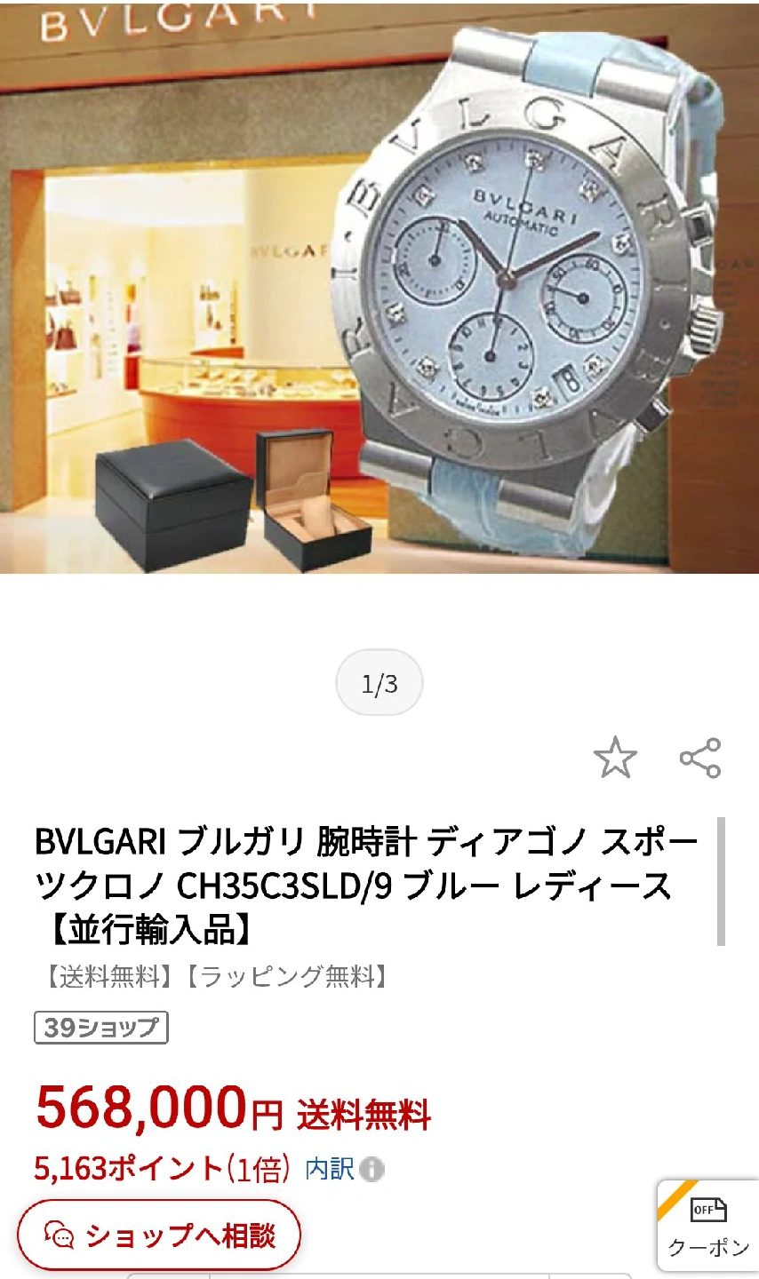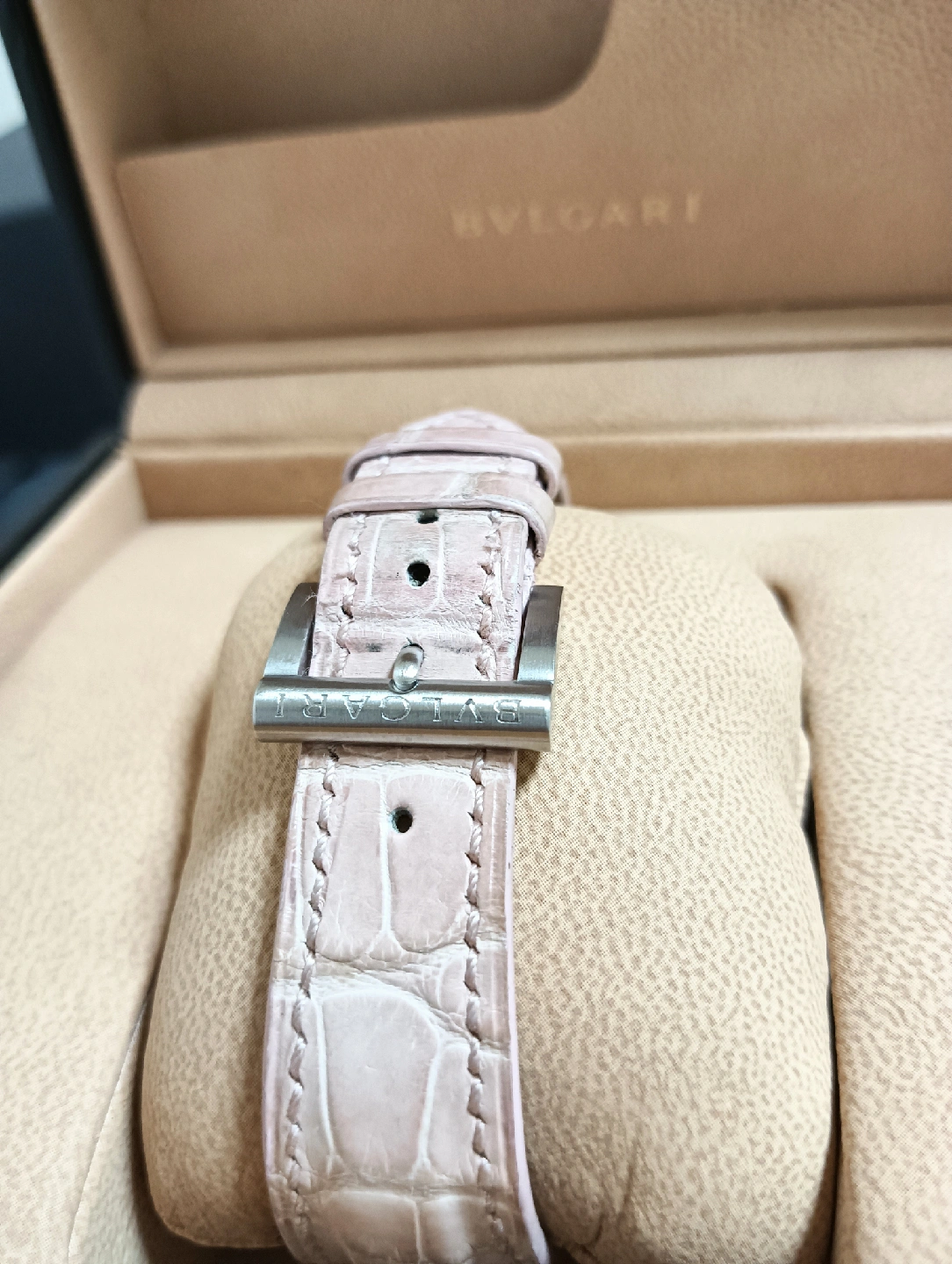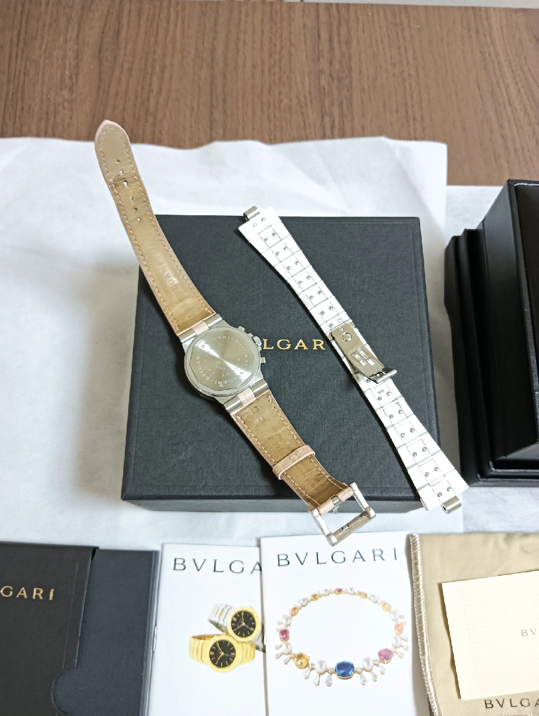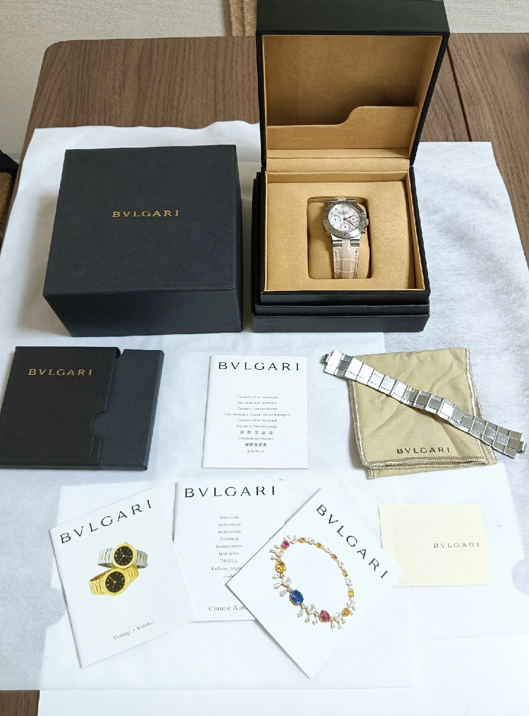★★ 希少品。 ピンクシェル文字盤にダイヤモンドインデックスのディアゴノオートマチックは日本では殆ど出回ってません。 ★★ BVLGARI ブルガリ ディアゴノ ダイヤモンドインデックス 自動巻きデイト クロノグラフ 腕時計。 型番 CH35SLD ピンクシェル文字盤 販売価格 約 688,000円 付属品全部付き。 純正の替えステンレスブレス付き 正確作動 日差約 5秒程。 ★★ ディアゴノのオートマチックデイト クロノグラフ ピンクシェル文字盤 ダイヤモンドインデックスの時計です。 ホワイト、ブルーは見掛けますが、 ピンクシェル文字盤は殆ど日本では出回りません ★★ 写真の通り全体的にも綺麗な状態ですが、 ベゼルの5分位置に少しスレ感じます。 ★★ 腕周り 現在約 15〜19㎝ color シルバー&ピンクシェル 購入時の付属品は全部付きます。 正規箱、ケース、国際ギャランティ、冊子、純正のステンレスブレス付き。 ★★