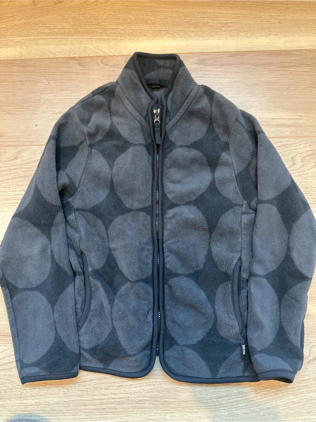 あたたかさフリースジャケットです。 ・色:グレーに黒のドット柄 ・使用感:あり 中古品であることをご了承ください。
