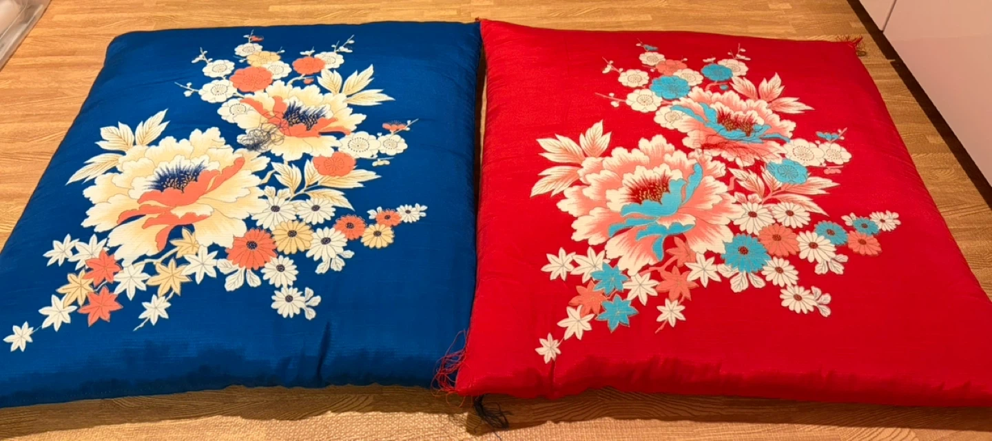 座布団2枚セットです。 ・色:青、赤 ・花柄のデザイン ・サイズ約60cm×60cmぐらいです 傷や汚れはないです。 自宅保管していただけで使用していません。 バラ売りはしません。 カバーは希望があればお渡しします。無印良品のカバーです。色が褪せているので。 受け渡し場所 北綾瀬駅、亀有駅