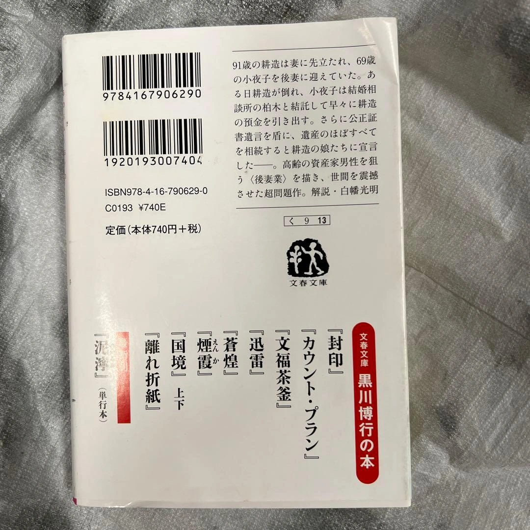黒川博行さんの「後妻業」です。 汚れ、傷みがありますが、読むには問題ないかと思います。 ご希望の方はお気軽にご連絡ください。