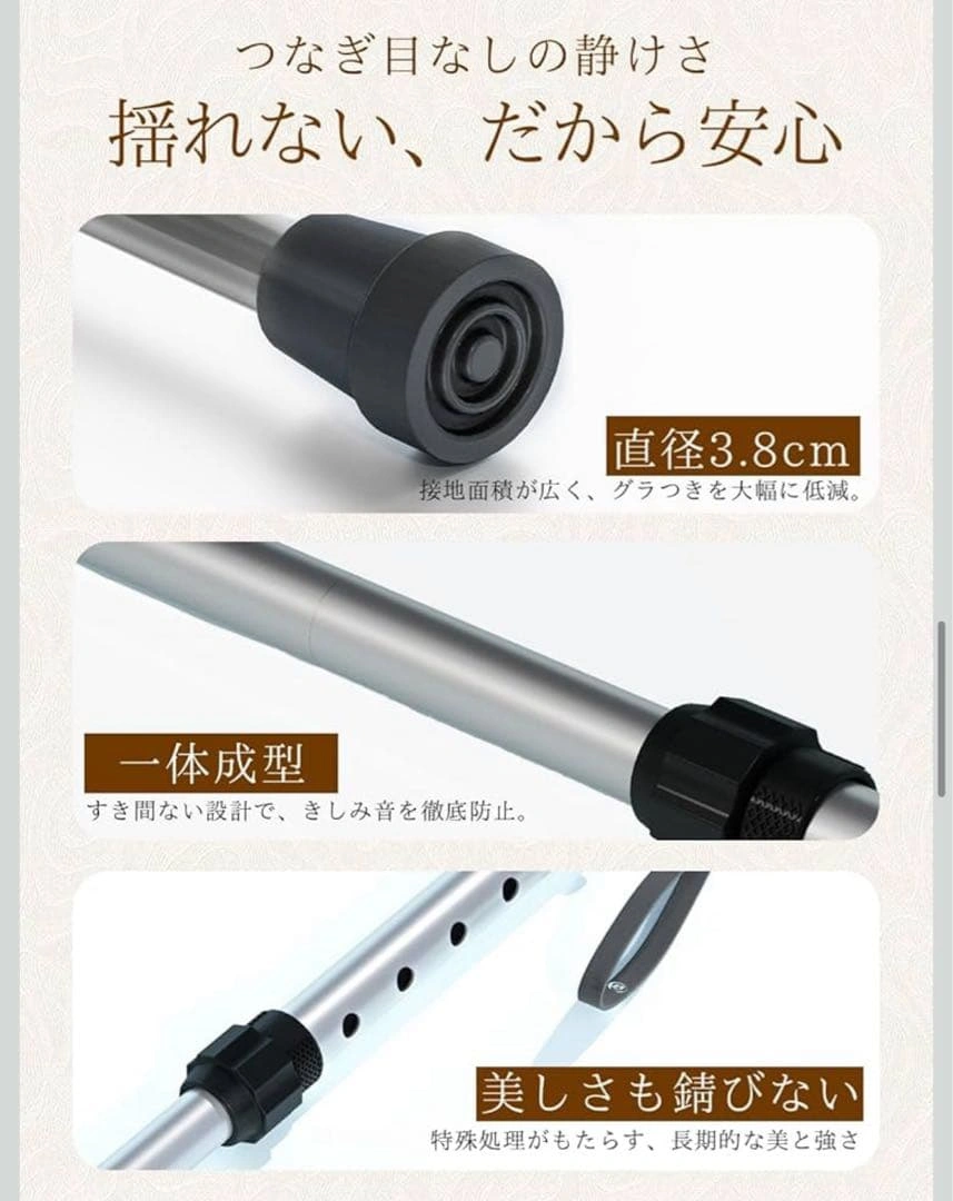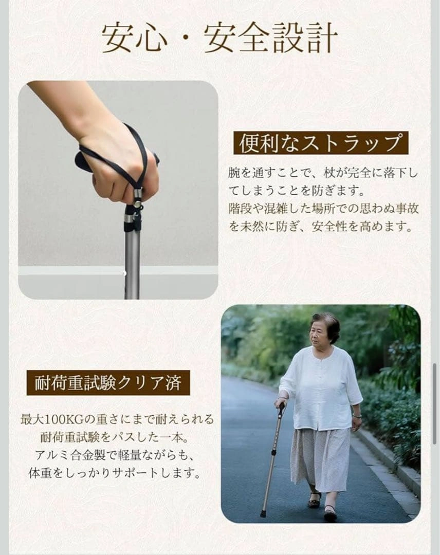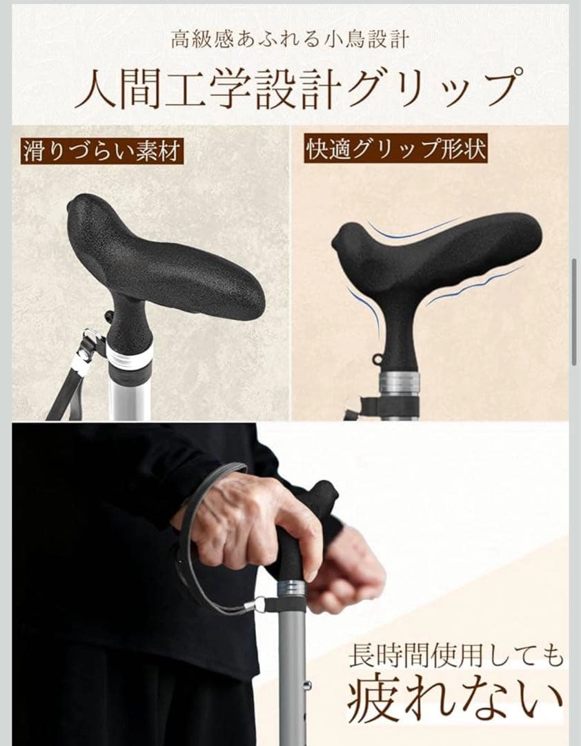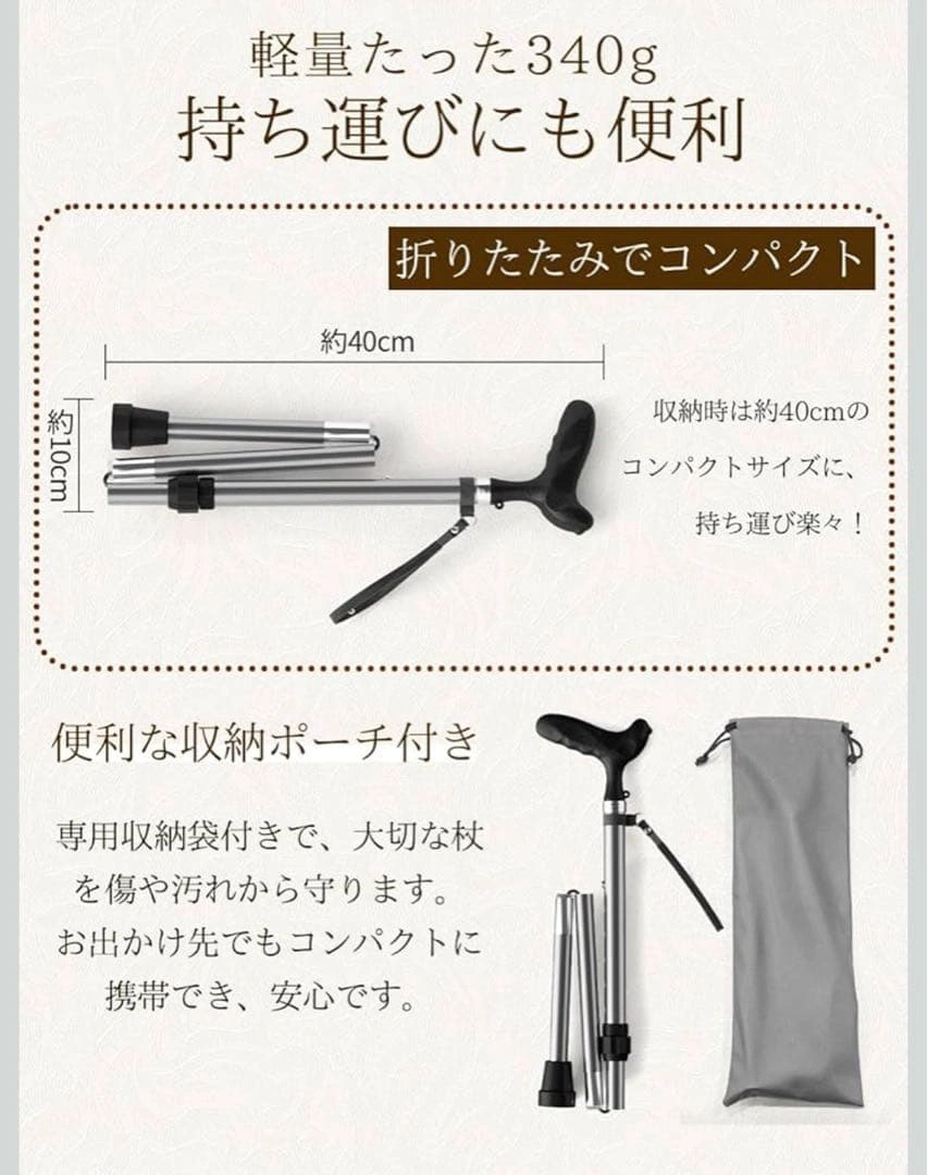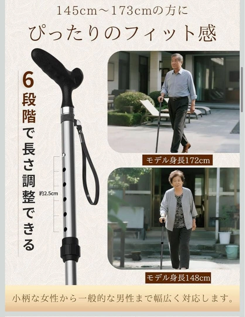 ご覧いただきありがとうございます。 使いやすさと信頼性を追求した折りたたみ杖です。ユーザーの使用感を重視して設計されており、安全性と快適さを両立しています。高齢者やリハビリ中の方、日常の歩行サポートが必要な方に適しています。 高品質な素材を使用し、耐久性と安定性に優れています。75cmから88cmの間で6段階の高さ調節が可能です。身長145cmから173cmまで対応。コンパクトに折り畳めるため、持ち運びにも便利です。収納袋付き。 アルミ合金と耐摩耗性ゴムを使用しており、長期間の使用に耐える品質です。ご希望の方はお気軽にご連絡ください。