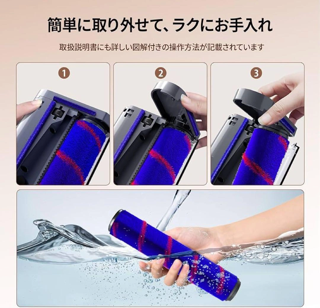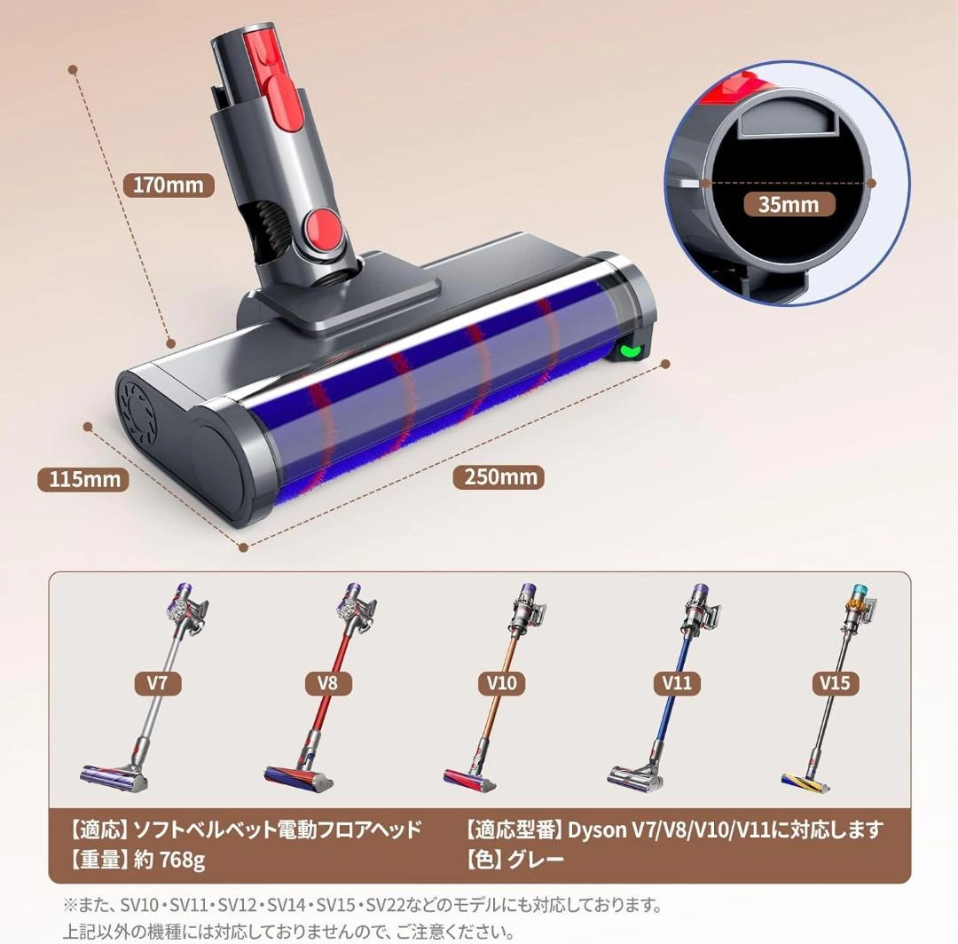 あたたかさDyson V7・V8・V10・V11・V15・SV10・SV11・SV12・SV14・SV15・SV22まで幅広く対応。 差し込むだけで簡単に取り付け可能です(変換アダプター不要)。 ※お使いの掃除機のモデルをご確認ください。 アタッチメントブラシは、ソフトローラーブラシとVブラシの2種類があります。 ソフトローラーブラシはフローリングに、Vブラシはカーペットや毛布に適しています。 ホコリや汚れを素早く取り除けます。 特殊なグリーンLEDサイドライト搭載。ホコリやゴミが見えやすくなります。 ブラシの構造が吸引力を最大限に活かし、髪の毛やペットの毛、微細なホコリまで強力吸引。 工具なしでワンタッチ装着・取り外しが可能。 使用後はヘッド部分を水洗いするだけ。 ご希望の方はお気軽にご連絡ください。