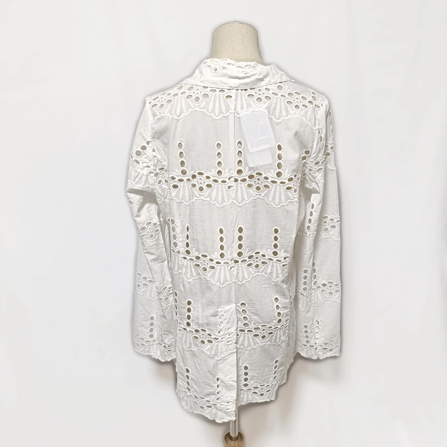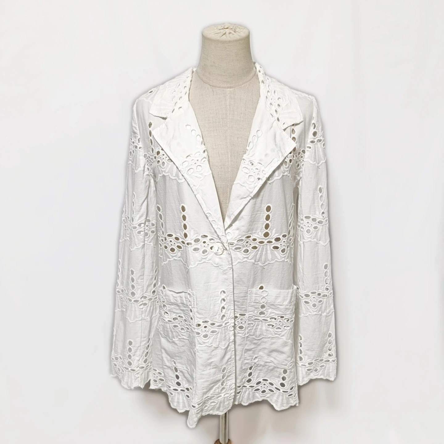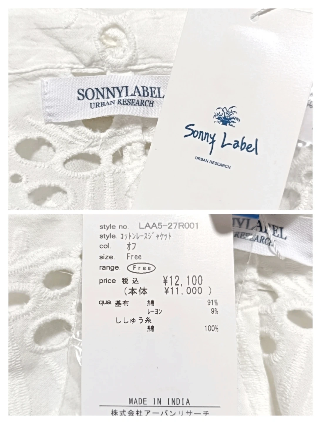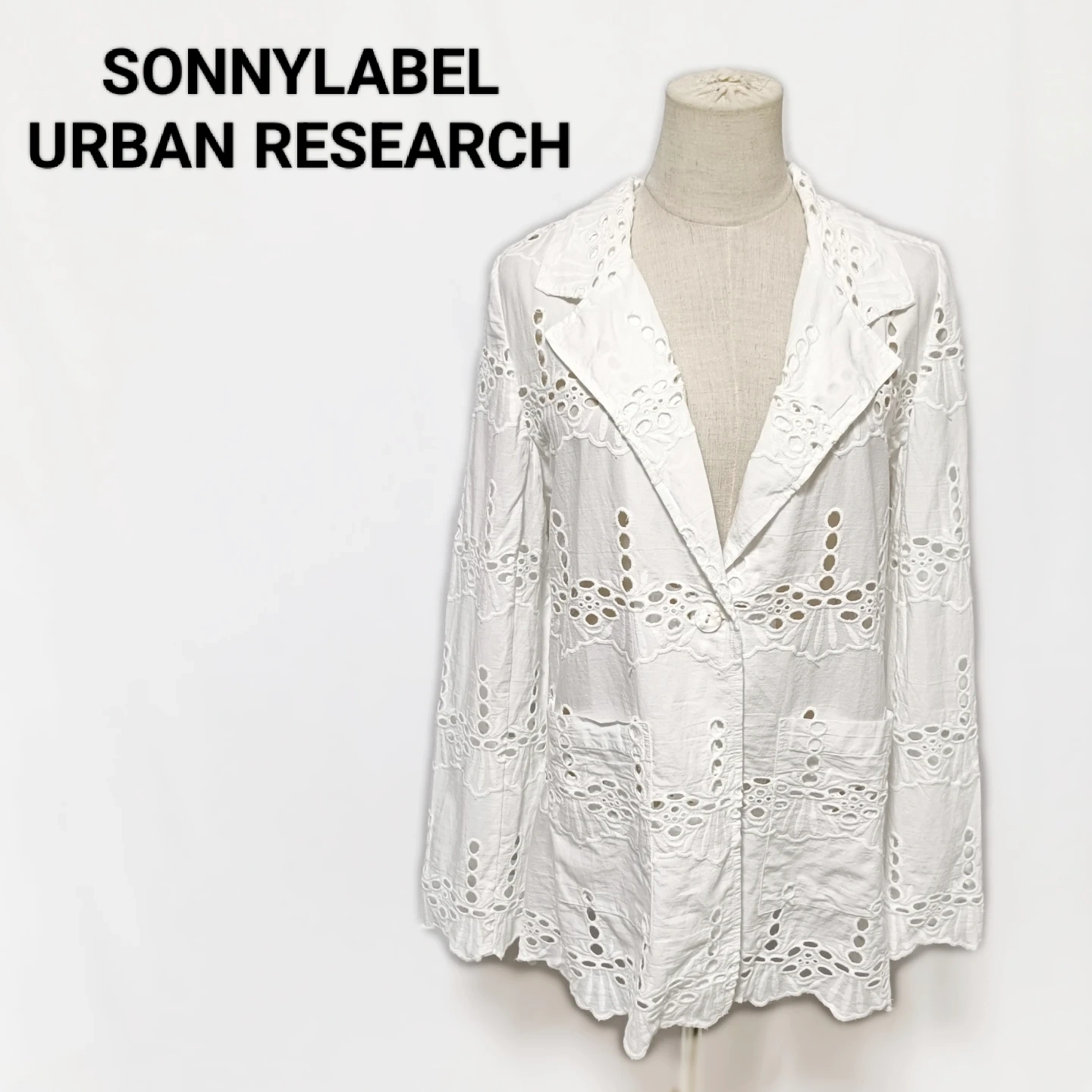 ご覧いただきありがとうございます! URBAN RESEARCH Sonny Label(サニーレーベル)の素敵なコットンレースジャケットです。 全面に施された華やかな**シフリー刺繍(コットンレース)**が、軽やかで上品な印象を与えてくれます。 Fサイズ(フリーサイズ)で、リラックス感がありながらも、レースの透け感が女性らしい抜け感を演出します。 □商品名□ 新品タグ付 サニーレーベル 綿麻 コットンレースジャケット 白 Fサイズ □ブランド□ SONNYLABEL URBAN RESEARCH アーバンリサーチサニーレーベル □表記サイズ□ F (フリーサイズ) □実寸サイズ(cm) □ 着丈:72 肩幅:38 身幅:50 袖丈:62 ※実寸につきまして多少の誤差はご了承ください。 ※表記サイズだけではなく実寸のサイズをご確認ください。 □カラー□ ホワイト □素材□ 基布:綿 91% レーヨン 9% 刺繍糸:綿 100% □コンディション□ タグ付き、未使用品です。 目立った汚れやダメージなど特にございません。 ※汚れはできる限り写真にて掲載しております。まずは画像をご確認ください。 どうぞよろしくお願い致します。 □商品管理番号□ T1-W-5614