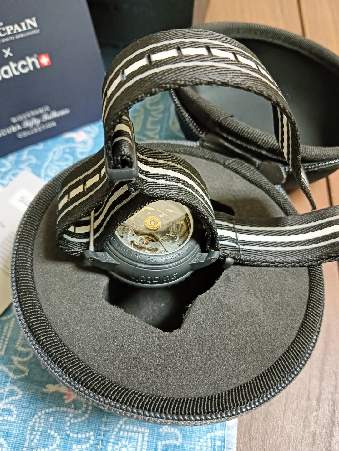 ★★ BLANCPAIN ブランパン×Swatch BIOCERAMIC SCUBA FIFTY FATHOMS COLLECTION オートマチック 自動巻き ダイバー 裏スケルトン 腕時計。 型番 S035B400 正確作動 日差±10秒程 2024年3月購入  ★★ 世界最高峰的なブランドBLANCPAINが、 時計界の話題を一気にさらった感じで発売された腕時計ですね。 こちらは未使用でコレクション保管品めすが、未使用近いのカテゴリーとします。 購入時の付属品全部付き 正規箱、ケース ギャランティ保証書、冊子付き。 ★★ - ブランド: Blancpain x Swatch - モデル名: Scuba Fifty Fathoms - カラー: ブラック - 付属品: ボックス - 素材: バイオセラミック - ストラップ: ストライプデザインのナイロンストラップ
