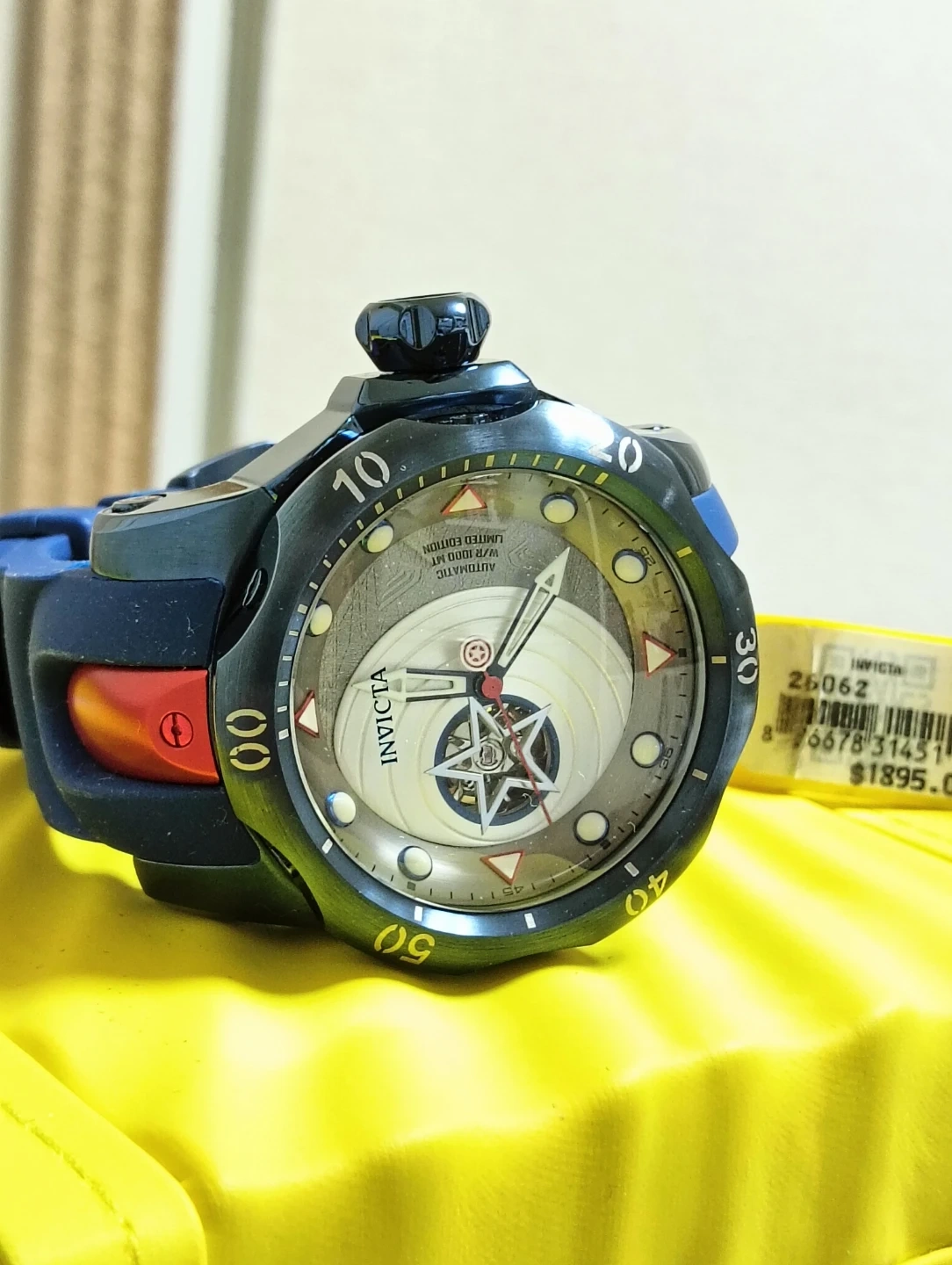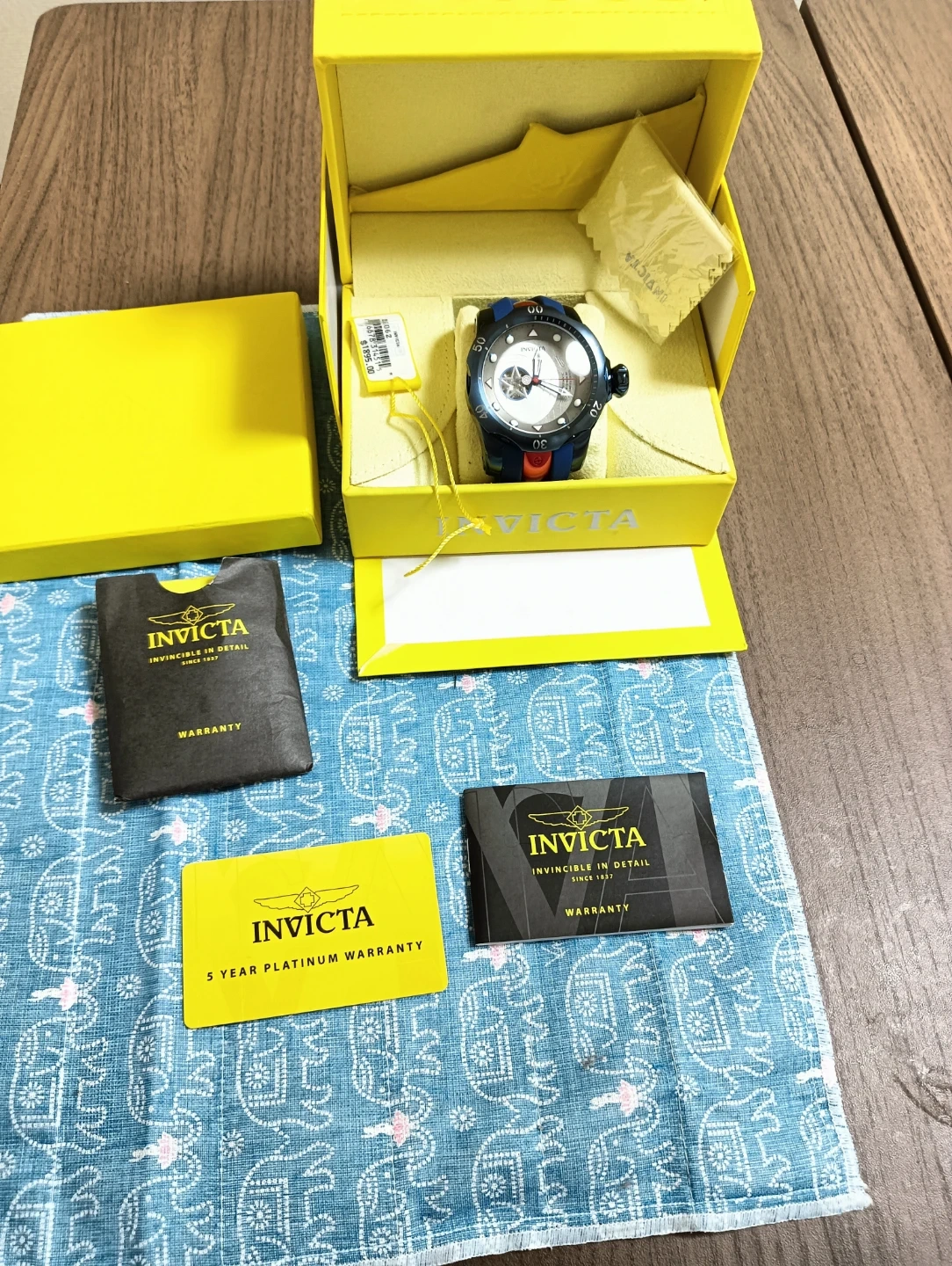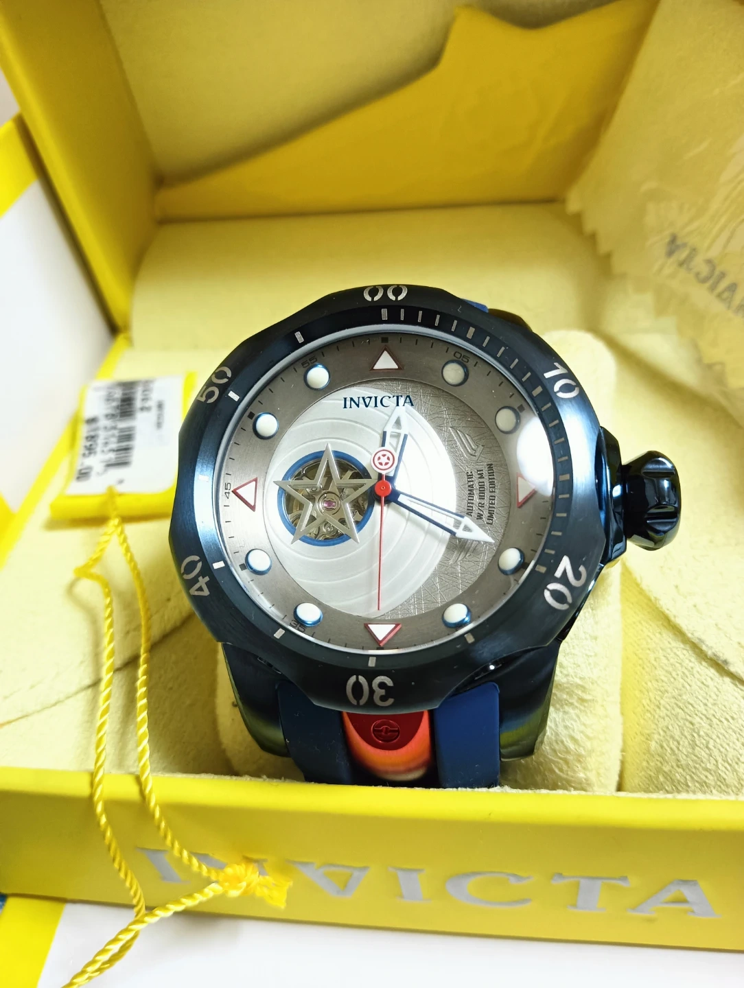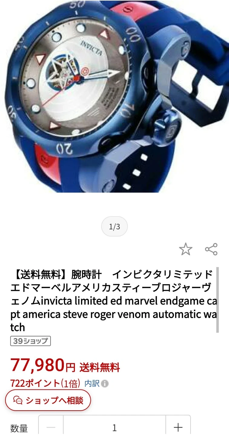 ★★ INVICTA インビクタ マー ベラス キャプテンアメリカ スディープロジャー ベノム 自動巻き オープンハート 裏スケルトン 腕時計 購入価格約 75.000円 正確作動 日差±約10秒 購入時の付属品全部付き。 ★★ インビクタの限定品の時計ですね。 本格的な自動巻き裏スケルトンの キャプテンアメリカシリーズです。 ★★ こちらも新品同様未使用品の為、当然非常に綺麗な状態です。 腕周り フリー color シルバー&ブルー 購入時の付属品全部付き。 正規箱、ケース、ギャランティ、冊子、クロス、購入時のタグ付き。 ★★ 52mmのスケルトンダイヤルを持つINVICTAの自動巻き時計、キャプテンアメリカモデル。 - ブランド: INVICTA - モデル名: 52mm Marvel Captain America Steve Rogers Venom Automatic Watch - 色: 青/赤 - 特徴: 自動巻き, スケルトンダイヤル - 付属品: 保証書, 箱, クリーニングクロス