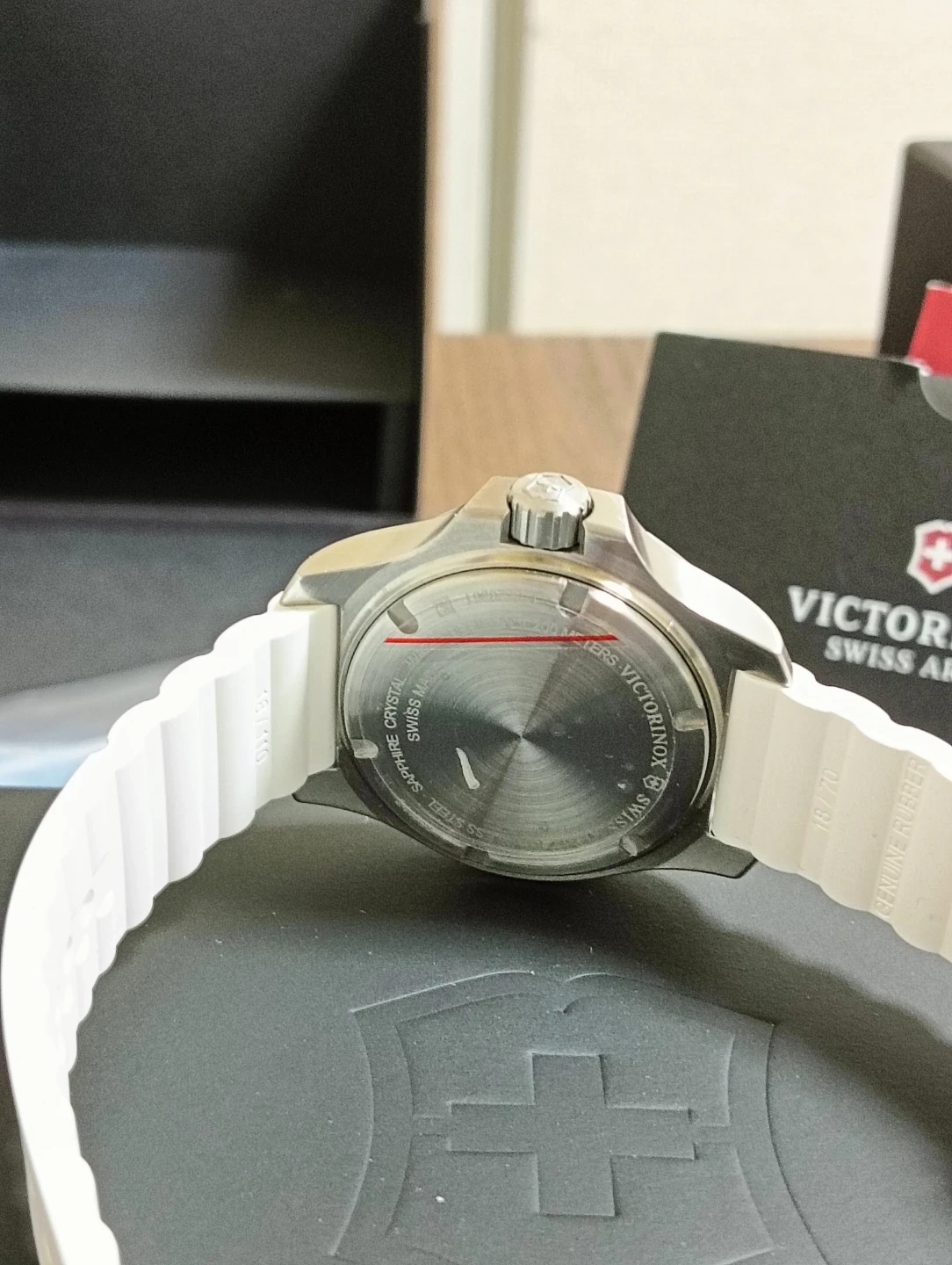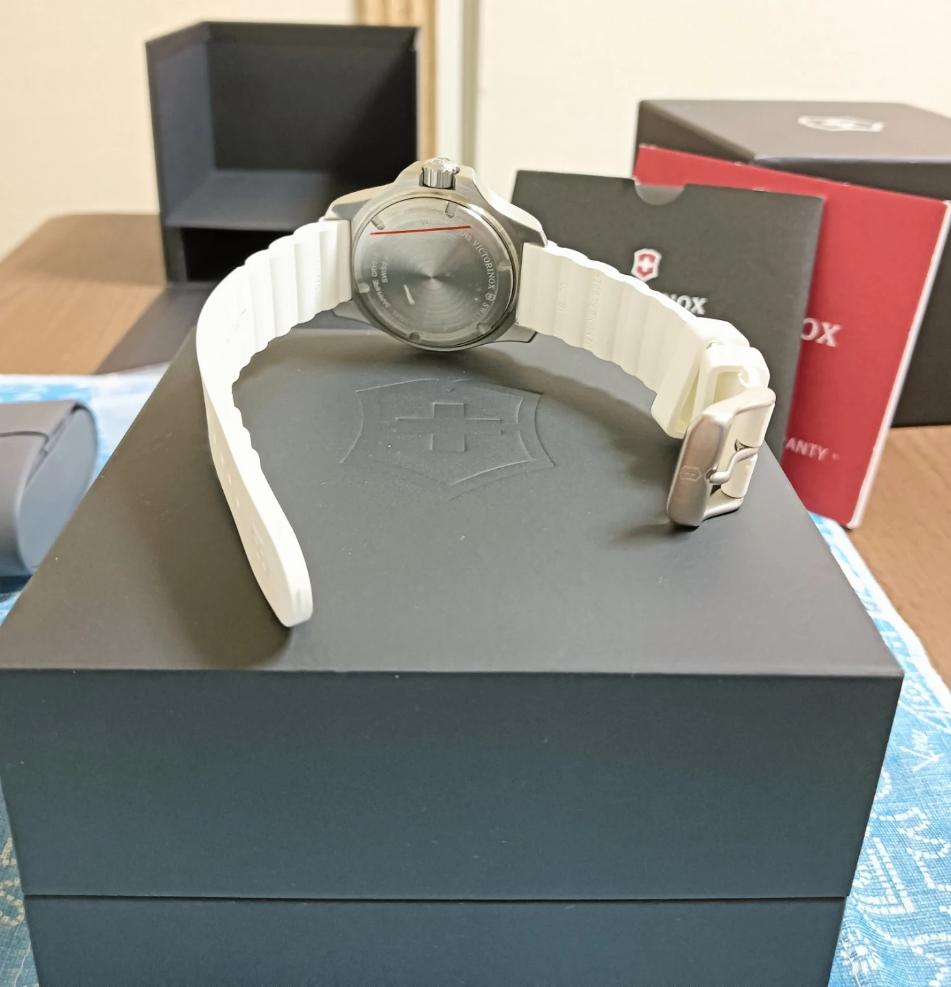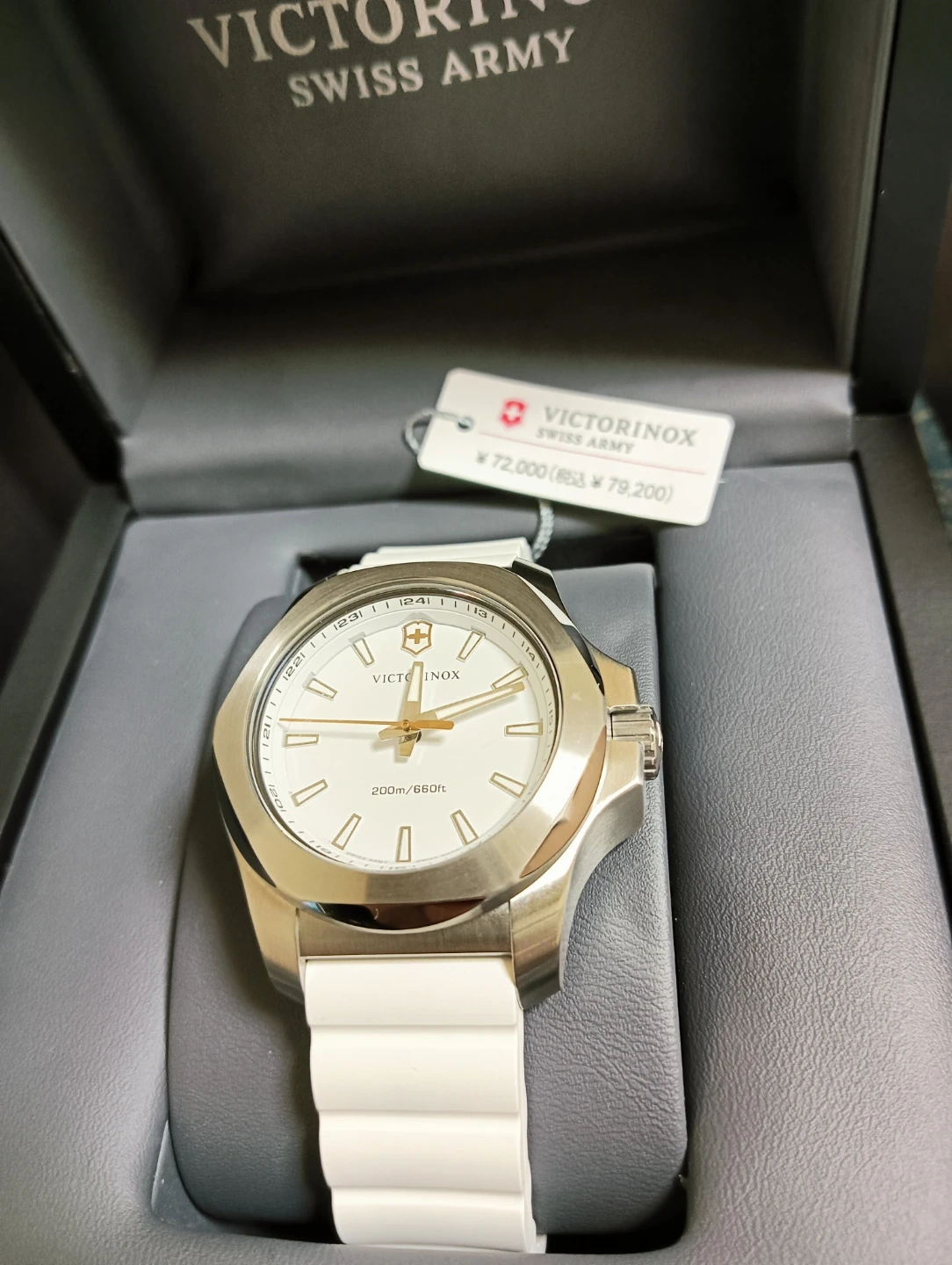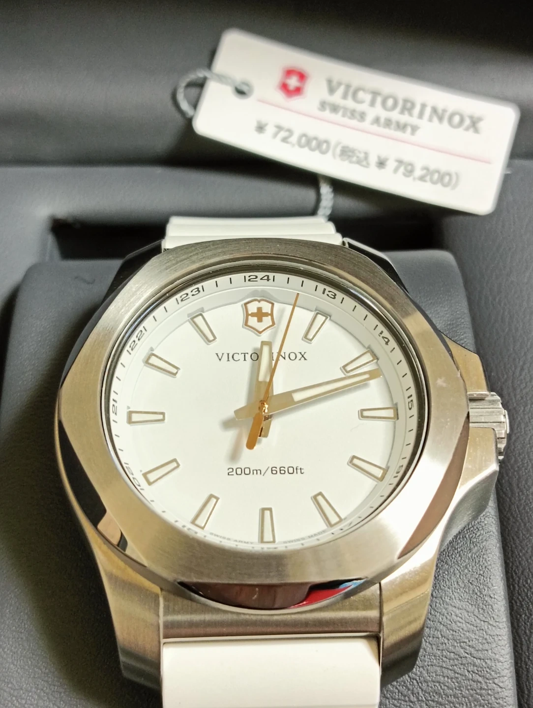 ★★ 25日迄のXmasセール。 59800→42000円 ユニセックスで使えます VICTORINOX ビクトリノックス イノックスV 200m防水 ダイバー腕時計。 型番 I.N.O.X.V 購入価格 79.200円 購入時の付属品全部付き。 +ベゼルガードカバー付き ★★ ビクトリノックスの200M防水の 本格的なダイバー時計ですね。 ビクトリノックスの日本向けの時計は、 特別に別途で品質検査してる為、 常に素晴らしい作りをしてますね。 ★★ こちら新品同様未使用品の為、購入時と変わらない状態です。 ★★ 腕周り フリー color シルバー&ホワイト 購入時の付属品全部付き。 正規箱、ケース、ギャランティ、冊子、ベゼルガードカバー、購入時のタグ付き。 ★★ 200m防水性能を持つVICTORINOXのI.N.O.X. V、スタイリッシュなホワイトデザイン。 - ブランド: VICTORINOX - モデル名: I.N.O.X. V - 防水性能: 200m/660ft - 付属品: 箱、取扱説明書、保証書 - 価格: ¥79,200(税込)