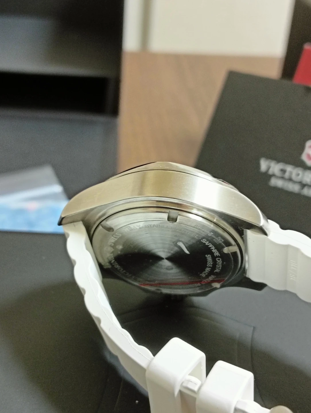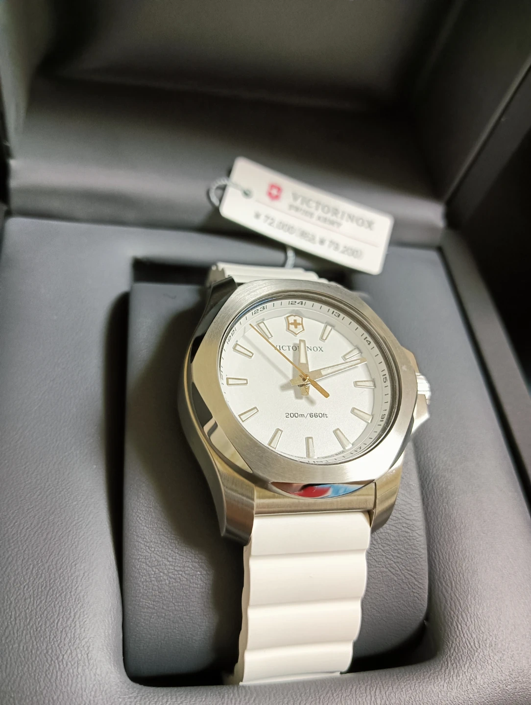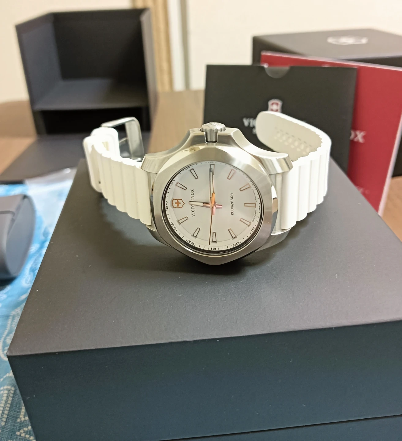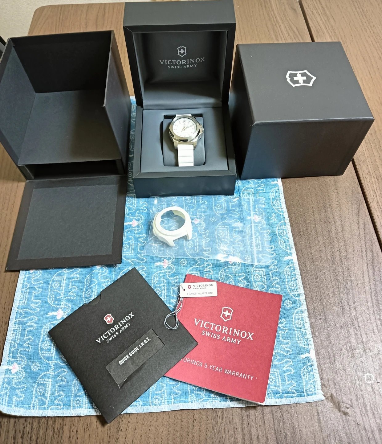 ★★ 25日迄のXmasセール。 59800→42000円 ユニセックスで使えます VICTORINOX ビクトリノックス イノックスV 200m防水 ダイバー腕時計。 型番 I.N.O.X.V 購入価格 79.200円 購入時の付属品全部付き。 +ベゼルガードカバー付き ★★ ビクトリノックスの200M防水の 本格的なダイバー時計ですね。 ビクトリノックスの日本向けの時計は、 特別に別途で品質検査してる為、 常に素晴らしい作りをしてますね。 ★★ こちら新品同様未使用品の為、購入時と変わらない状態です。 ★★ 腕周り フリー color シルバー&ホワイト 購入時の付属品全部付き。 正規箱、ケース、ギャランティ、冊子、ベゼルガードカバー、購入時のタグ付き。 ★★ 200m防水性能を持つVICTORINOXのI.N.O.X. V、スタイリッシュなホワイトデザイン。 - ブランド: VICTORINOX - モデル名: I.N.O.X. V - 防水性能: 200m/660ft - 付属品: 箱、取扱説明書、保証書 - 価格: ¥79,200(税込)