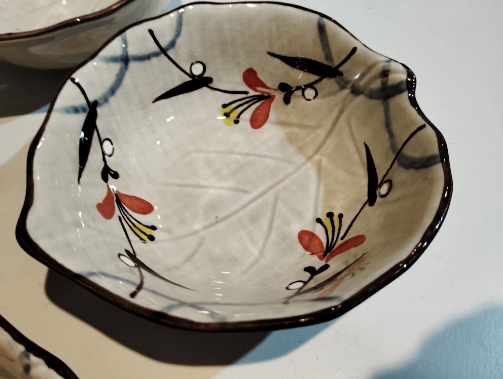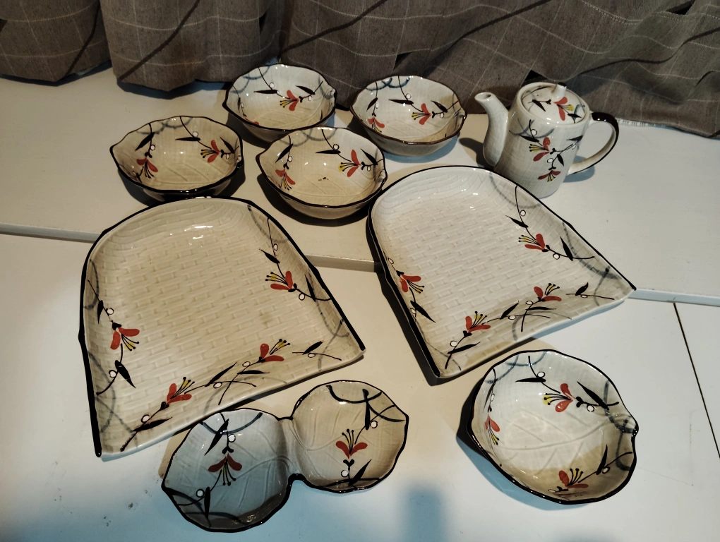 こちら、新品未使用品です! 珍しい型の大皿2枚 小鉢5個 急須、メガネ型小皿のセットとなります。 長期自宅クロゼットにて保管しておりましたので、本品や箱を含め、汚れなど多少ありますが、ご理解いただける方に方にご購入お願いします。 ■サイズ■ ①急須 直径→約7.4㌢ 内径→約5.5㌢ 高さ(蓋の持ち手まで)→約12.2~3㌢ ②小鉢 いちばん長い直径→約13㌢ 高さ→約4.4㌢ ③変形皿 長辺→約21.7㌢ 短辺→約15㌢ 曲線ですが、直線で計測しております。 二辺→約20㌢ ④メガネ型小皿 縦→約9㌢ 横→約18.9 ㌢ ※素人採寸のため、誤差は、ご容赦くださいね ★他サイト出品中!! 受け渡し場所は、一応世田谷線宮の坂駅と指定させて頂きましたが、 自転車ですので、日時によっては、 待ち合わせ場所の範囲を拡げられるかもしれませんので、 確約はできませんが、チャットでお尋ねくださいね。 ※プロフィールご覧くださいね。
