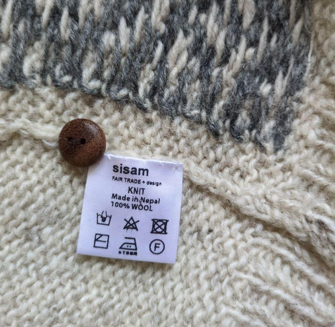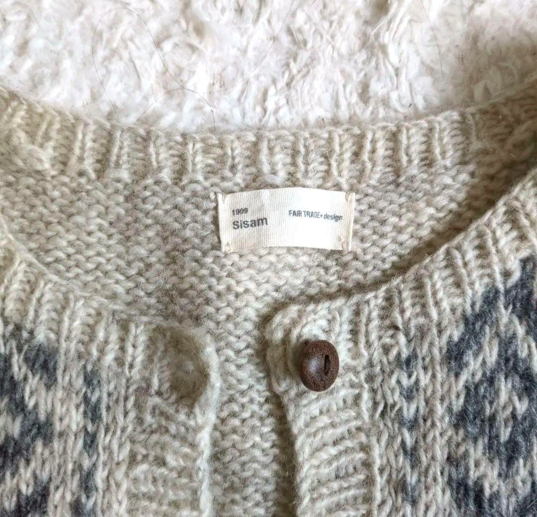 シサム工房 Sisam ツナグカーディガン | SISAM FAIR TRADE+design .. いのちのめぐり -手編みニット ノルディック柄 アイボリー ベージュオフホワイト 税込16500円 ご覧いただきありがとうございます。 シサム工房のニット・セーターです。 100%ウール 手編みで厚みの温かみのあるセーターです。 旅行先の京都の本店にて購入しましたが、未着用のままでした。タグは切ってしまいましたが未使用新品です。 きれいなうちにどなたかご活用くださる方の手に…と思い、出品しました。 ベージュとグレーの色合いに、ノルディック柄の可愛らしい手編みの模様と、木製のボタンが温かみのあるデザインです。 ***商品説明引用*** 今シーズンのテーマ「めぐる」からデザイナーが思い浮んだ、 花と葉っぱのツナグモチーフが魅力的。 2トーンで落ち着いた配色とベーシックな形は 普段は柄物を着ない方にも、とてもおすすめです。 暗めの色が多くなりがちな冬のコーディネートに一枚足すだけで 華やかな印象を叶えてくれます。 性別を問わないデザインなのでプレゼントにもオススメです。 ウールのカーディガンはアウターにも向いています。 ***シサムについて*** シサム工房は1999年、京都に誕生したフェアトレードの会社です。 「お買いものの力で思いやりに満ちた社会をつくる担い手となる」をVISIONに掲げ、 アパレル、生活雑貨、コーヒーなど、オリジナルの商品開発を行っています。 手仕事の良さ、その土地の人々のもつ技術を最大限に活かした、ものづくりを創業以来続けています。「フェアトレード」を通して、 「作り手」「売り手」「買い手」「社会」「地球環境」の「五方良し」を目指す、これからのライフスタイルの提案をしています。 即購入可能です! 【エシカルコレクション】【フェアトレード】 群言堂 フェアトレード メイドイン ネパール シサム Sisam