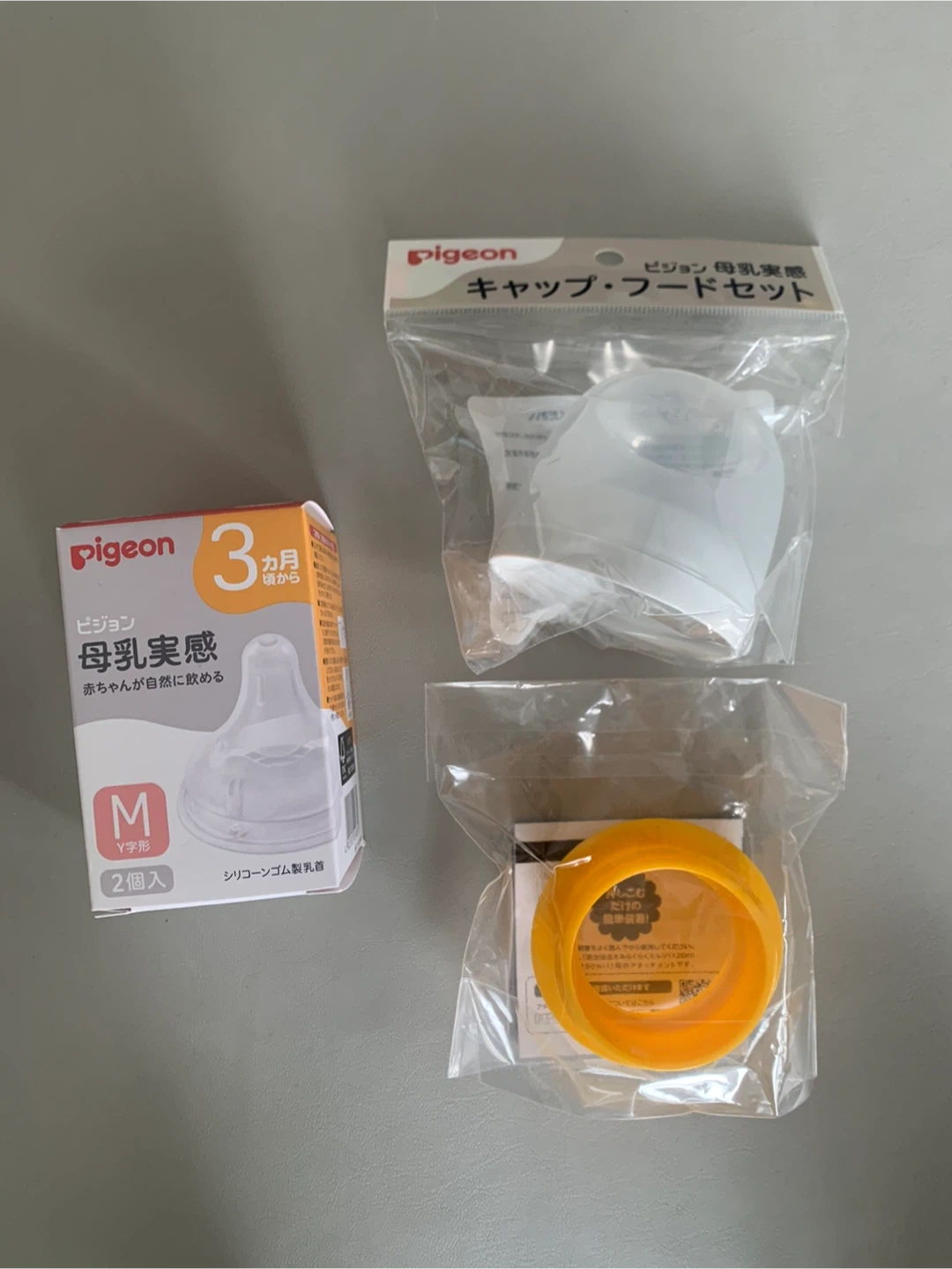 ピジョン母乳実感パーツのセットです。 ◎セット内容 ・ピジョン母乳実感キャップ&フードセット×1 ・ピジョン母乳実感乳首 サイズM(3ヶ月頃〜) 2個入×1 ・ピジョン母乳実感専用アタッチメント×1 アタッチメントは明治ほほえみ らくらく液体ミルクにピジョン母乳実感の乳首を取り付けることができる専用です。 ◎自宅保管の旨、ご理解いただけますようお願いいたします。