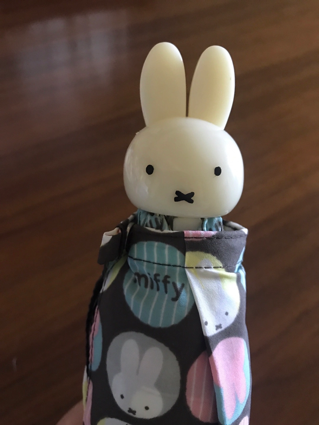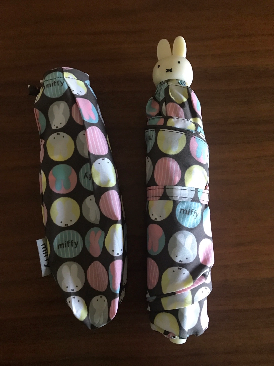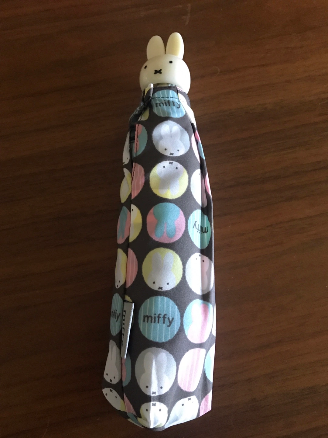 ミッフィーのデザインが特徴的なカラフルな傘です。新品未使用です。 - デザイン: ミッフィーのキャラクターがデザインされた傘 - 色合い: グレーを基調にしたカラフルなドット柄 - 特徴: 傘の持ち手がミッフィーの顔の形をしている