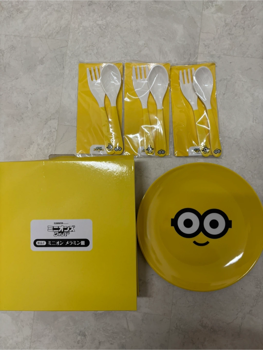 ミニオンズのメラミン皿とスプーン・フォークのセットです 【情報】 ブランド:ミニオンズ 種類:メラミン皿4枚、スプーン、フォークセット3つです。 新品未使用です。撮影の為開封しました。 かわいいのでおすすめです!