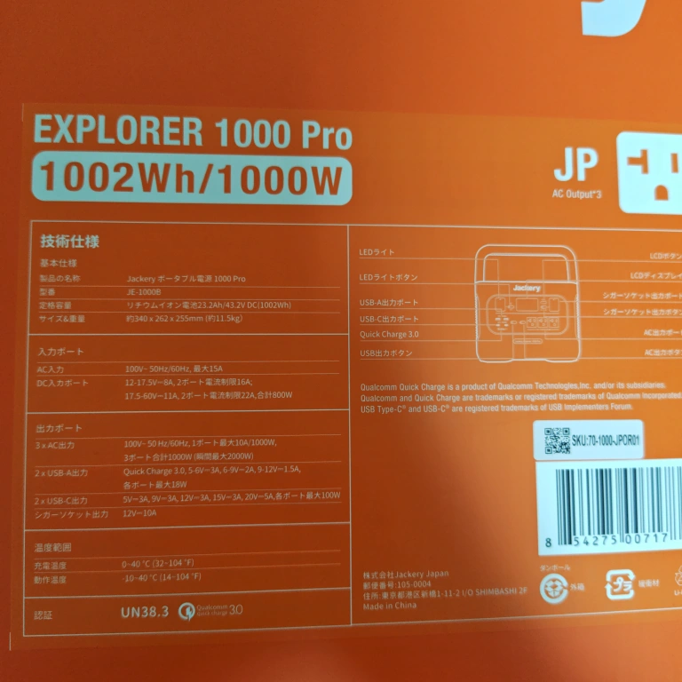 ご覧いただきありがとうございます! 【新品未使用】 人気のポータブル電源 Jackery Explorer 1000 Pro(型番:JE-1000B) -------------------------------- ■ 商品の状態 -------------------------------- ・新品未使用品(使用履歴なし) ・購入後、確認のため一度開封しています。 自宅保管による細かなヨレやスレはあります。 ※未使用なので問題ないかと思いますが、 完璧な新品を求める方、神経質な方はご購入をお控えください。 -------------------------------- ■ スペック(JE-1000B) -------------------------------- ・容量:1002Wh ・定格出力:1000W(瞬間最大2000W) ・USB-C PD対応 ・車中泊/キャンプ/防災に最適 ・静音設計・高速充電 -------------------------------- ■ 付属品 -------------------------------- ・新品購入時のまま付属品一式揃っています。 ご購入後のキャルセルは受け付けておりませんので、よくご確認頂き、お間違えのないようにご購入をお願いします。 また、商品すり替え防止などの為、返品や交換は致しかねますのでご了承下さい。宜しくお願い致します。 -------------------------------- ■ ひとこと -------------------------------- 大変人気のモデルですので、お早めにどうぞ! 【受け渡し場所】 場所を設定させて頂いておりますが、持ち運びが大変な方はご自宅付近までお持ちすることもできる場合もございますので、お気軽にご相談頂ければと思います。