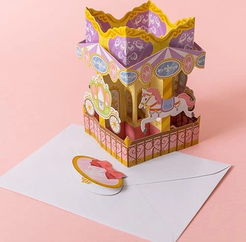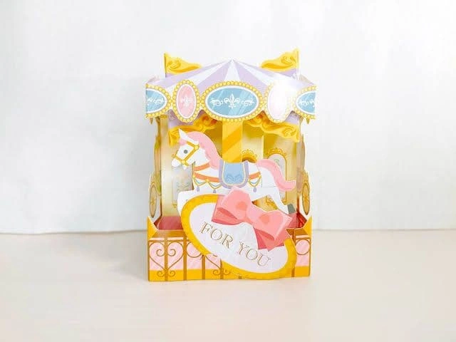 とても可愛いメリーゴーランドの立体ギフトカードです。 未使用ですが自宅保管にご理解ください! 組立時:約100×72×72mm ご希望の方はお気軽にご連絡ください。