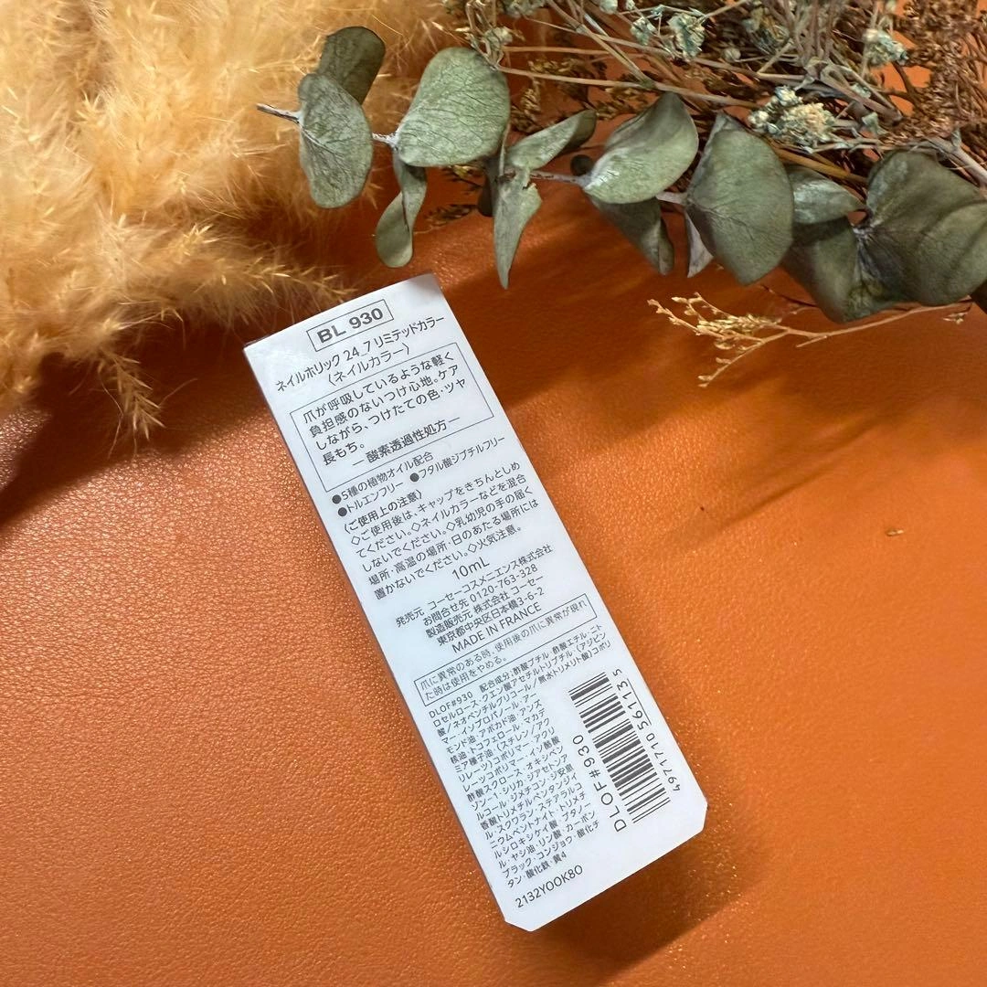 3枚目にネイルと近い色のイメージ画像があります。アレンジの参考になるかと思います(*ˊᵕˋ*) この限定色は冬にぴったりの色合いで、これからのホリデーシーズンにおすすめです。お持ちのシルバーなどと合わせて指先をおしゃれな冬仕様にしませんか? おすすめポイント 1. 高発色: 一度塗りでしっかりと発色し、ムラなく美しい仕上がりに。 2. 速乾性: 忙しい日常でもすぐに乾くので、時間を無駄にしません。 3. 豊富なカラーバリエーション: 他の色とも相性が良く、様々なネイルアートに挑戦できます。 ネイルホリックのBL930は、ファッションや気分に合わせて使える万能カラーです。シンプルなデザインから華やかなアートまで、どんなスタイルにもマッチします。 種類···カラージェル ご希望の方はお気軽にご連絡ください。