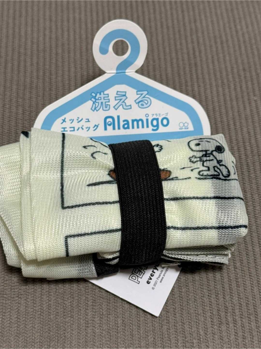アラミーゴのスヌーピーエコバッグです。 ・ブランド:アラミーゴ ・柄:スヌーピー ・状態:使用感少なめ ・汚れても気軽に洗えて乾きやすいメッシュ加工 25×21cm ・定価1000円 中古品であることをご了承ください。