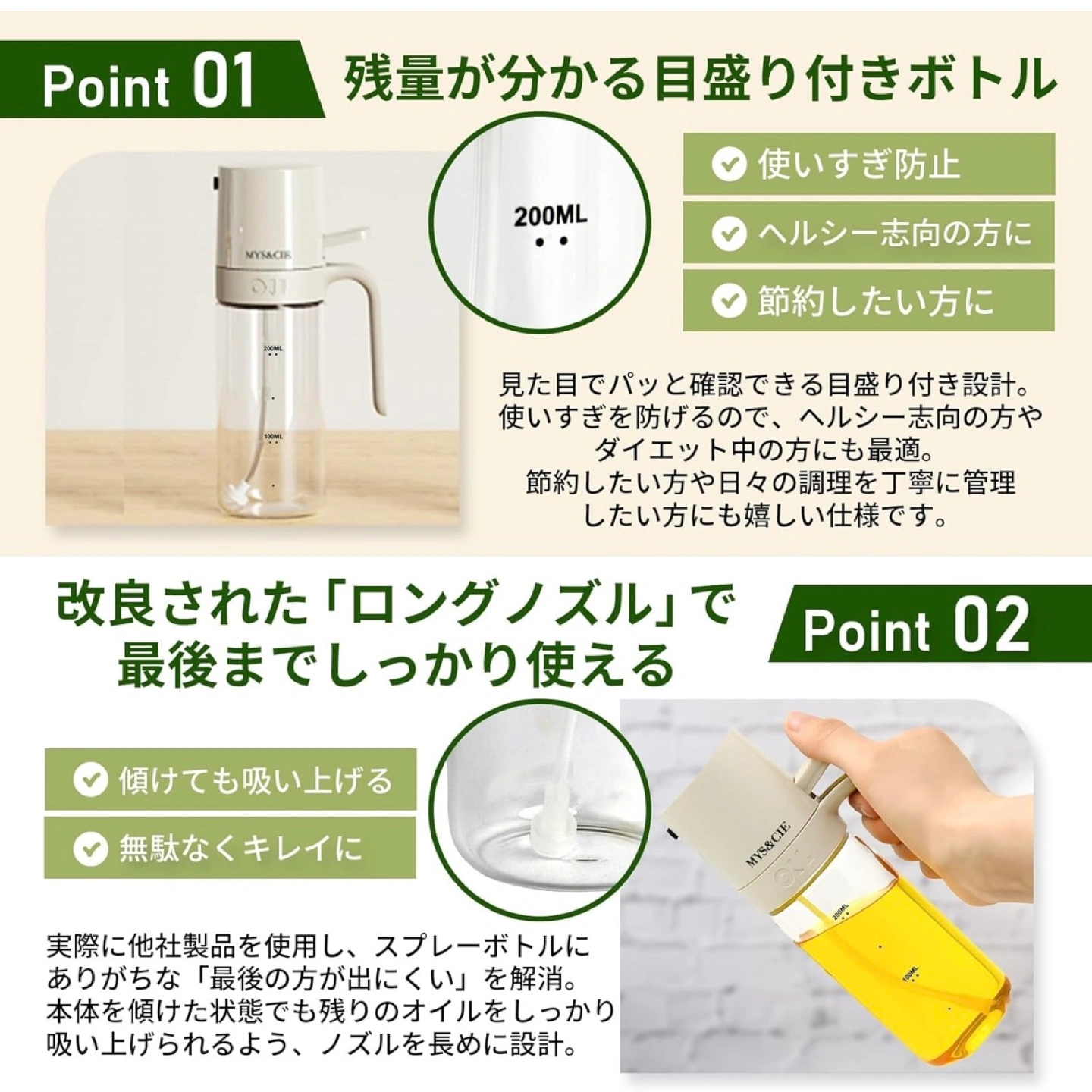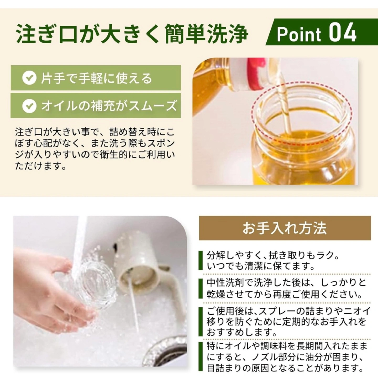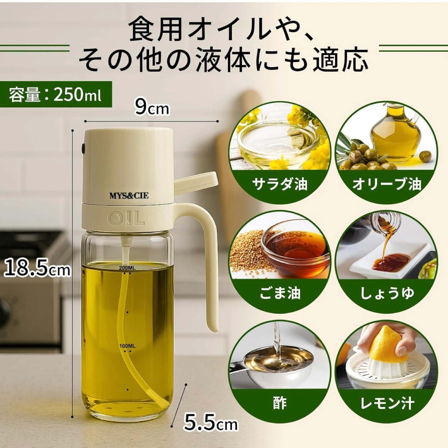 オイルスプレー 250ml 目盛り付き 耐熱ガラス製 新品未使用 ●残量がひと目でわかる、目盛り付き(200mlまで) ●スプレーノズルを長めに設計。ボトルを傾けた状態でもしっかり吸い上げます。 ●液だれしにくいノズル構造。ノズルは突出構造+汚れがつきにくい素材を採用。 ●、大きめ注ぎ口 注ぎ口で、詰め替えラクラク、洗いやすい。 ●片手で使いやすい設計。 ●日本国内の食品衛生法に基づく「蒸発残留物検査」に合格した素材を使用。耐熱ガラス製 ●内容量:250ml ●サイズ:約18.5cm × 9cm × 5.5cm