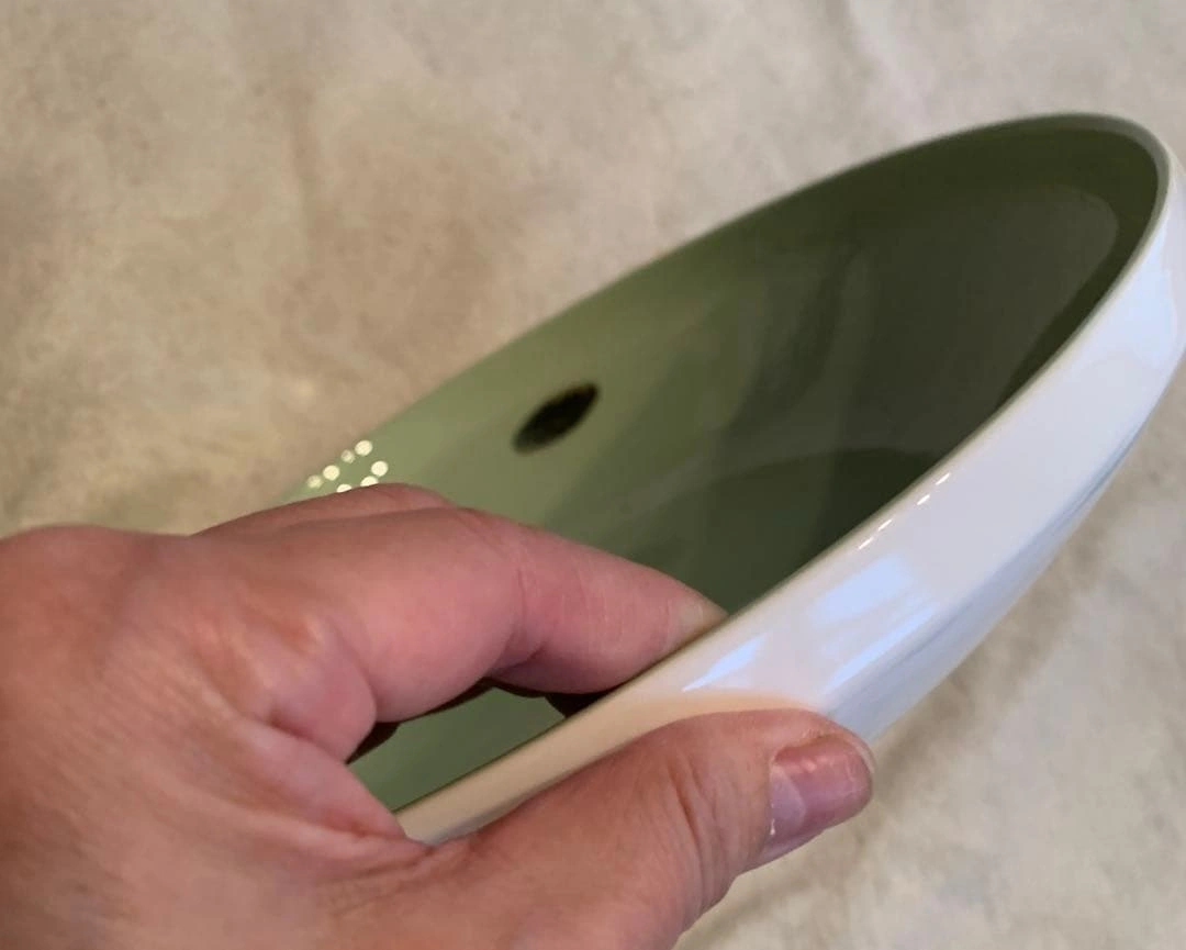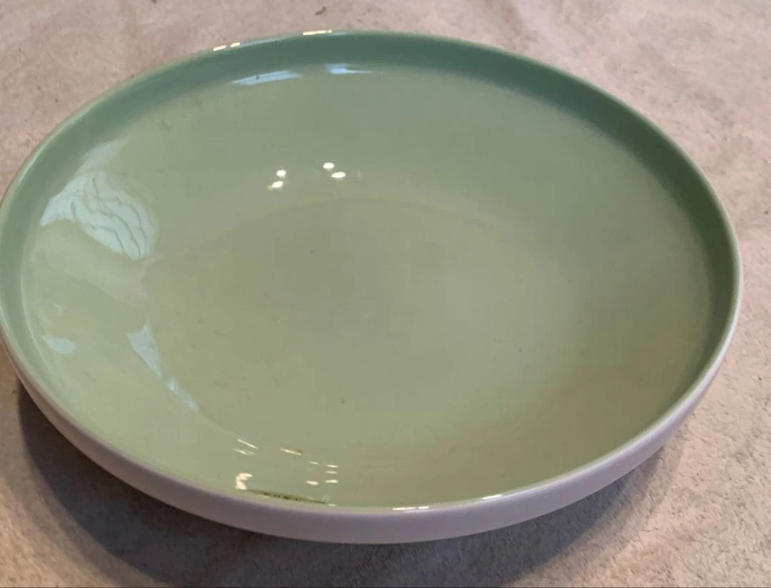 東洋陶器の品です。 シールには絶対にはげない下描付き品と書いてあります。 内側は綺麗なミントグリーンで、外側は白、とても素敵です 直径25センチ 高さ6センチ 高台直径14センチです 北欧食器や北欧テイストのインテリアと相性が良いと思います。 ご希望の方はお気軽にご連絡ください。