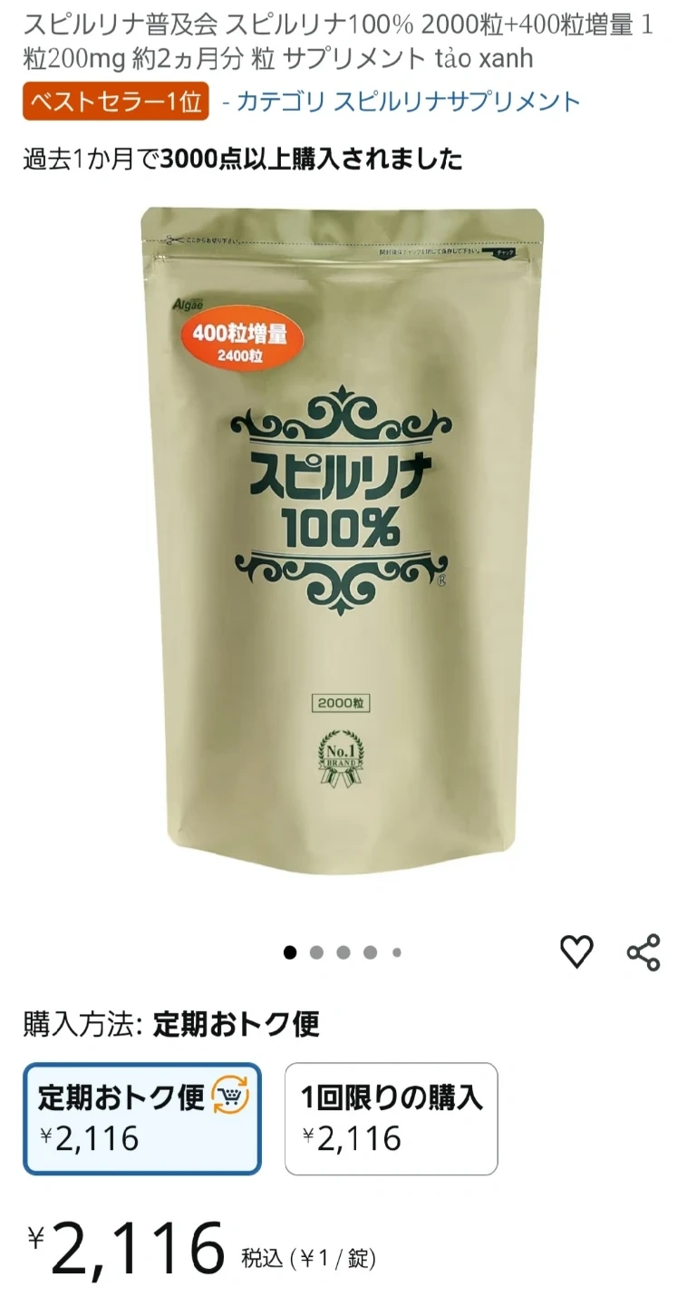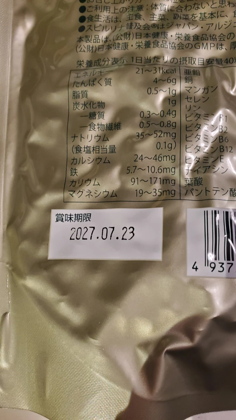 スピルリナ100%のサプリメントです 新品 未開封 大阪万博でも話題。 半世紀前 1970年代から販売されてる 原始の海藻 スピルリナ 健康食品 ほぼ無味無臭、 朝晩お水で。又は、お味噌汁などに入れてもOK。 1袋の値段です。新品未開封。 写真は乾燥防止のため真空なってます。 4袋あります。 まとめ割引 2袋 3600円 3袋 5350円 4袋 6950円 お得です! 直接会わずに、非対面でマンションのエントランスに置いておくなら24時間OKです! 発送や 新宿駅などで、受け渡しも可能です。 大阪・関西万博の日本館では、展示スピルリナを培養し、原材料とした「藻類みそ汁」の配布や、スピルリナに着色したスツールなどの展示が行われました。 視力の低下を抑え、感染に対して抵抗し、粘膜合成促進、活性酸素消去(抗酸 化)ガン予防の効果があります。 緑の血液と呼ばれ、コレステロール低下、抗炎症、破壊組織修復作用があります。 スピルリナ特有の青色色素でクロロフィルと同様植物の光合成を担っています。 クロレラより、栄養価が高いと言われています。 【情報】 種類:スピルリナサプリメント 内容量:2000粒 (400粒増量 2400粒) 賞味期限:2027年7月23日 中古品であることご了承ください