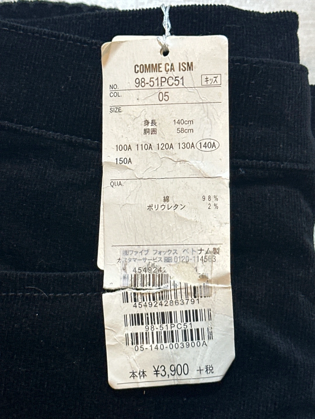 ご覧頂きありがとうございます♪ コムサイズムのシックで可愛いコーデュロイ生地のロングパンツです。 後ろのポケットがリボンになっていておしゃれです。 普段使いからフォーマルなシーンまで幅広く使えると思います。 サイズ:140 定価:4.290円 カラー:ブラック タグがシワになっています。 完璧を求める方は店舗で定価にてご購入ください。 他のサイトにも出品しておりますので早い者勝ちです!