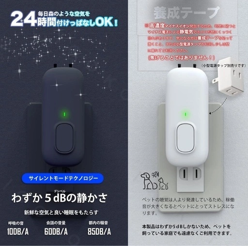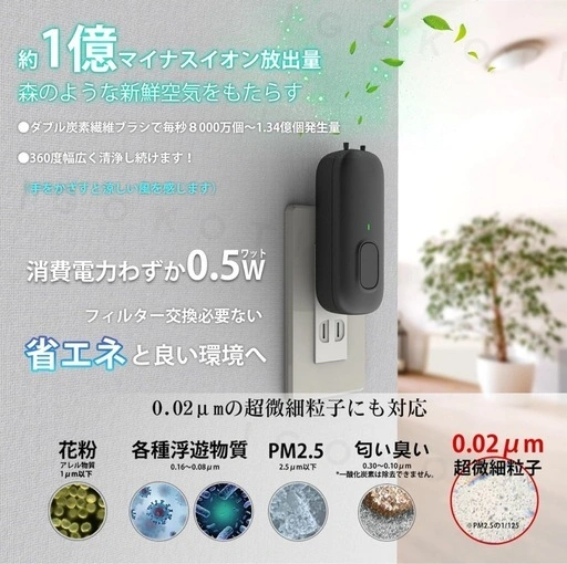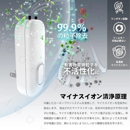 自然の中、特に滝や川のそばの空気は清々しく感じますね!その理由は空気中に含まれるマイナスイオンです。 約1億高濃度の清浄原理で、空気中の目に見えない浮遊粒子物質などを分子破壊・分解可能です。内蔵発生器で高電圧による炭素繊維ブラシシステムを使用し、マイナスイオンを大量放出。空気中の分子や汚れた粒子に付着させ、マイナス電子を与えます。マイナス電子は互いに反発し、呼吸範囲から離れます。プラス電子に引き寄せられ、重力で大きな粒子が地面に沈み、のどや鼻の粘膜に付着するのを防ぎ、肺に入らないように空気を守ります。 稼働音はわずか5dB。高齢者やペットにも騒音によるストレスがありません。コンセントに差し込んでボタンを押すだけで設定完了、24時間自動で作動します。 コンセント式、ワンボタン起動で操作は簡単。100mm*50mm*40mmの小型で、トイレ、リビング、キッチン、靴棚など様々な場所に対応。除去率99.2%。消費電力≤5W、フィルター交換不要で省エネです。 ご不明点はお気軽にお問い合わせください。