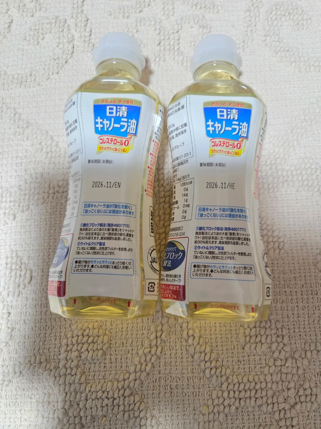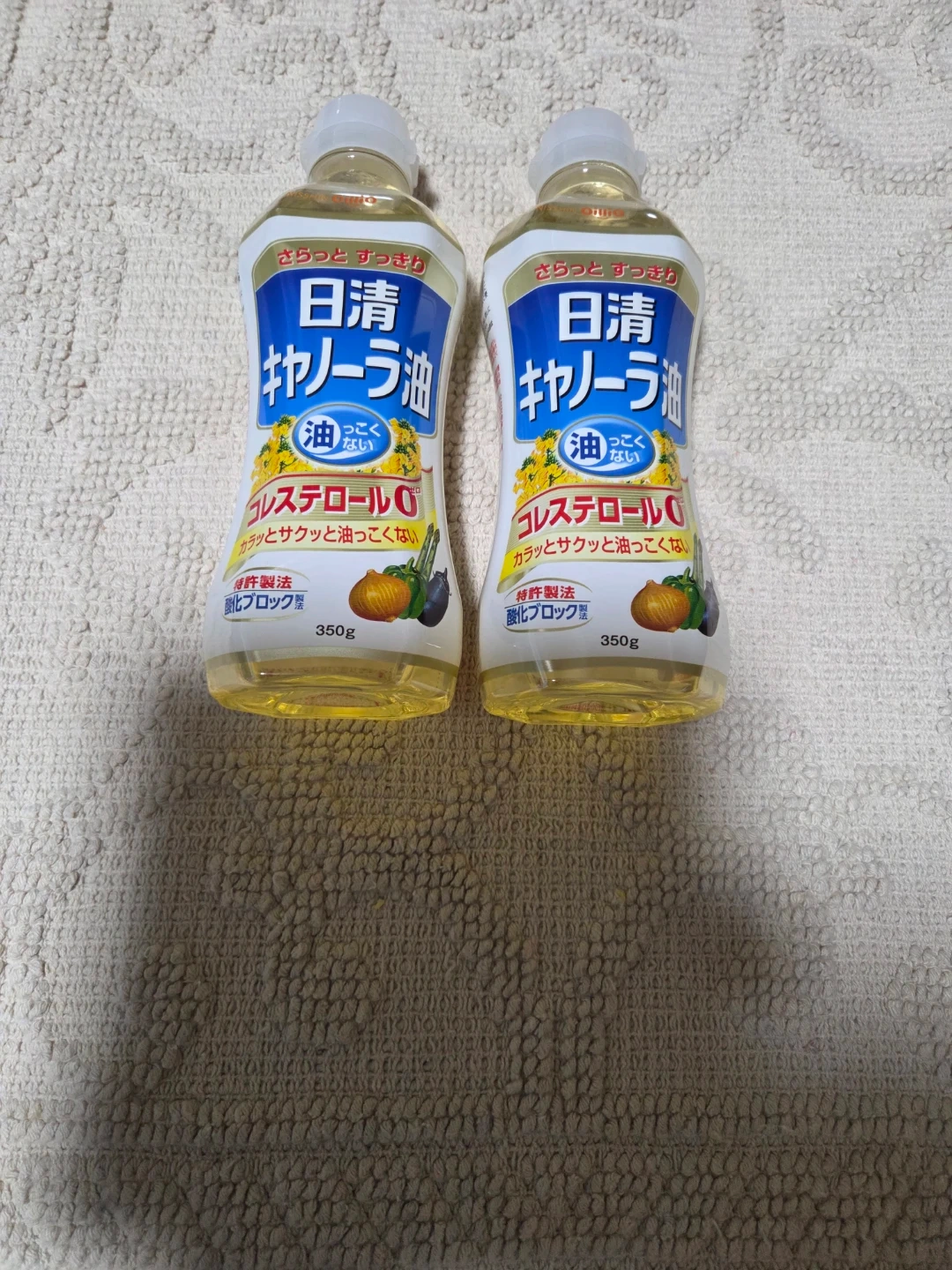 日清キャノーラ油350gの2本セットです。 ・内容量:350g ・2本セット ・賞味期限(未開封):2026.11 使用期限は問題ございませんが、景品の為少しお安い価格にしております。 ※三枚目の通り日付が書いてあります。 気にならない方にお譲りいたします。 仕事している為、 平日は18時以降 土日はご相談させて下さい よろしくお願いいたします。