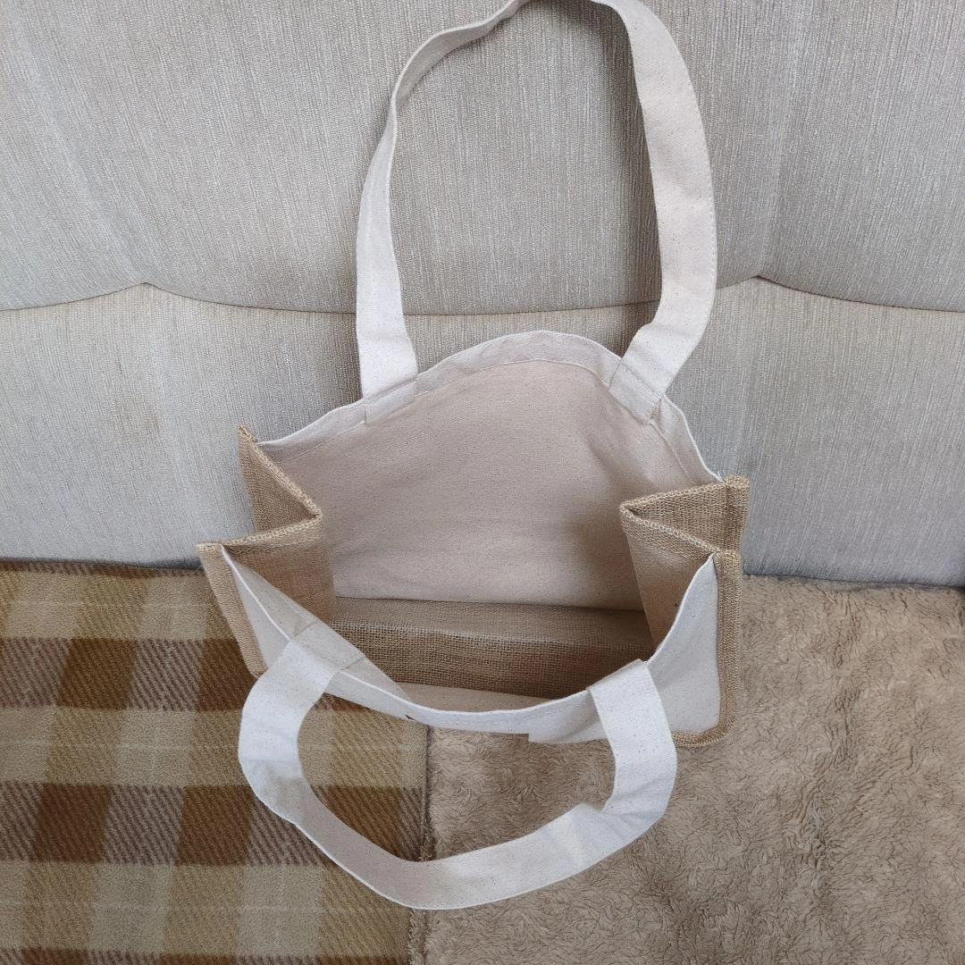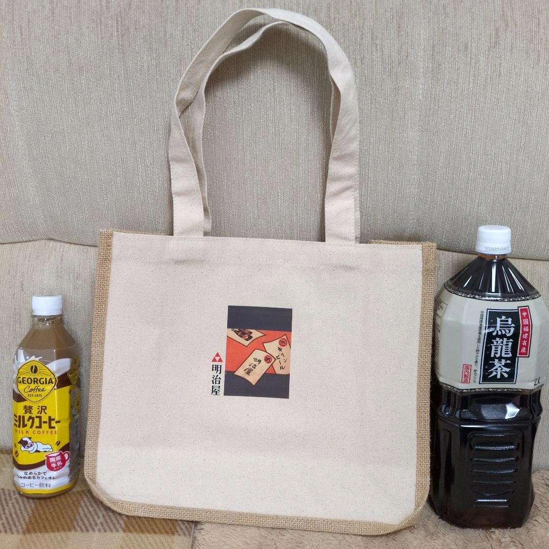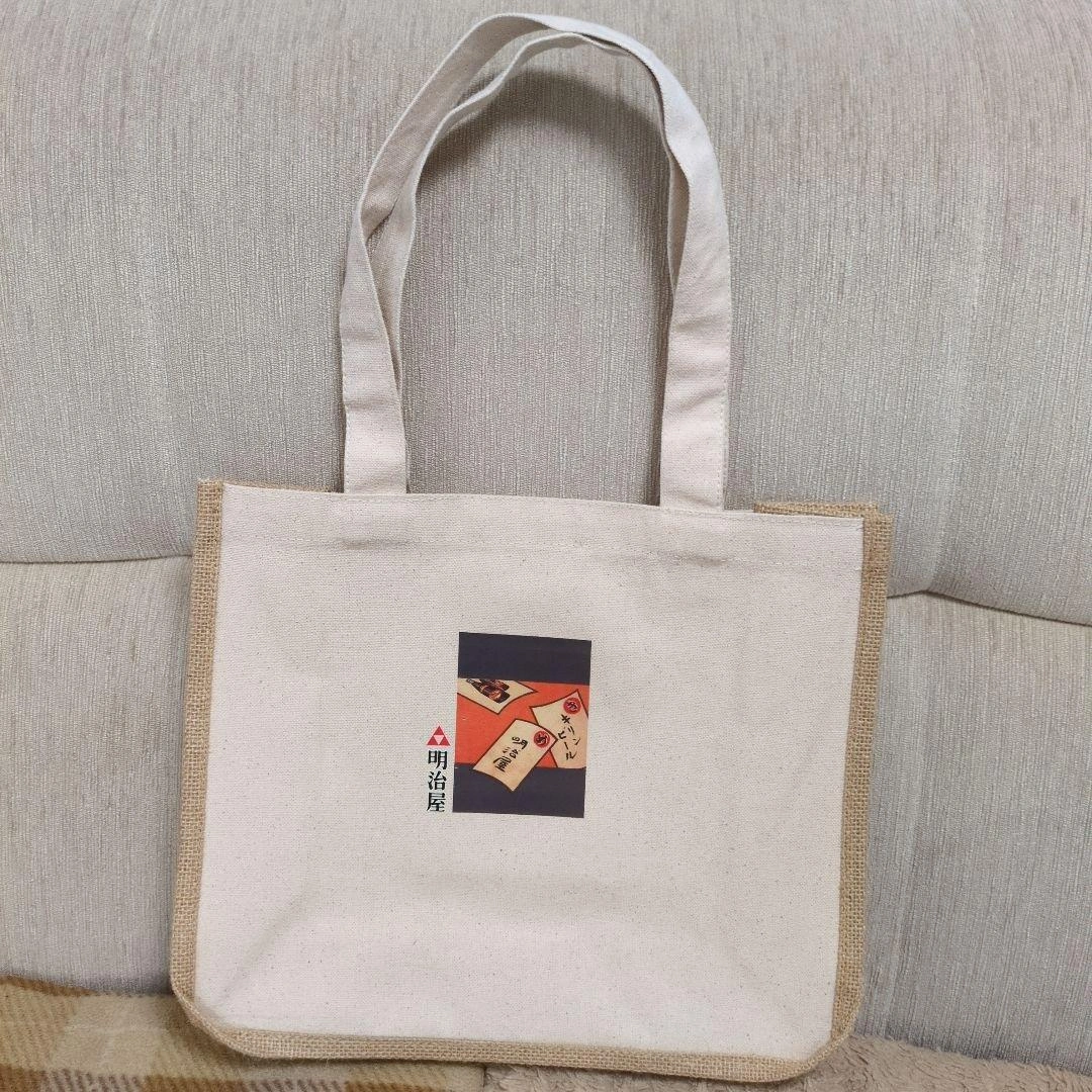 明治屋のロゴがプリントされたキャンバス製トートバッグです。 昭和レトロ風 - デザイン: 明治屋のロゴとボトルのイラストがプリントされたキャンバス素材のトートバッグ - 素材: キャンバスとジュートのコンビネーション - 形状: 平らな底部で安定感がある - 色: ナチュラルカラー(クリーム色) ご覧いただきありがとうございます。 ご希望の方はお気軽にご連絡ください。
