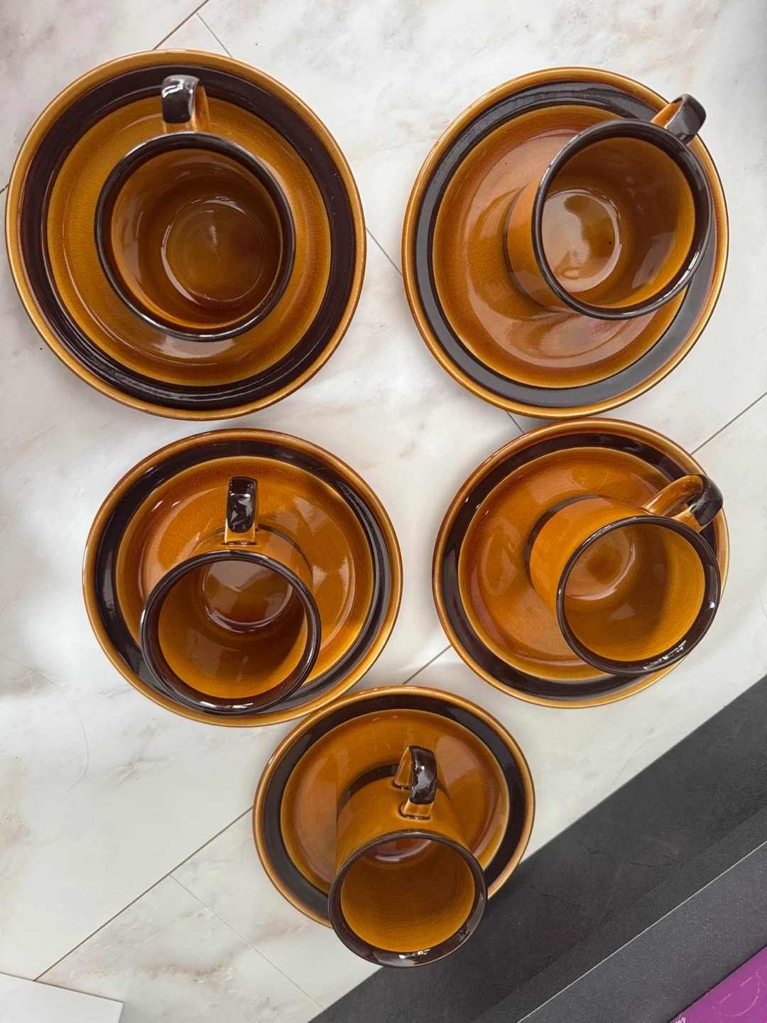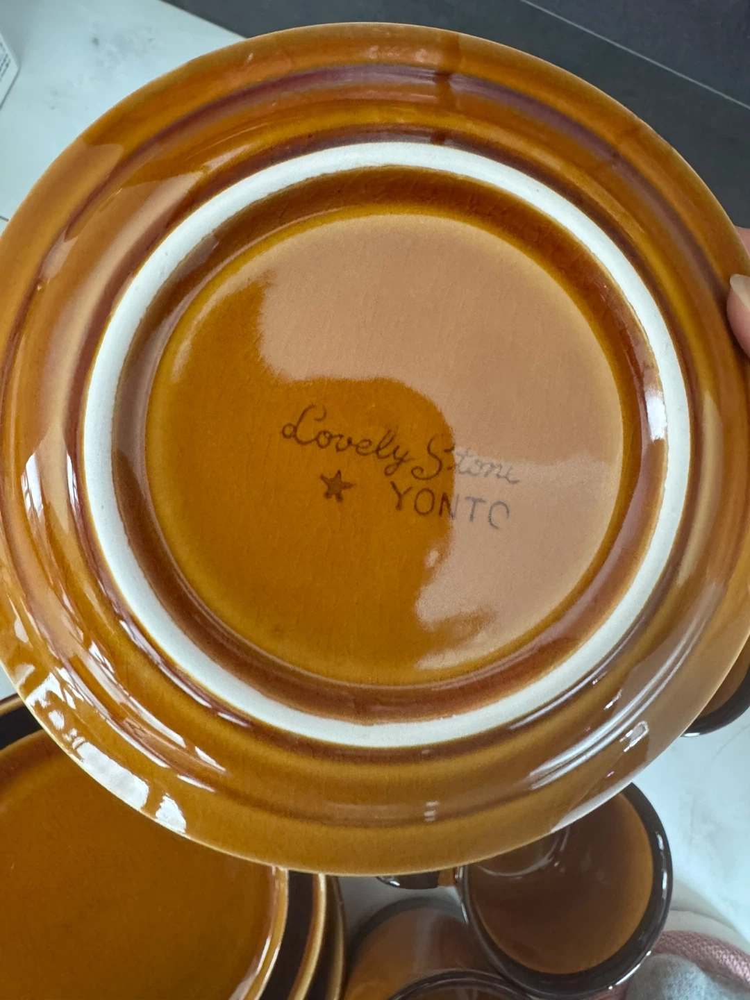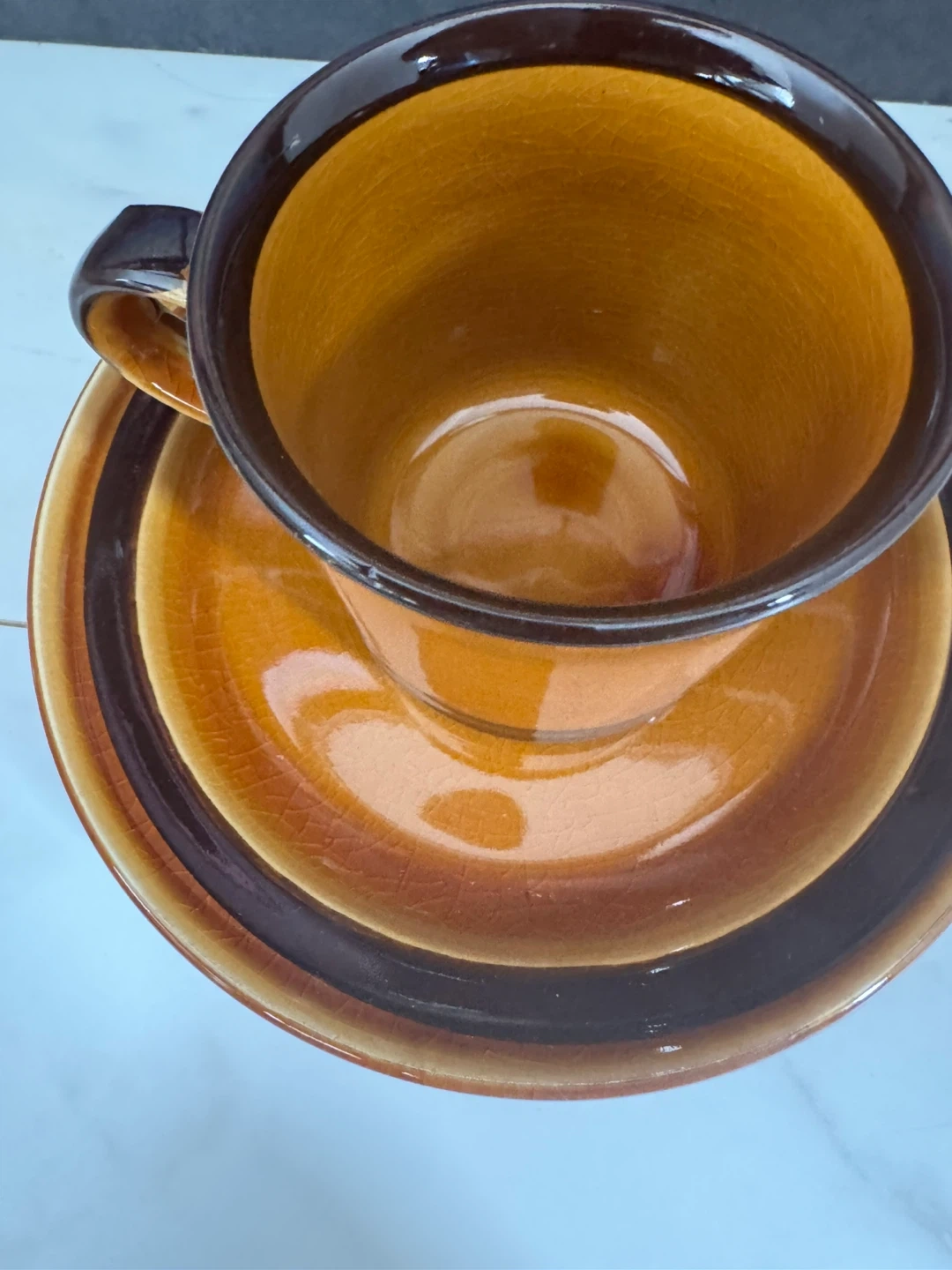 あたたかさ落ち着いたキャラメルブラウンのグラデーションが美しい、昭和レトロな「Lovely Stone」シリーズ。 YONTO(ヨント)製のストーンウェアで、厚みのある釉薬と独特のクラッキング模様が味わい深く、当時の日本製陶器の質の高さを感じさせます。 ☕️ セット内容:カップ&ソーサー × 5客 📦 状態:新品・未使用(長期保管品) 🇯🇵 製造国:日本製(YONTO Lovely Stone) 💎 特徴:レトロモダン/美濃焼系ストーンウェア/昭和ビンテージ 昭和喫茶の雰囲気がお好きな方、レトロ陶器コレクターの方におすすめです。 一点ずつ釉薬の表情が異なり、飾っても美しいお品です。 ✨ 即購入OK