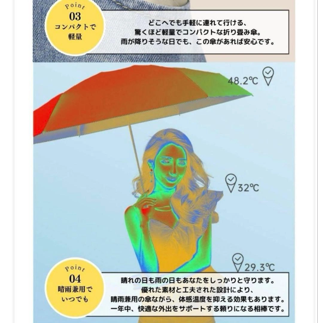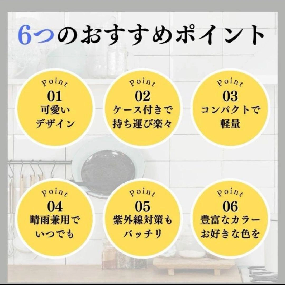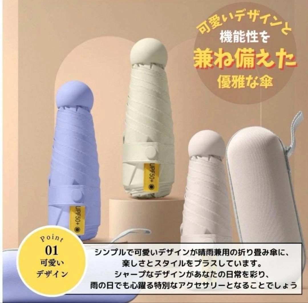 ご覧いただきありがとうございます。 折り畳み傘、日傘です。軽量で晴雨兼用。 UVカット、耐風撥 水。5段階折りたたみ式。 携帯に便利なコンパクトカプセル傘。 UPF50+の日焼け止め対策。 【商品詳細】 商品名:折りたたみ傘 フレーム素材:ステンレススチール 材質:ステンレス鋼、グラスファイバー コンパクトで軽量な設計です。閉じた状態の長さは18cm。 晴雨兼用の傘として、高密度材料を使用しており、UVと水を効果的に遮断するコーティングが施されています。UPF 50+の保護機能で、紫外線の95%をカットし、雨に濡れてもすぐに乾く性能を発揮します。暑い夏でも体感温度を下げ、涼しさをキープします。 高品質なグラスファイバーとステンレス鋼の素材は、強風にも耐え、折りたたまれた状態でもすばやく乾くようビニールコーティングが施されています。丈夫で速乾性があります。 カラーはホワイト系です。 ご希望の方はお気軽にご連絡ください。