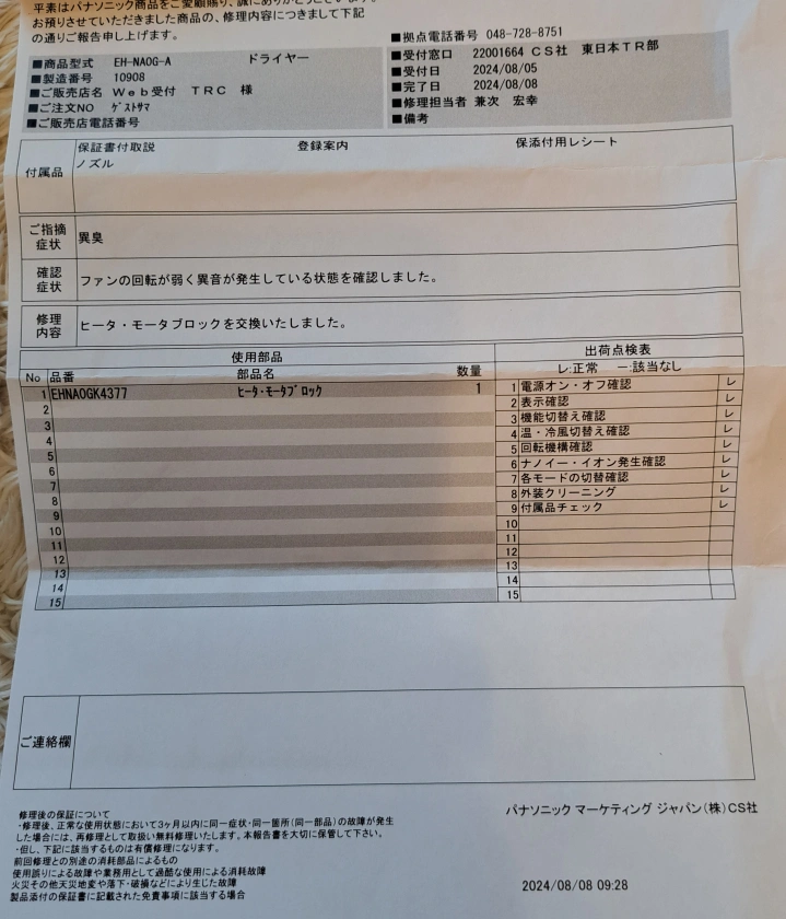 定価3万以上 購入日:2023年12月 頃 びっくりするくらい髪がサラサラになります! 今年8月に異音がして、Panasonicに12,604円で修理に出しました。 そのタイミングでリファのドライヤーを購入したため、勿体無いのですが今は使っておらず出品させて頂きました。 2024年8月の修理ではヒーター、モータブロックを交換してもらい動作確認もPanasonicでしてもらっているのでモーター等は新しい状態となります。