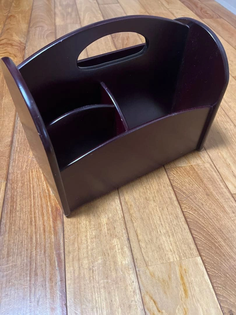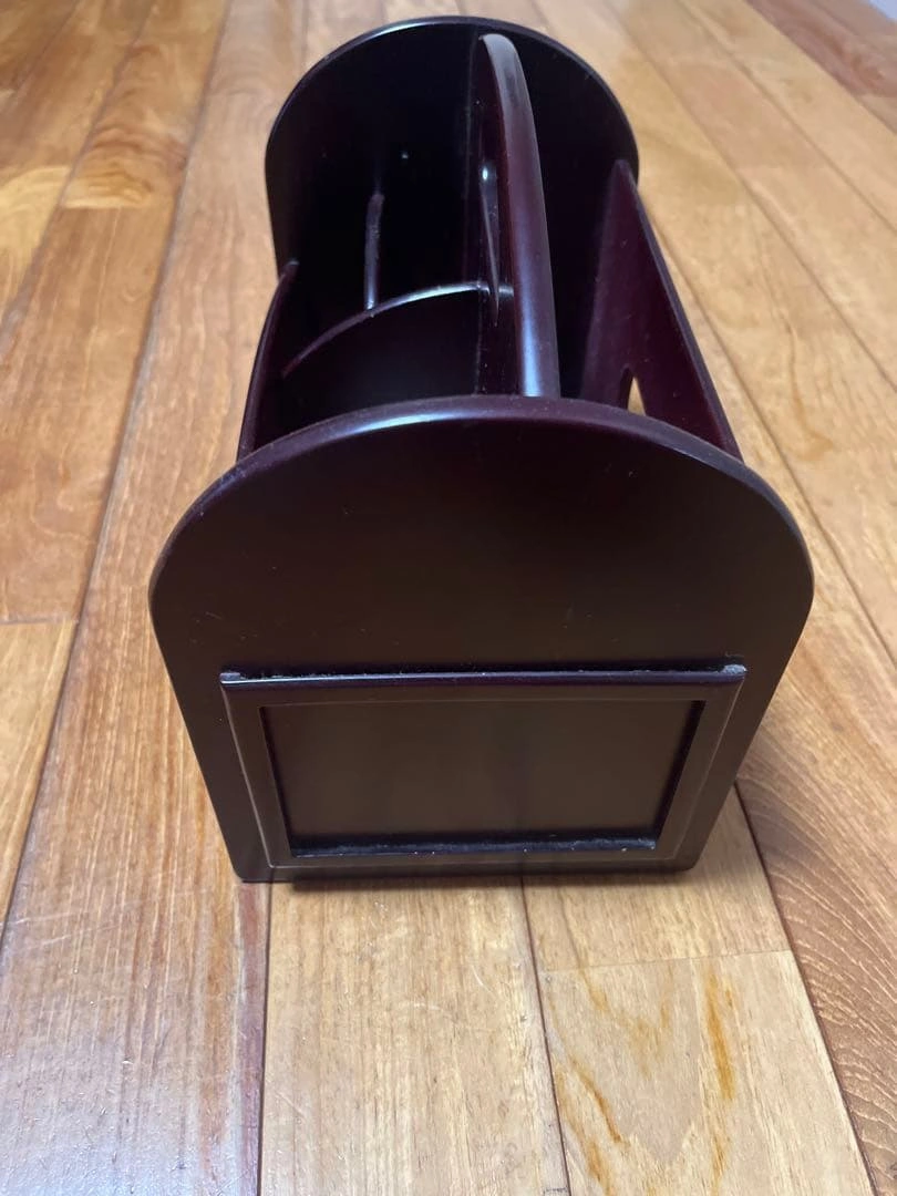 木製のマガジンラックです。小物入れとしても使用できます。 落ち着いた色合いです。 取っ手付きで持ち運びしやすいです。 仕切りがあります。 仕切りの底に汚れがありますが、使用に支障はないかと思います。 カラーはワインレッドで落ち着いています。 横28cm、高さ20cm、奥行き17cmです。 - 色: ダークブラウン - 素材: 木製 - デザイン: 仕切りあり - 取っ手: 持ち運びやすいようにカットされています ご希望の方はお気軽にご連絡ください。