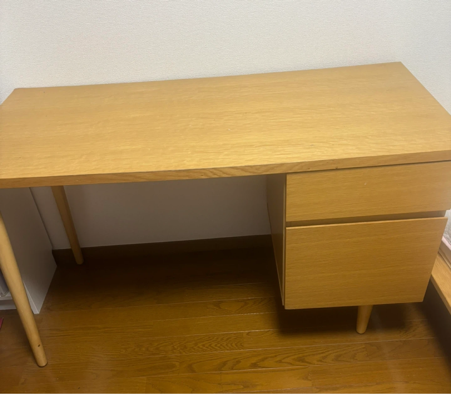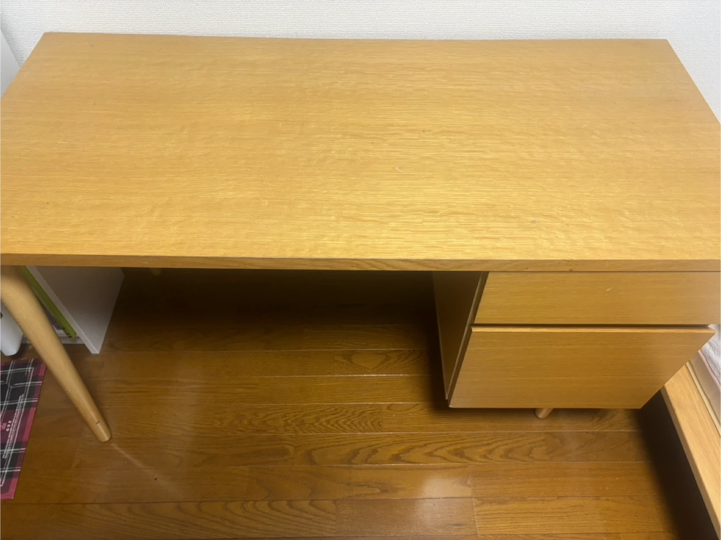 木製のデスクです。 楽天で購入しました。 ※ 12/19までに引取り希望です。受け取り先住所の詳細につきましては、契約成立後追って連絡します。 ・色:木目調 ・引き出し付き(左右どちらかに取付可能) ・状態:使用感あり 引出しサイズ横39×長46cm(足の部分含まず)素人採寸になりますので誤差がございます。 中古品であることをご了承ください。