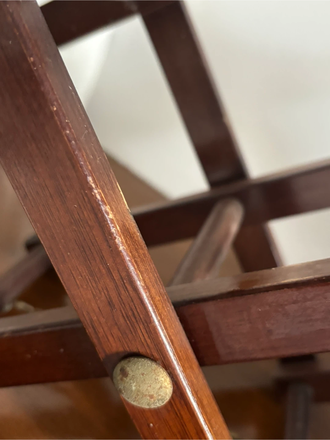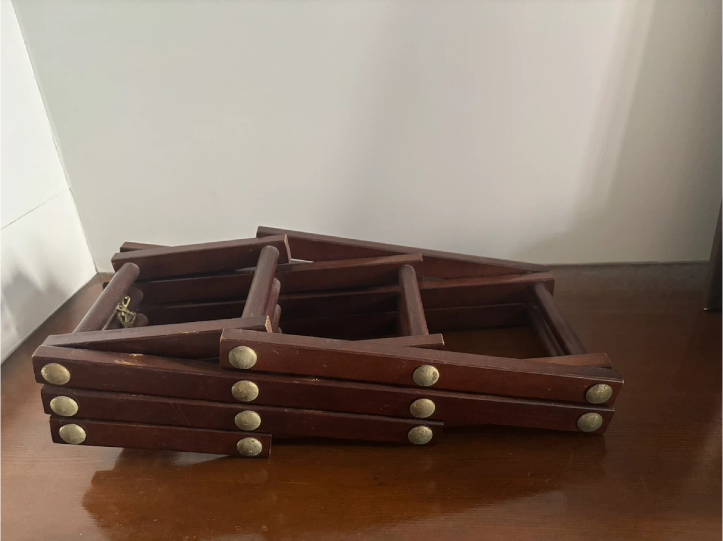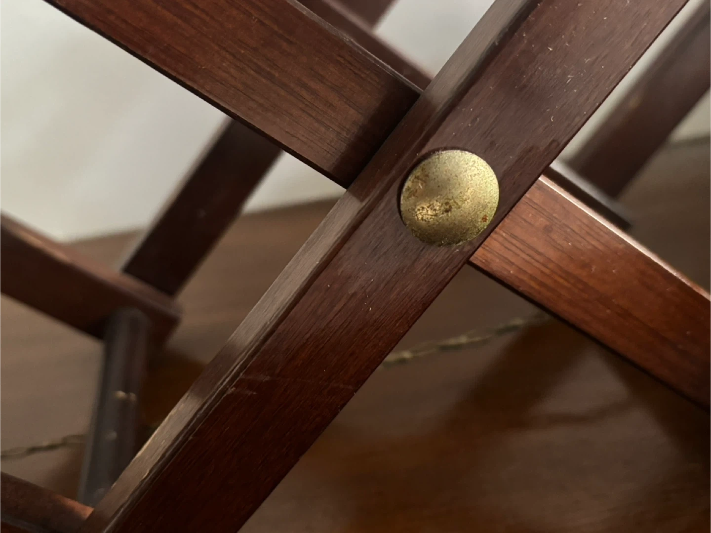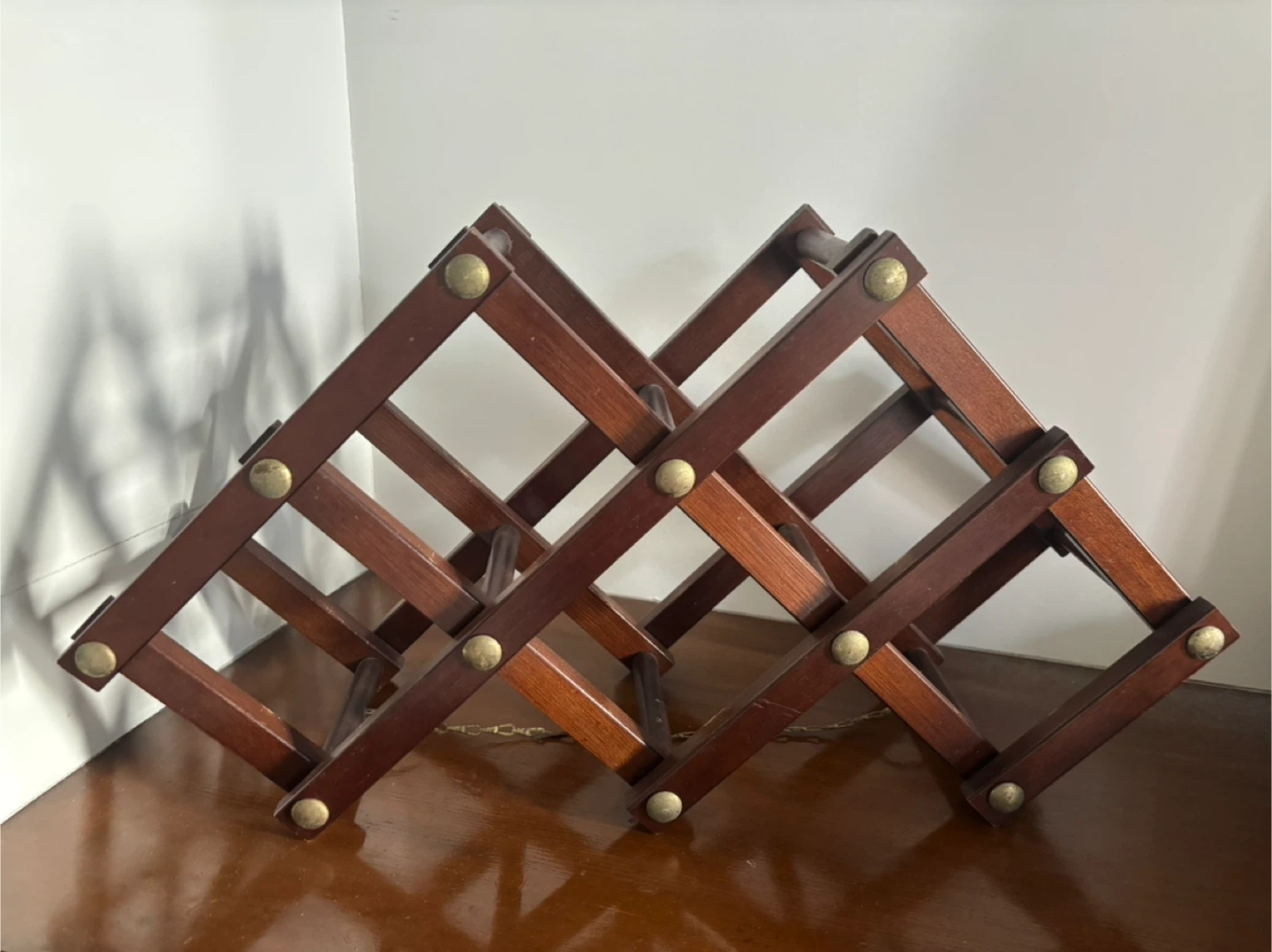 重厚感のあるレトロ(昭和当時もの)な木製折りたたみ式ボトルラックです。 フルボトルワイン6本収納可 金属パーツに画像のようなクスミや錆あり。 ウッドパーツに画像のような傷などあり。 折りたたみ式でありながらもしっかりとした作りでボトルを置いた時のグラつきなどありません。  数年前まで自宅で活躍してました。 飾って置くほどワインを購入しなくなったため出品します。