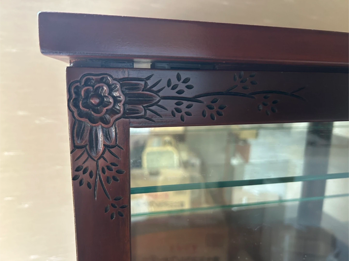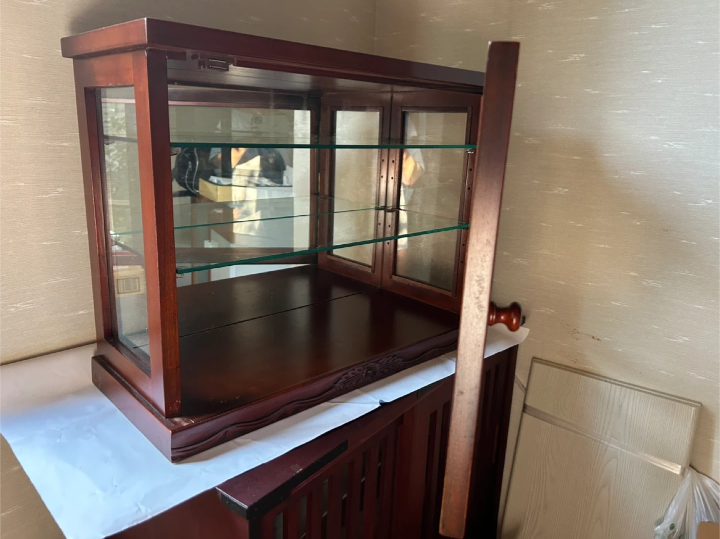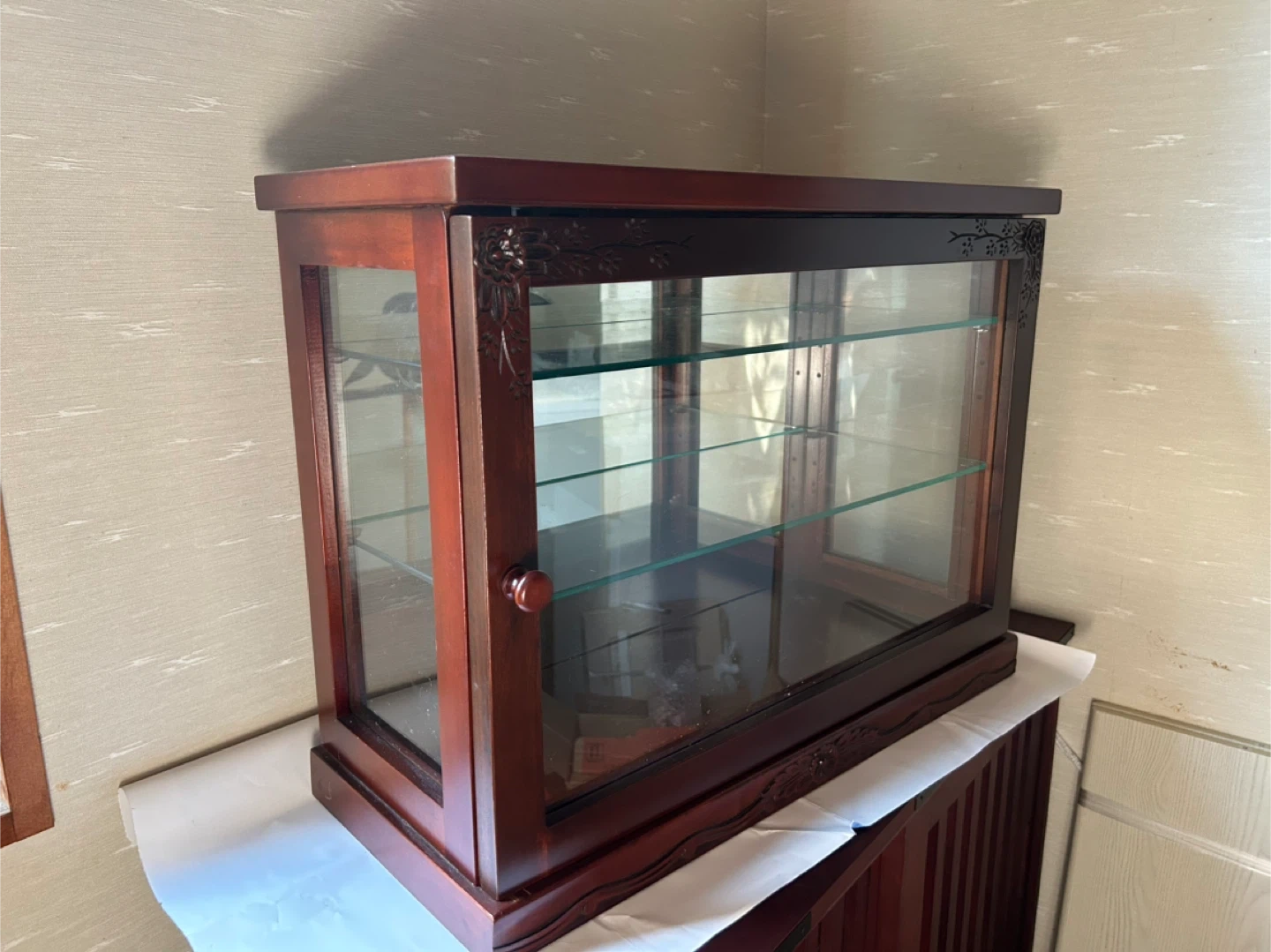木製のガラスケースです ・色:茶色 ・ガラス棚板2枚 ・装飾あり 花柄の彫りが可愛いガラスケースです 中のガラス板2枚は高さ調整可能 背は鏡になっています 外寸横60cm高さ45cm奥行25cm 内寸横54cm高さ39cm奥行21cm 自宅まで取りに来ていただける方 自宅保管の中古品である旨ご了承いただき ご検討よろしくお願いします ※代理出品です