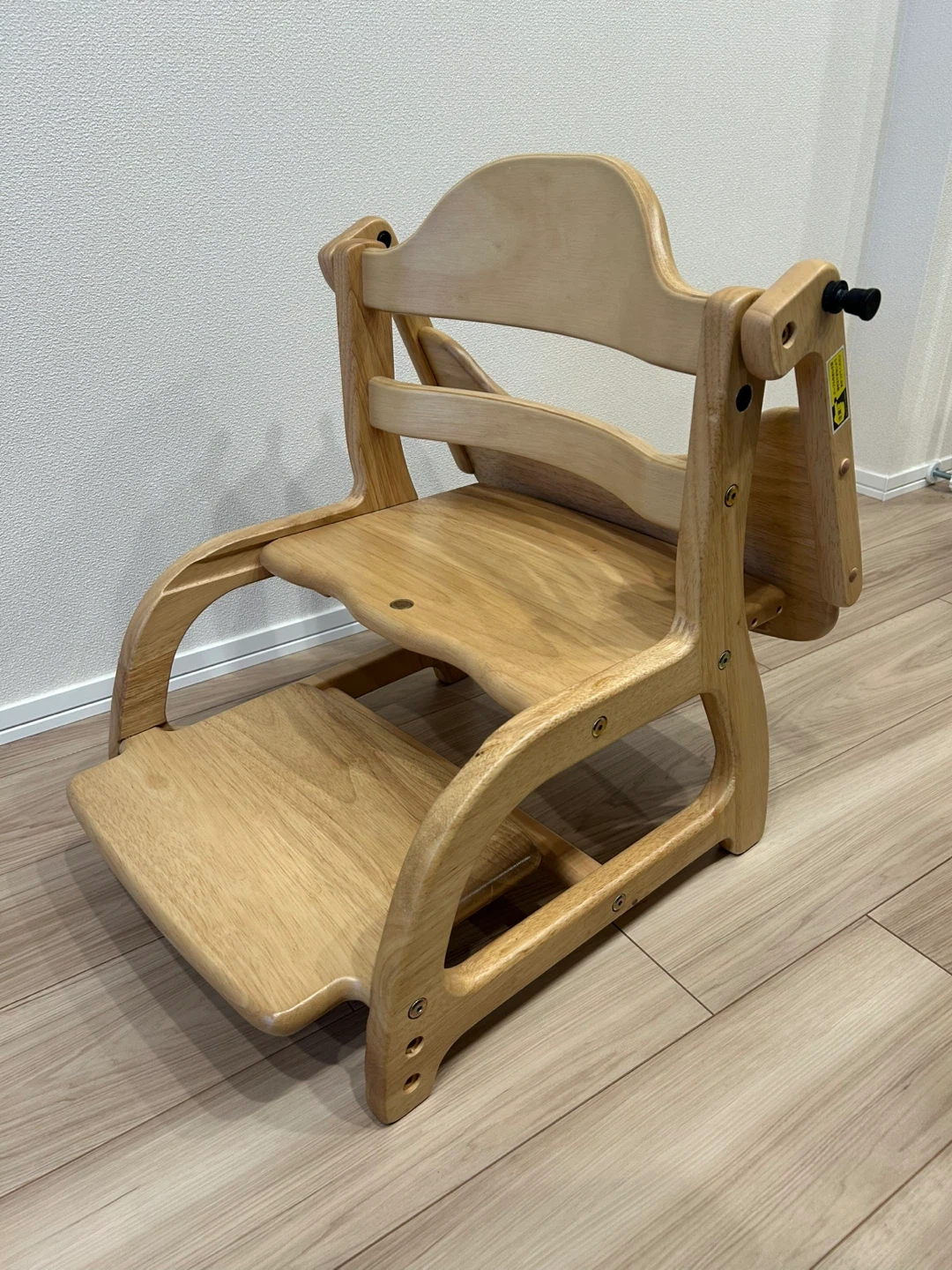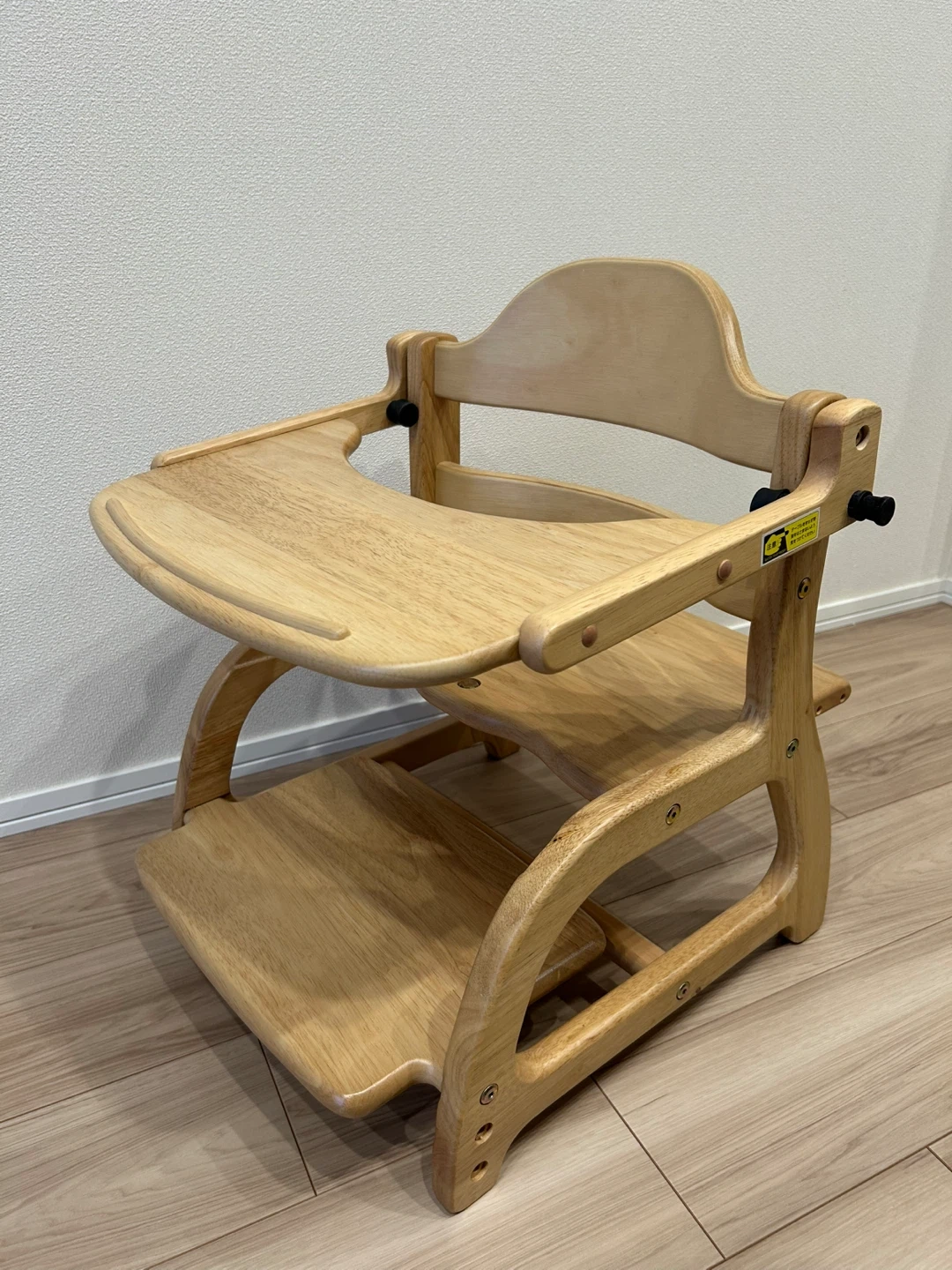 木製のベビーローチェアです。 机部分は後ろに回すことができます。(写真2枚目)取り外しも可能です。 写真にはありませんが、股部分のガードもございます。 中古品であることをご了承ください。 破損はありません。 メーカー:大和屋 商品名:すくすくローチェアⅡ 色:ナチュラル 対象年齢:腰が据わった7か月~5才頃(目安) 重量:約6kg ダイニングテーブル購入に伴い、ローチェアを使用しなくなりました。子どもが毎日離乳食を食べていた思い出があり、捨てるのは寂しかったので誰かに使ってほしく出品しました。 ただのエゴですが、大切に使っていだけると嬉しいです。