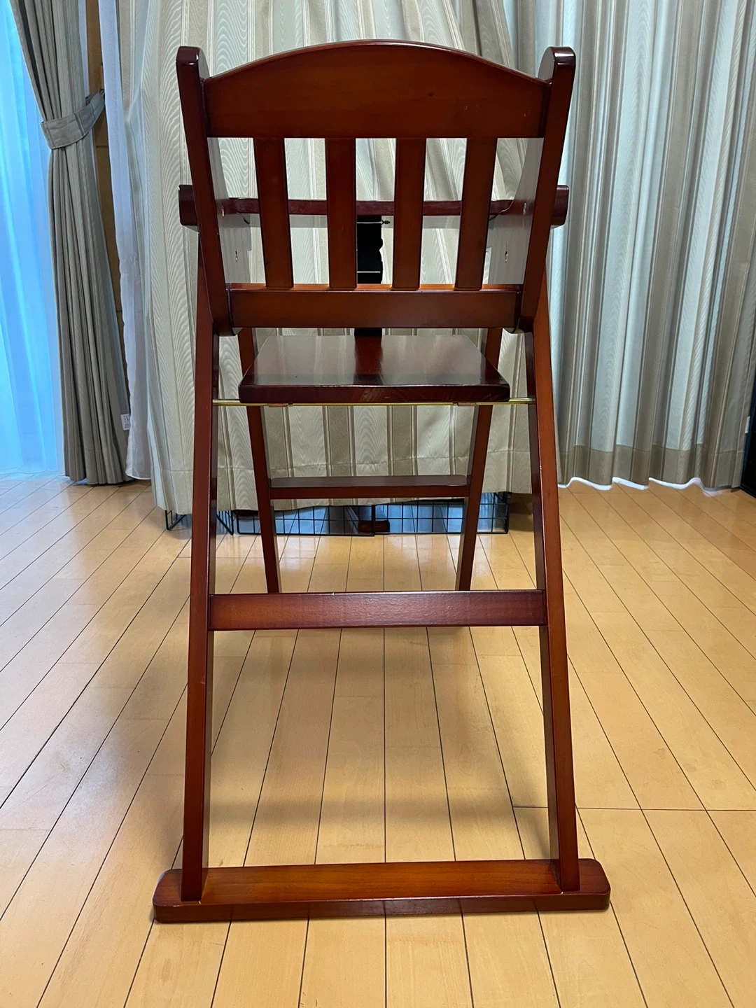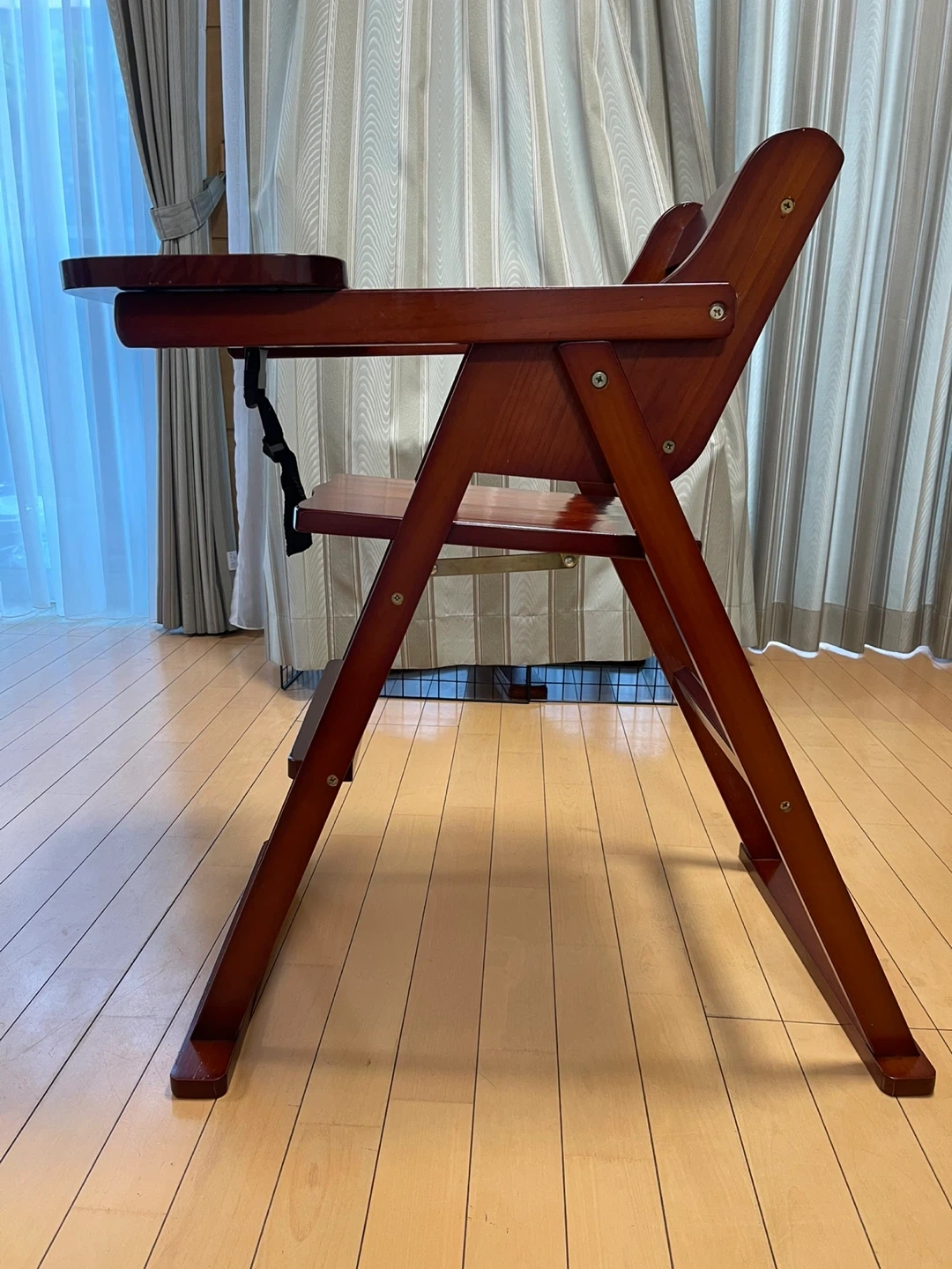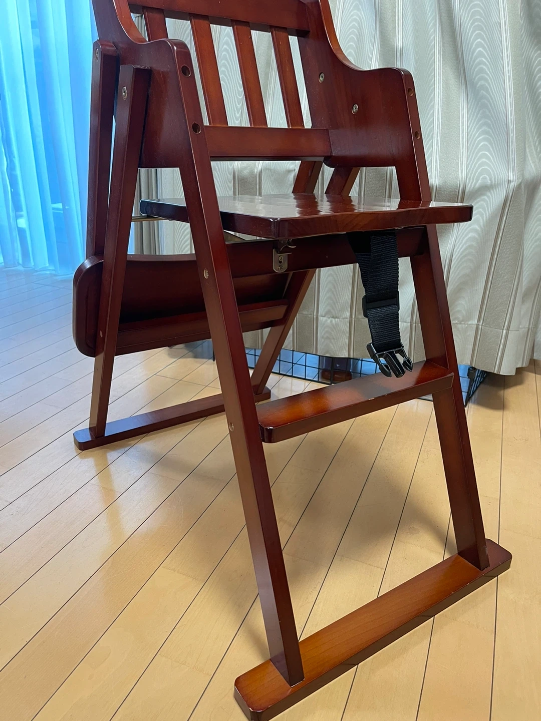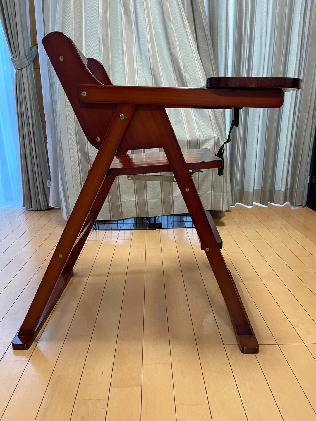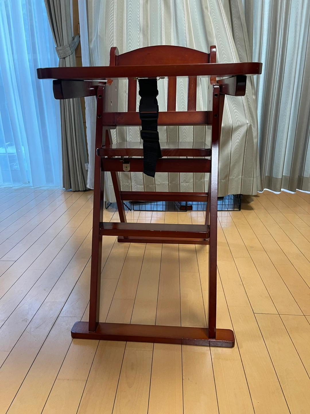 木製のベビーチェアです。ダークブラウンの色合いで、どんなお部屋にも馴染みやすいデザインです。 折りたたみ式で、使わない時はコンパクトに収納できます。 テーブルは取り外すこともできます。 使用しない時は、後ろへ回しておくこともできます 二脚同じものがありますのて、こちらを出品致します。 【商品の状態】新品未使用 サイズ:座面高さ50cm 横幅40cm よろしくお願いいたします。 ・色:ブラウン ・折りたたみ可能 ・ベルト付き 中古品であることをご了承ください。