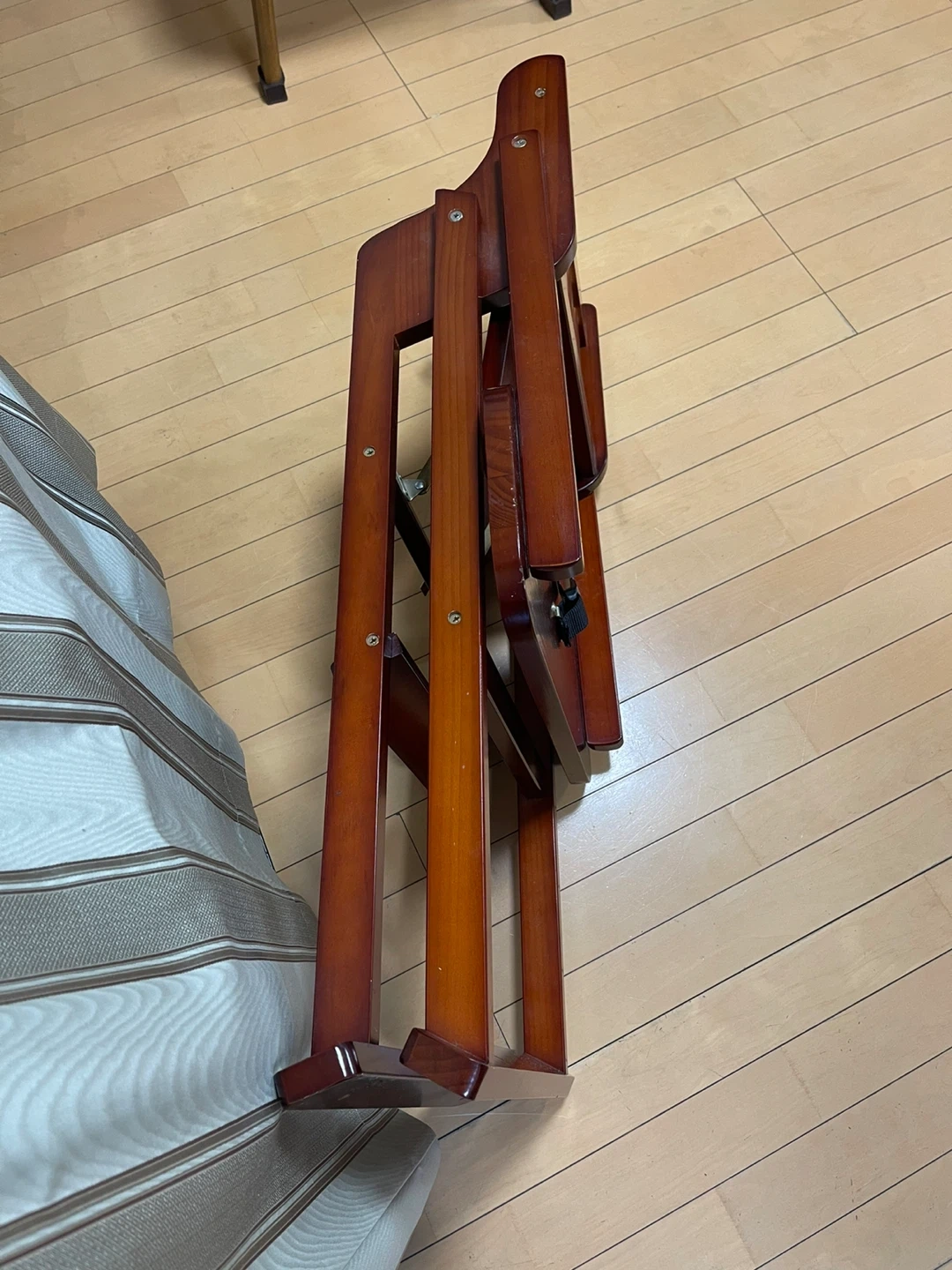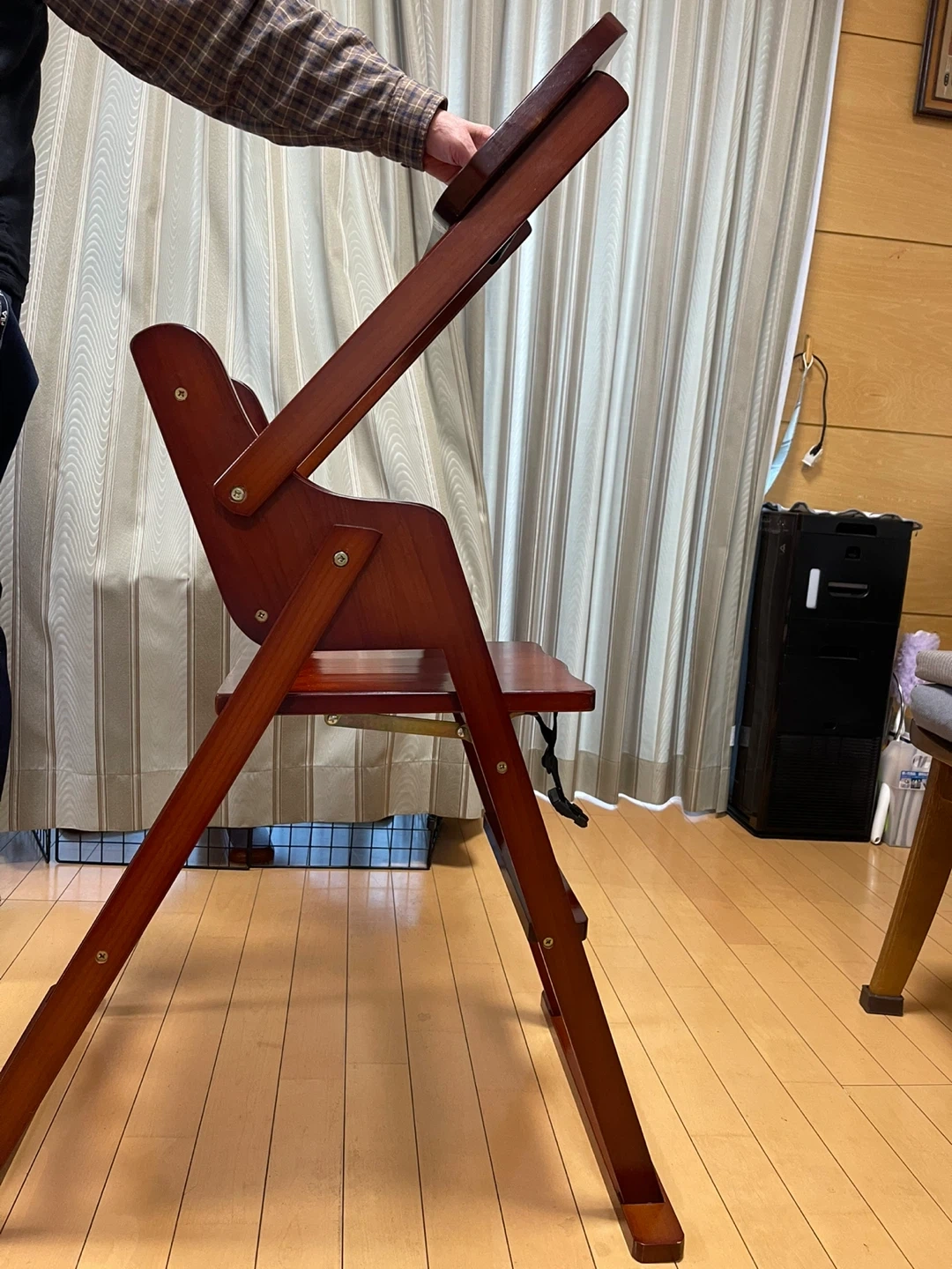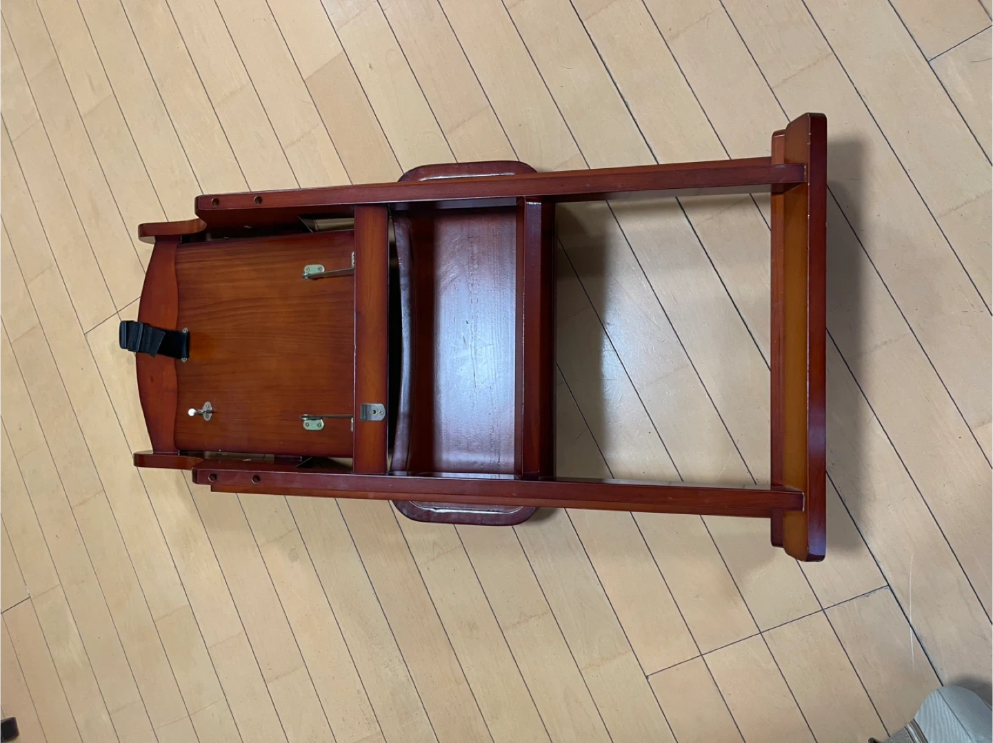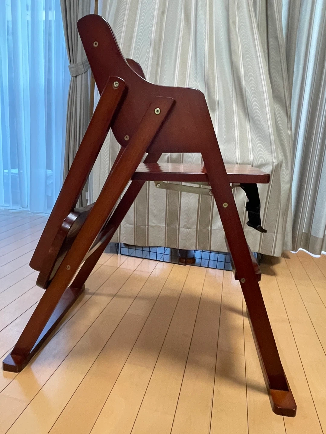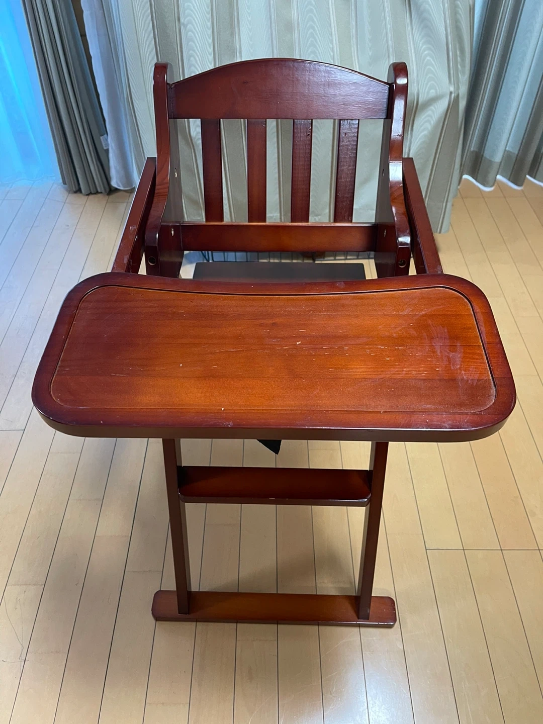 木製のベビーチェアです。ダークブラウンの色合いで、どんなお部屋にも馴染みやすいデザインです。 折りたたみ式で、使わない時はコンパクトに収納できます。 テーブルは取り外すこともできます。 使用しない時は、後ろへ回しておくこともできます 二脚同じものがありますのて、こちらを出品致します。 【商品の状態】新品未使用 サイズ:座面高さ50cm 横幅40cm よろしくお願いいたします。 ・色:ブラウン ・折りたたみ可能 ・ベルト付き 中古品であることをご了承ください。