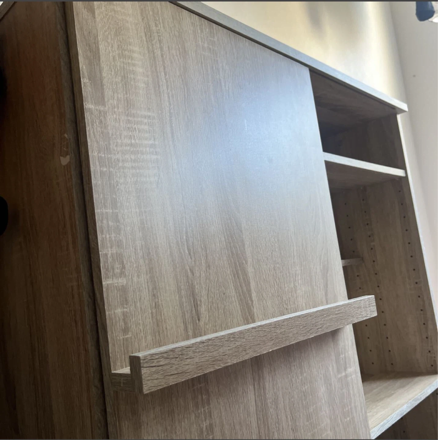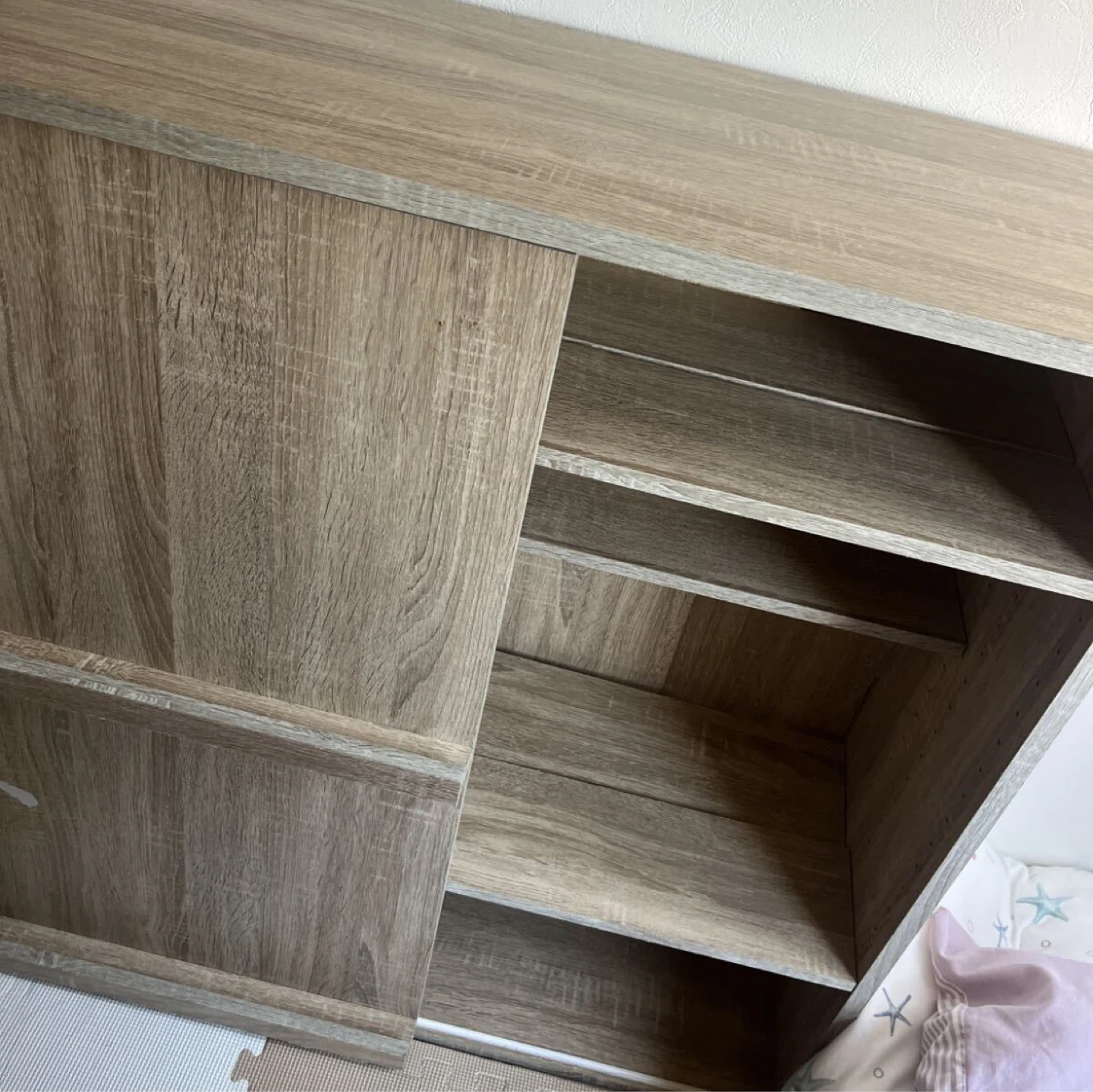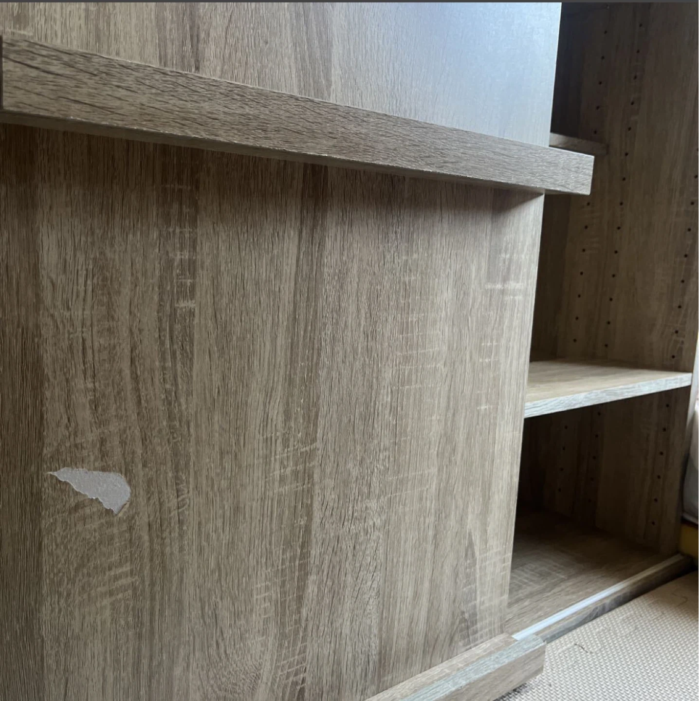 木製の収納棚です。 ・木目調 ・スライド式の扉 ・棚板あり 半年前に友人からもらって、 不要となったため出品します。 本棚やちょっとした書類整理の棚としていかがでしょうか。もちろん食器収納などあらゆる使い方もできます。 サイズ感は隣に映り込んでいる掃除機で比較してくださいませ。 できれば手渡しが嬉しいですが、手渡しでなければ発送とさせていただきます。もし手渡しなら送料はいただきませんが、発送となれば発送をいただきたいです。すみませんがよろしくお願いします。 表面の塗装が剥がれている部分や中身のガタ付いている部分は写真のとおりですが、使用感に問題はなく、気になれば100円ショップのものでDIYしていただければすぐに直るようなものです。