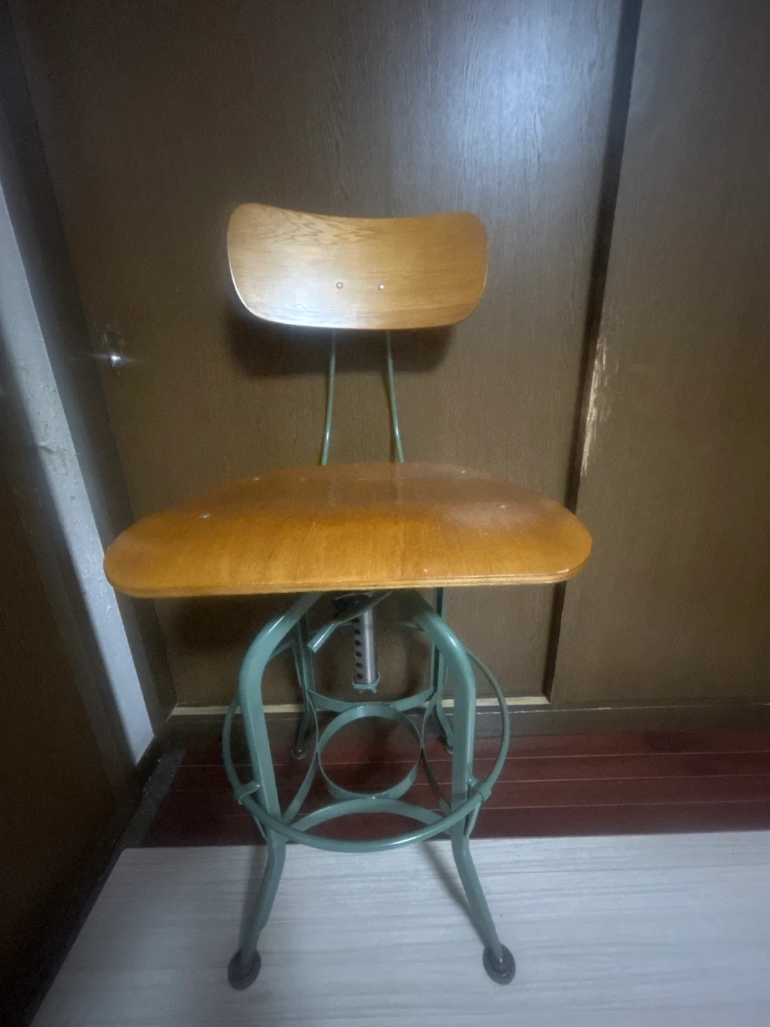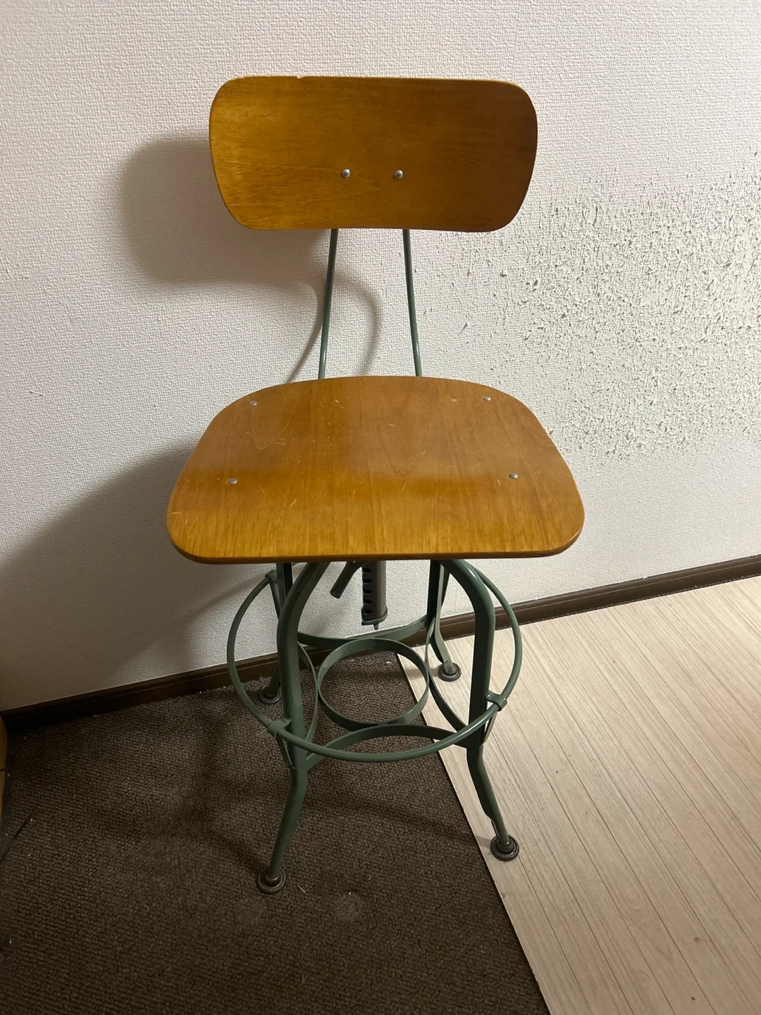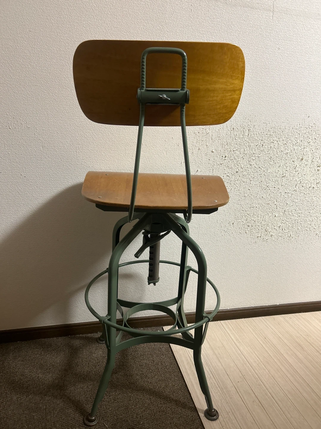 木製の座面と背もたれ、グリーンのスチール脚が可愛い インダストリアル系の高さ調整チェアです。 ・高さ調整レバー付き ・座り心地しっかり ・足掛けリングあり ・安定感のあるスチールフレーム 購入してから時が経ってますが、未使用です。 2脚ありますが、1脚のみの購入可能です。