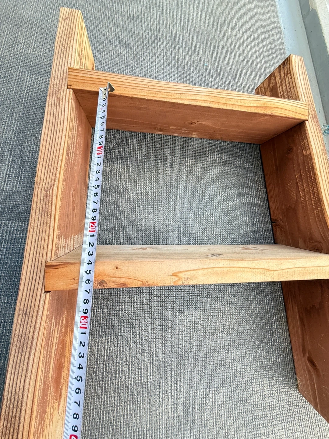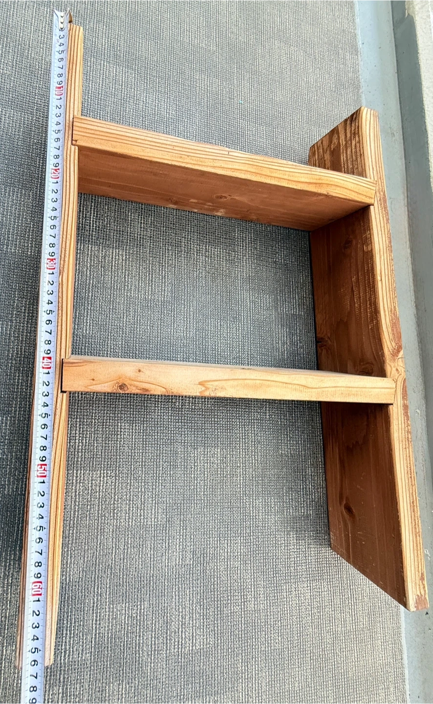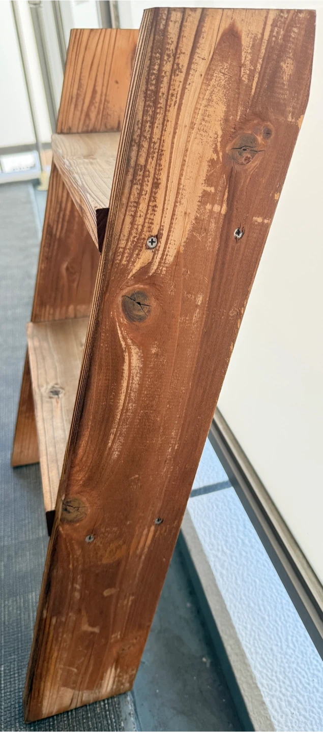 木製の2段ラック(ラダーラック ラダーシェルフ)です。 ベランダ等屋外で花台として使用していたので、全体的に使用感、汚れ、キズ、色むらありますが、まだまだお庭先やベランダ等でご使用していただけると思います。 写真一枚目は、購入当初のものです。 経年劣化程度は、他の写真を参考にしてください。 写真に写っている小物花等は販売に含まれません。 商品説明 壁に立てかけて使用する、はしご型の飾り棚です。 自立はしません。 サイズは、画像参考にしてください。 2段サイズ 組み立て不要の完成品 色 ミディアムブラウン 中古品などは、人により主観が違いますので、紹介文をよくお読みいただき、返品、購入後のクレーム等には対応出来ないことをご理解の上でご購入下さい。 神経質な方、完璧を求められる方、中古品、美品でも一度人の手に渡っているものだと言う事をご理解頂けない方のご購入は、トラブル防止のためお控え下さいませ。