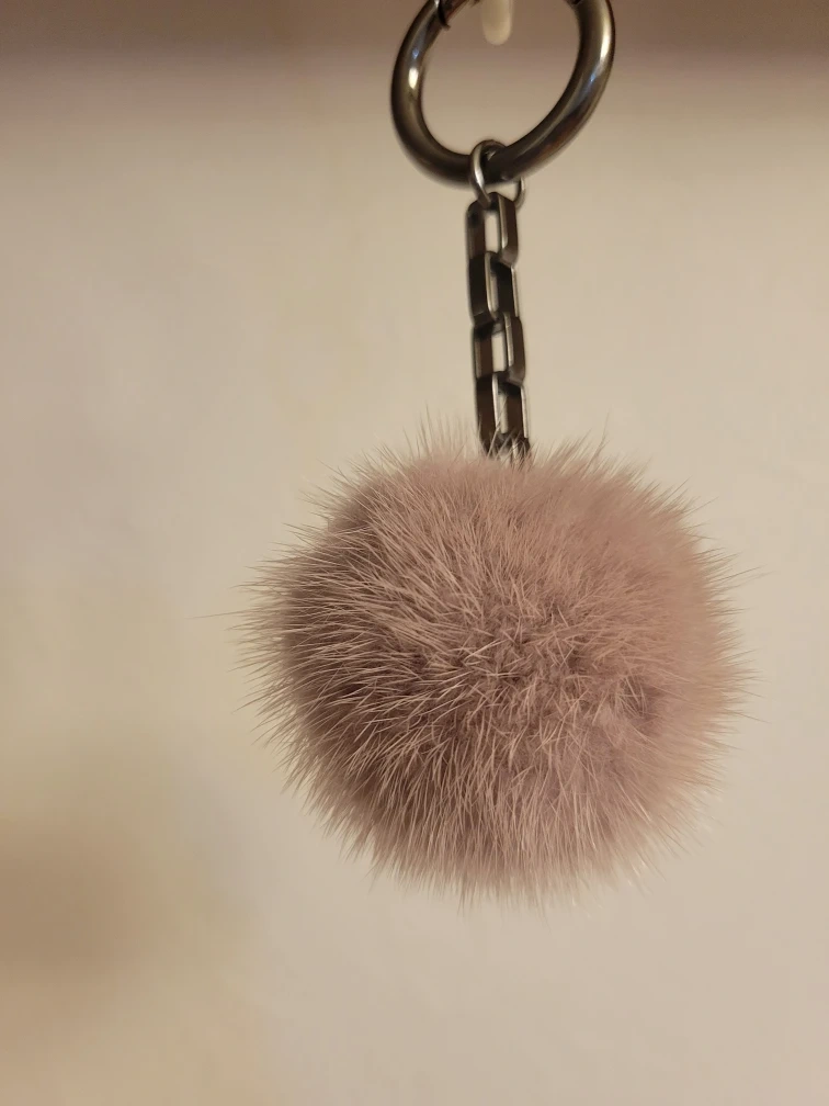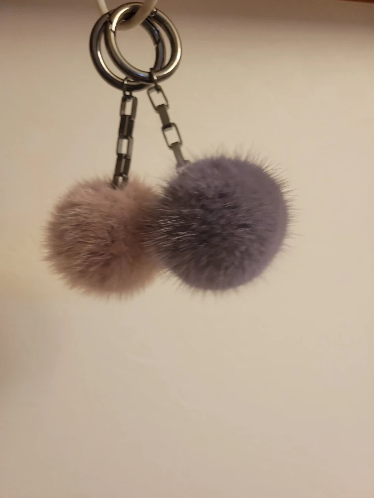 フォックスのファーチャームです。 直径が約6cm、チェーンの長さが 約4cmとなります。 2枚目の写真のように、別売りのパープルのチャームと一緒に使っても可愛いと思います。